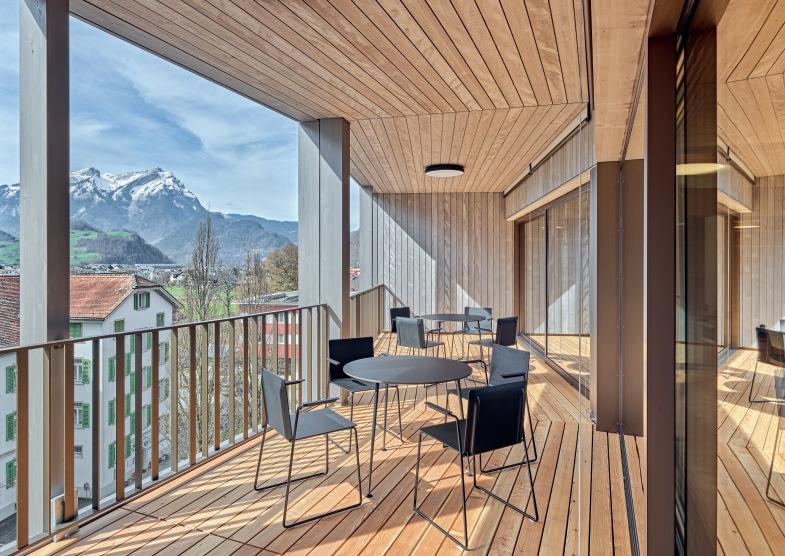 Stockwerke und schaffen so eine Verbindung zwischen den Geschossen. Insgesamt entsteht so ein in sich ruhendes und trotzdem differenziertes Äusseres. Während die Geschossriegel die Fassadenverkleidung schützen und dauerhaft ausgelegt sind, schützen diese sogenannte ‹Opferbretter›, die auskragend auf den Geschossriegeln liegen. Diese Bretter sind austauschbar und können am Ende ihres Lebenszyklus leicht ersetzt werden. Ein chemischer Holzschutz wurde nur bei stark beanspruchten Bauteilen eingesetzt. Das Kunst-Projekt ‹Gold› der Künstlerin Lea Achermann unterstützt das Vorhandene und lädt wie die Architektur zum Flanieren ein: Kreise und Ellipsen aus Blattgold, die sich je nach Standpunkt und Betrachtungswinkel wieder zu einem Ganzen formen, lenken den Blick auf die Architektur. Auf einer MetaEbene sollen sie das Erkennen des Wertvollen im Leben an allen möglichen und unmöglichen Orten darstellen. Das Gebäude erfüllt den Minergie-Standard. Die Wärmeerzeugung erfolgt mit einer Grundwasser-Wärmepumpe und über eine Lüftung mit Wärmerückgewinnung. Gekühlt wird durch den aussenliegenden Sonnenschutz, und eine Fotovoltaikanlage auf dem Dach produziert Strom.