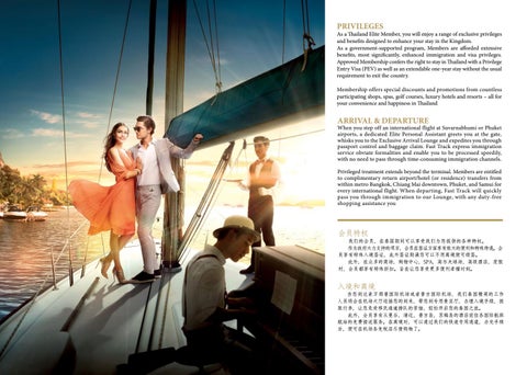 当您到达素万那普国际机场或者普吉国际机场,我们泰国精英的工作 人员将会在机场大厅迎接您的到来,带您到专用贵宾厅,办理入境手续,提 取行李,让您免受移民通道排队的苦恼,轻松开启您的泰国之旅。 此外,会员享有从曼谷,清迈,普吉岛,苏梅岛的酒店前往各国际航班 航站的免费接送服务。在离境时,可以通过我们的快速专用通道,办完手续 后,便可在机场各免税店尽情购物了。