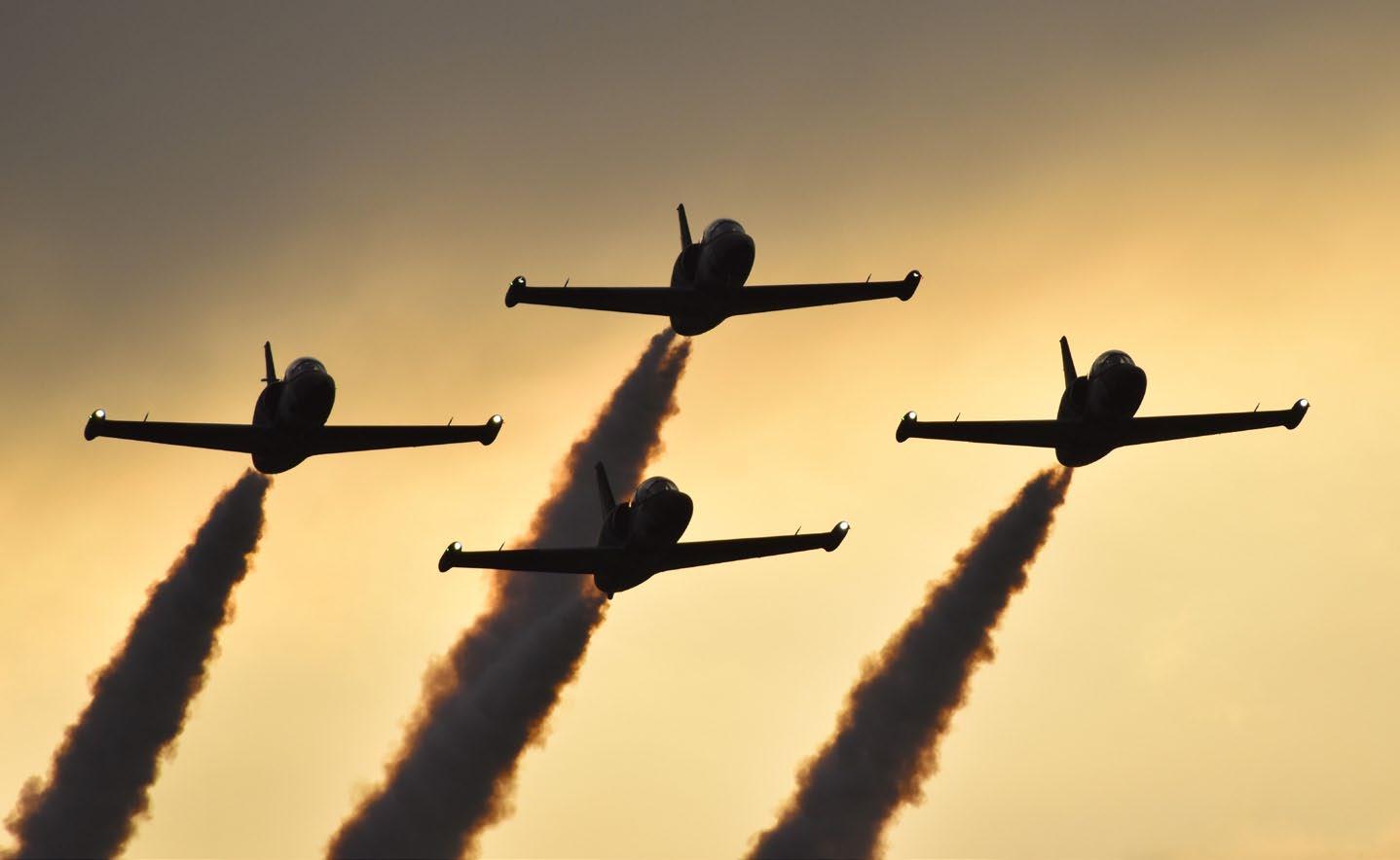 Ghost Squadronin L-39 kvartetti suorittamassa ylilentoa iltalentonäytöksessä.