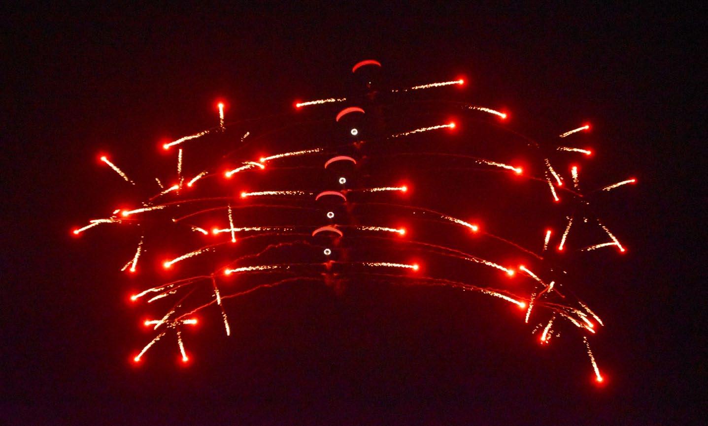 Kahtena iltana lähes 20 minuuttia kestänyt loppushow sisälsi ennennäkemättömän yhdistelmän ilotulitteita, pyrotekniikkaa, lasereita, musiikkia sekä Starlight Aerial Productionsin valaistuilla droneilla luodut vaihtuvat tekstit ja kuviot. Kaiken tuon keskellä lenteli kolme valaistua taitolentokonetta, jotka nekin ampuivat ilotulitteita. Kuva: Sun`n Fun.