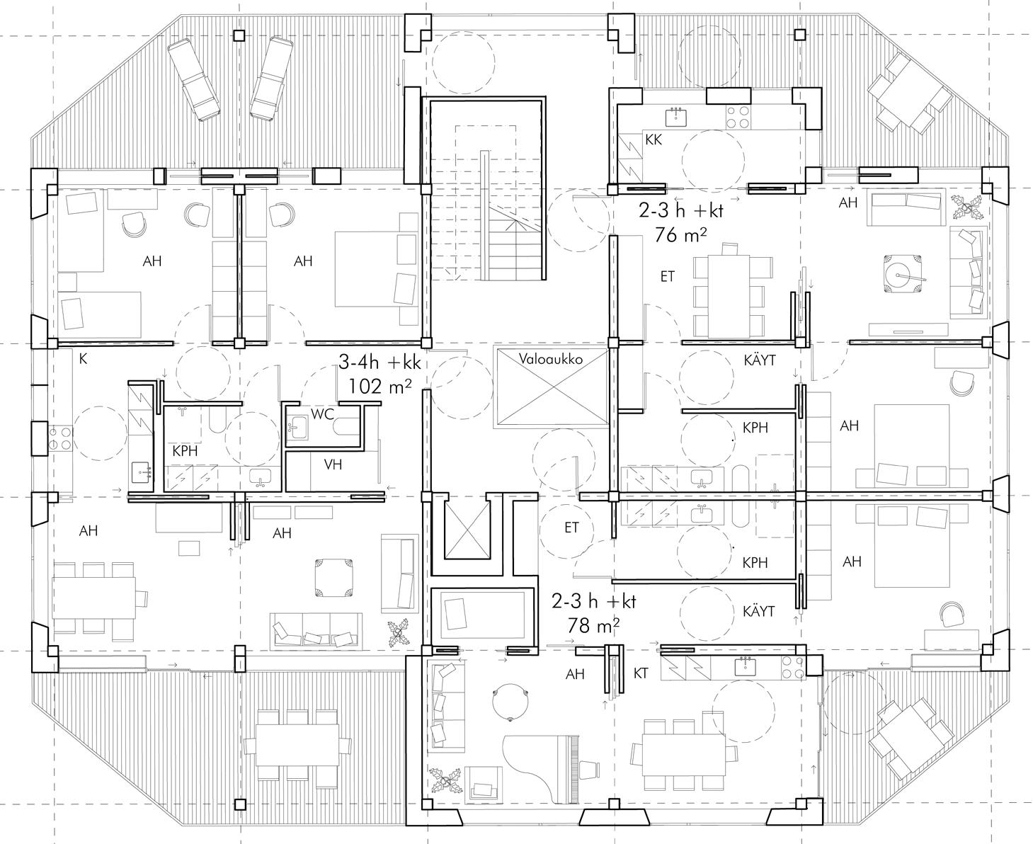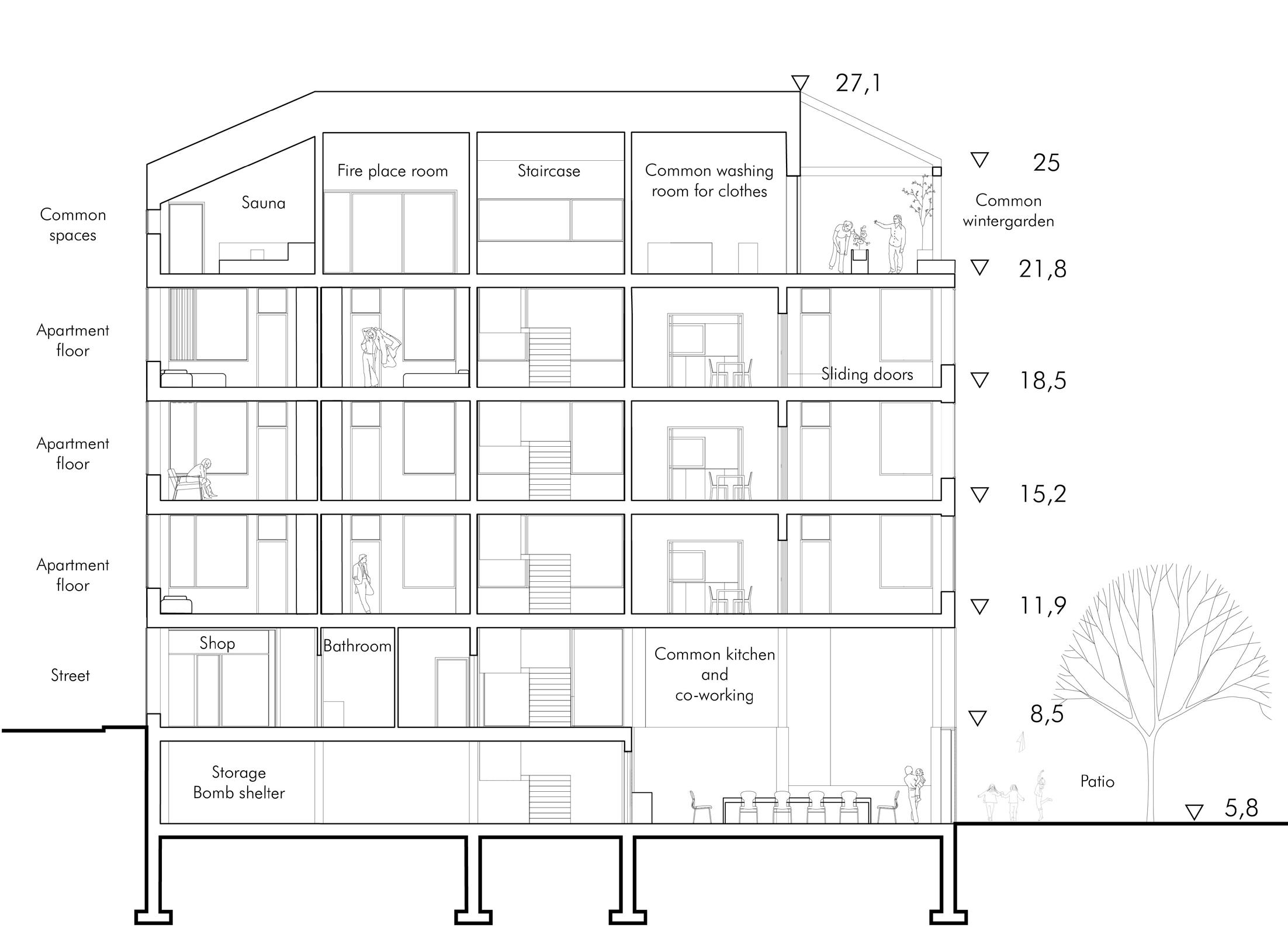 As a part of my master’s thesis work, I designed an apartment building with multifunctional dwellings for small housing communities. The design principles are derived from the literature on multifunctional housing, from which examples of how multifunctional housing can be implemented are taken. The ability of housing to respond to changing housing needs is called adaptability. Adaptability can answer to the problems of housing usability, which is part of the current debate on housing design. A lack of adaptability can prematurely end the life cycle of a dwelling, even if the building is technically sustainable.