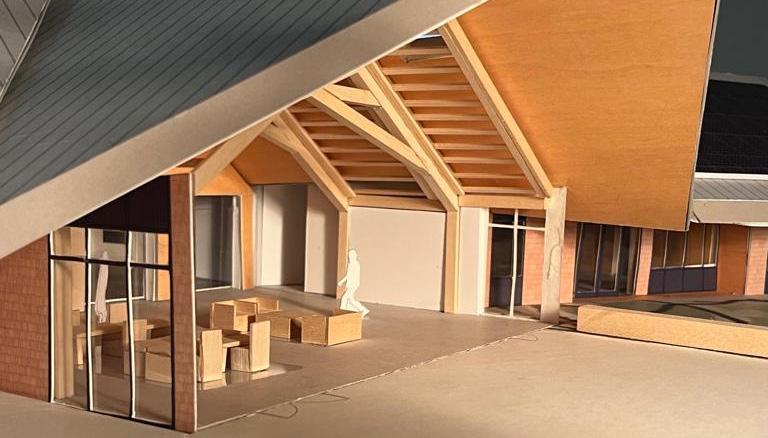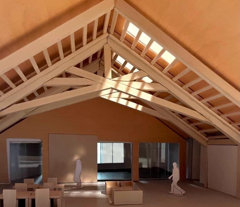 This model came to the 3-D studio as part of a final effort to convince a client to move forward with the project. This project is a climate change research facility consisting of a central forum and two adjacent wings. We started the design process with three roof models, eventually selecting the option of three consecutive pitched roofs. Following this decision, we constructed the larger scale model, as pictured above, highlighting structural detailing as well as general materiality and form of the building.
