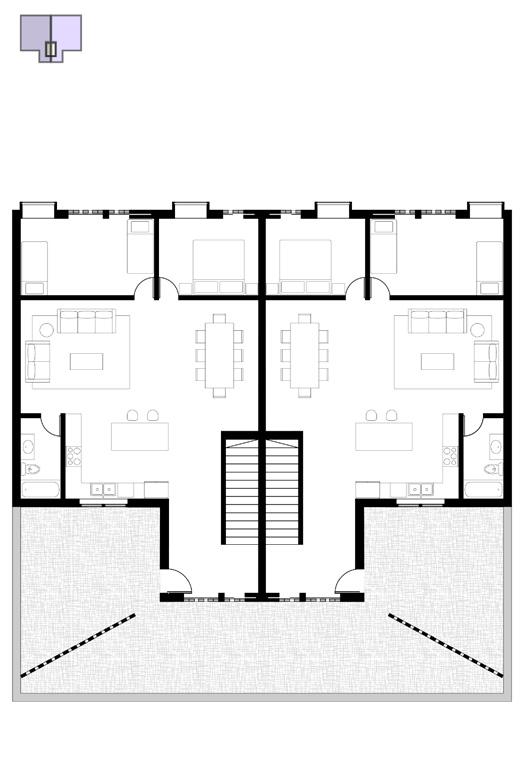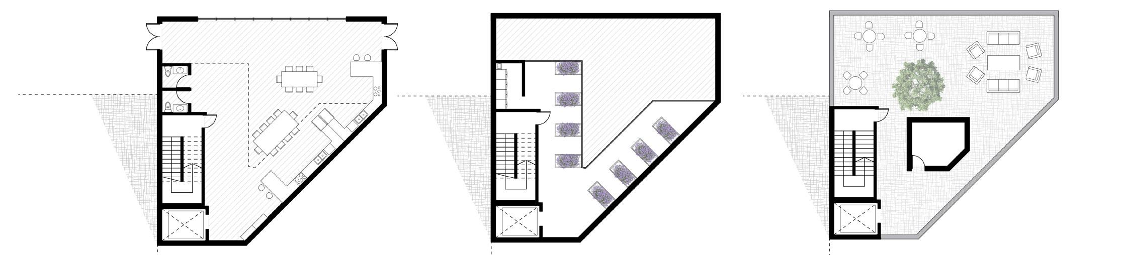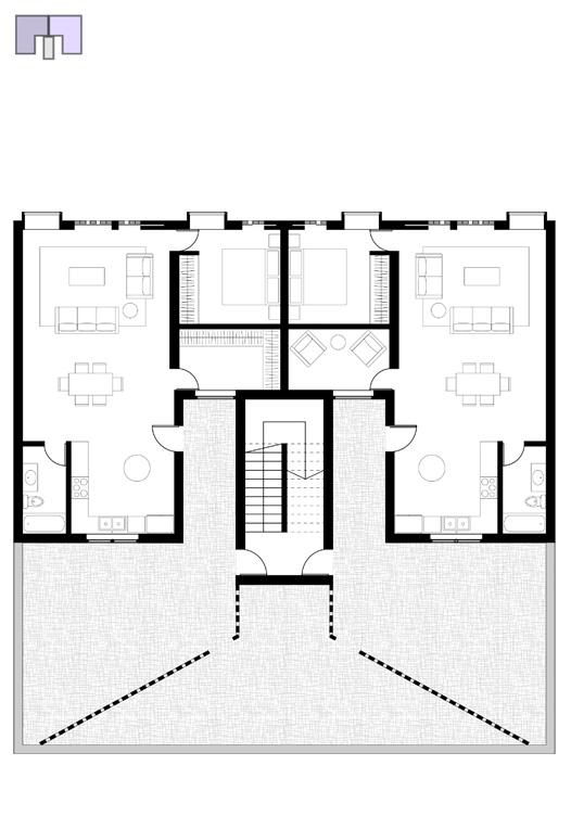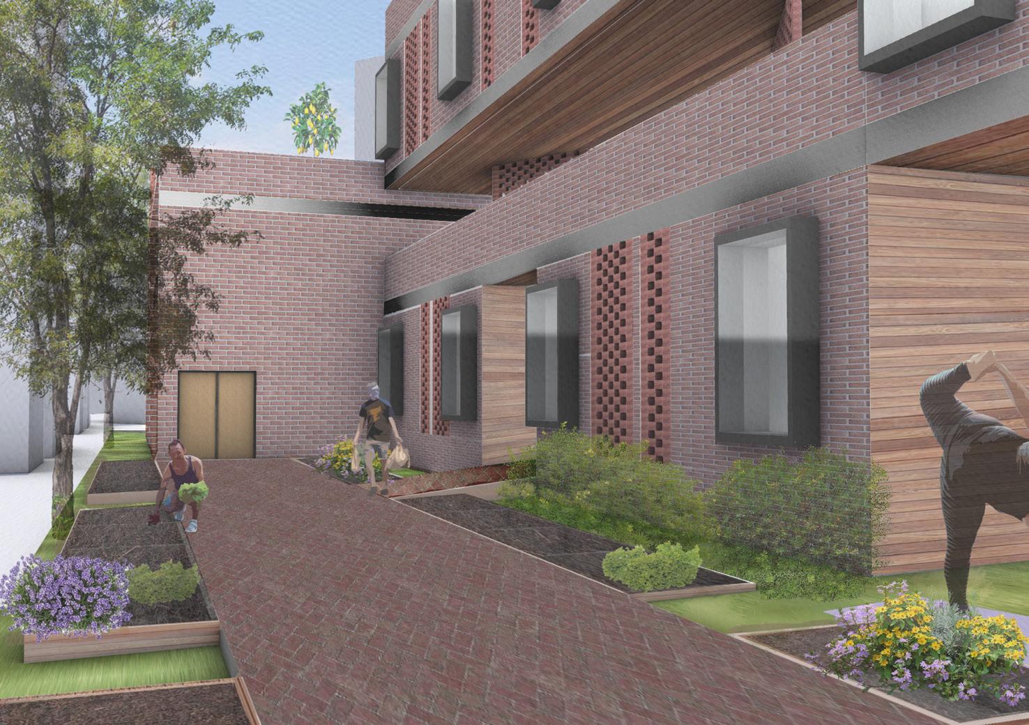 As shown above, there is a central walkway that aims to create a sense of shared space. Along the public walkway are individual garden beds, two per unit. This encourages a sense of agency in the community through gardening options. In the community center that is shown in the floor plans below, there are kitchen and gathering spaces that can be used for personal events, as well as an indoor growing lab that allows for a year-round community garden.