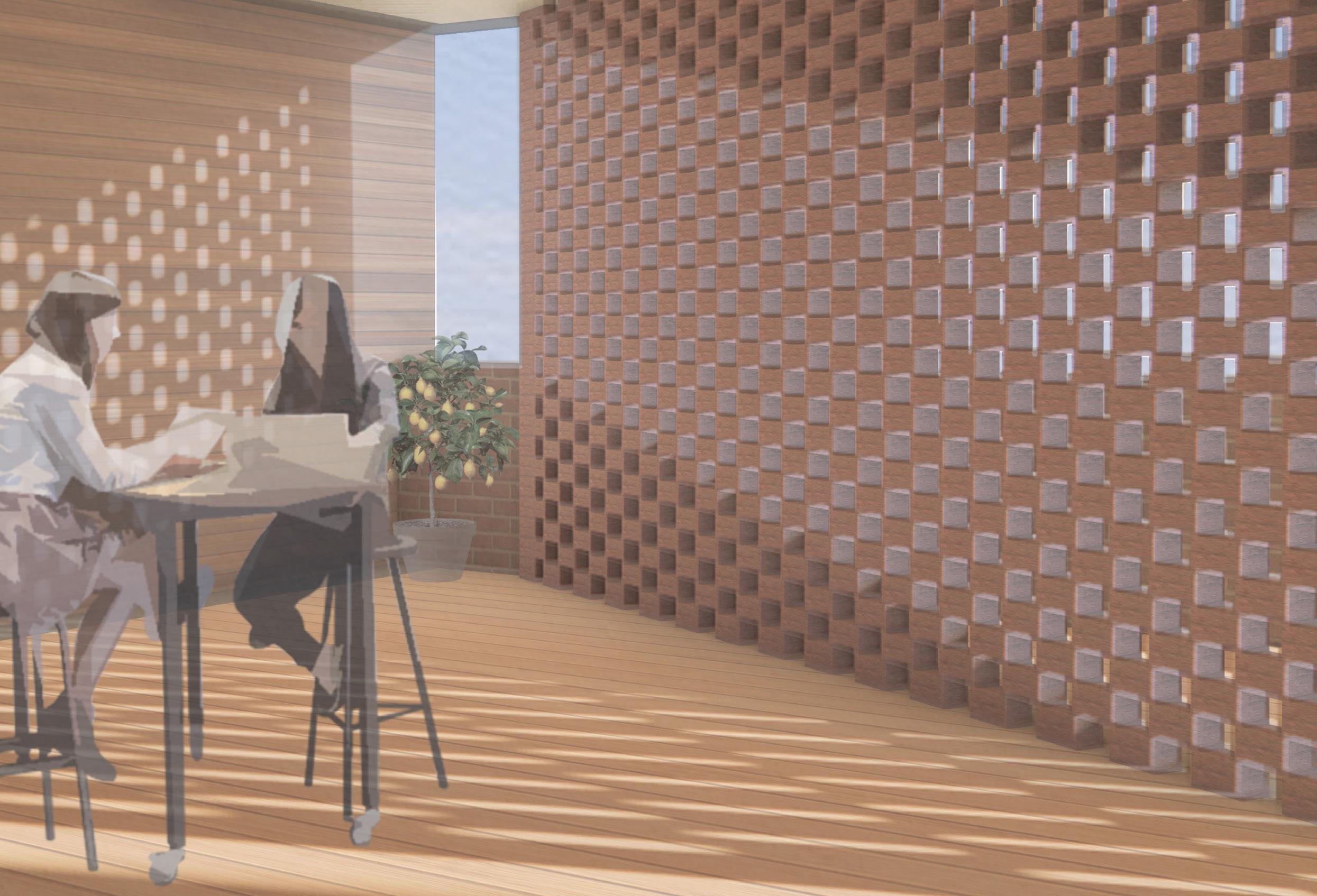 Here, the represented program of the library is the most typical and expected: a series of stacks to shelve the books. Since this program of a library serves as a mode of sharing knowledge and information, it is located at the transitional space between programs for individual reflection and community collaboration. The circulation between the lowest and highest points creates a tension between being alone, yet being involved. The views of the neighboring buildings and sidewalk activity allows the ability to feel connected to the library and its immediate external context.