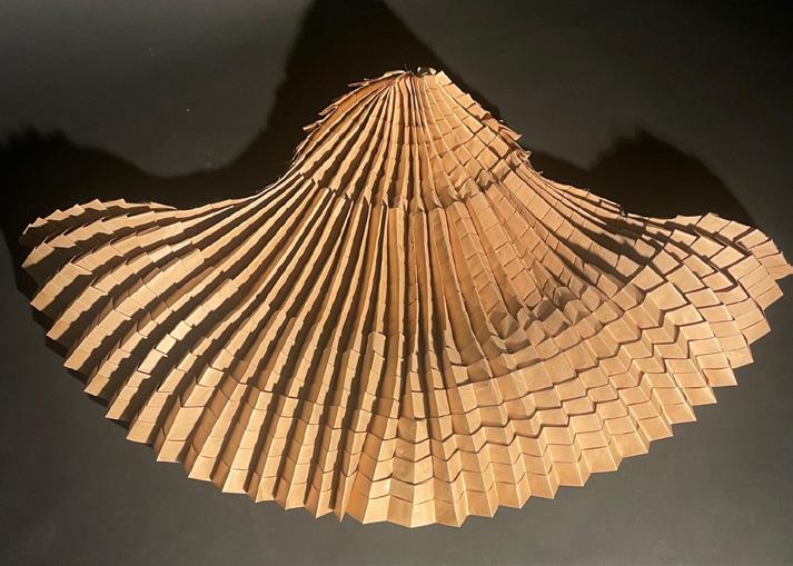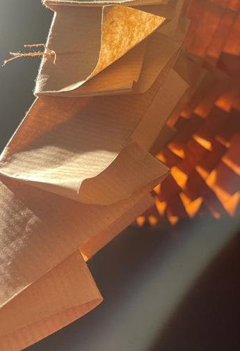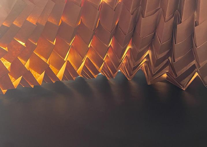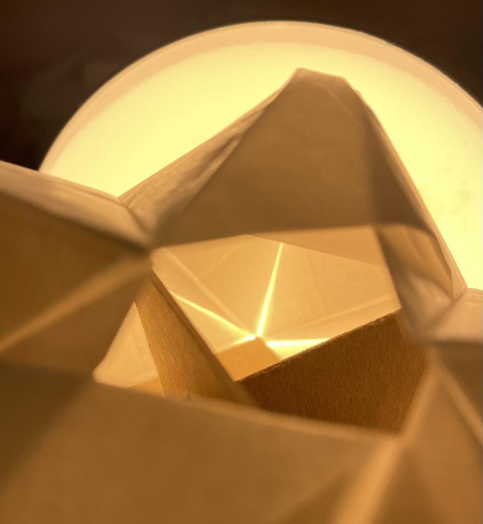 At the scale of the body, the membrane exists in both an open and closed state. In its open state, the user can experience their current environment, able to connect with anything and everything in sight. In its closed state, the membrane serves as a place of retreat. The sounds of the world become softer inside the enclosed membrane. A warm glow through the folded paper replaces the distrac tions of the world. Inside the membrane, one can fully connect with oneself, regardless of where they are.