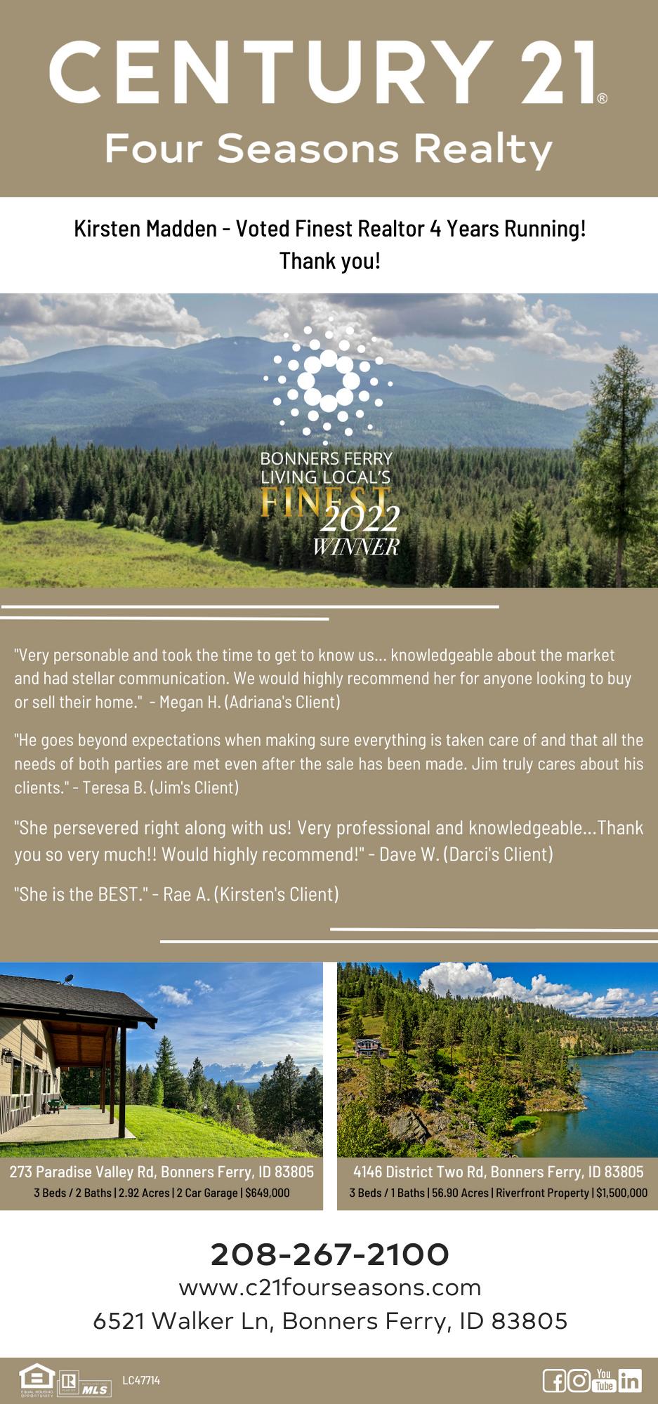 Situated in the Panhandle of North Idaho, we have abundant water, wildlife and recreation. Let us help you realize your dream ... it’s time! CALL US TODAY! 208.267.8575 North Woods Realty CBBonnersFerry.com Main Office: 6606 Lincoln - South Hill Branch Office: 7202 Main Street, Ste. B - Downtown NOW WITH TWO LOCATIONS TO SERVE YOU BETTER: READY TO SELL YOUR PROPERTY? WE’VE GOT BUYERS! MEET OUR TEAM! Locally owned, globally known. License # DB32854 Named #1 Brokerage in Boundary County, both in units sold and total sales volume, for the third year in a row (2019-2021)!! Ready to list? Want results? Then call 208-267-8575 to see SOLD on YOUR home!! Tim