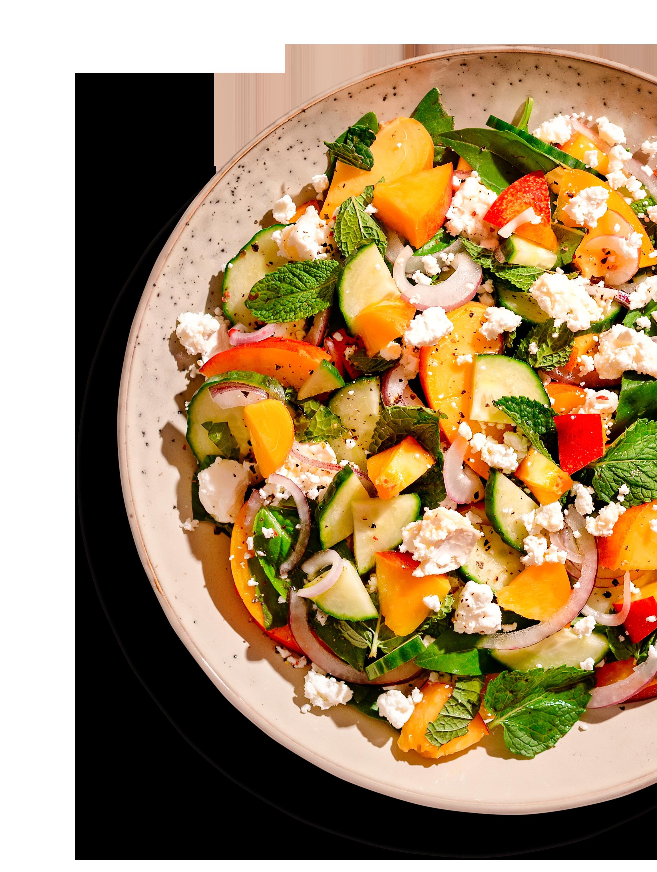 • Combine zucchini, peaches, feta cheese, pine nuts and mint leaves in a large salad bowl.