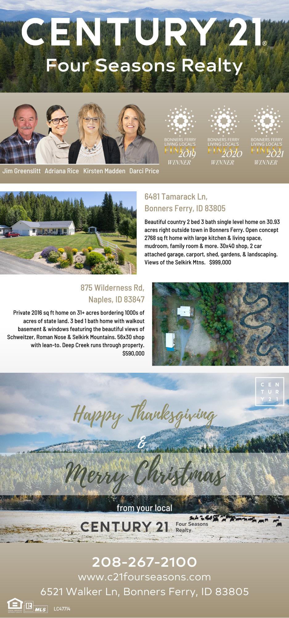 november/december 2022 BONNERS FERRY LIVING LOCAL 67 3963 Gleason McAbee Falls Rd, Priest River Custom Built, Direct Access to River NNA Windham, Sagle 5+ Acres, Neighborhood Beach NNA Mays Rd., Sagle 20 Acres, 2 Build Sites 280 Hardy Loop, Bonners Ferry Timber Frame Cabin under $250K! 1290 Holmes Road, Bonners Ferry 30 Acres, Level with Views 157 N Division, Moyie Springs 4 Bedroom/2 Bathroom, Bonus Room