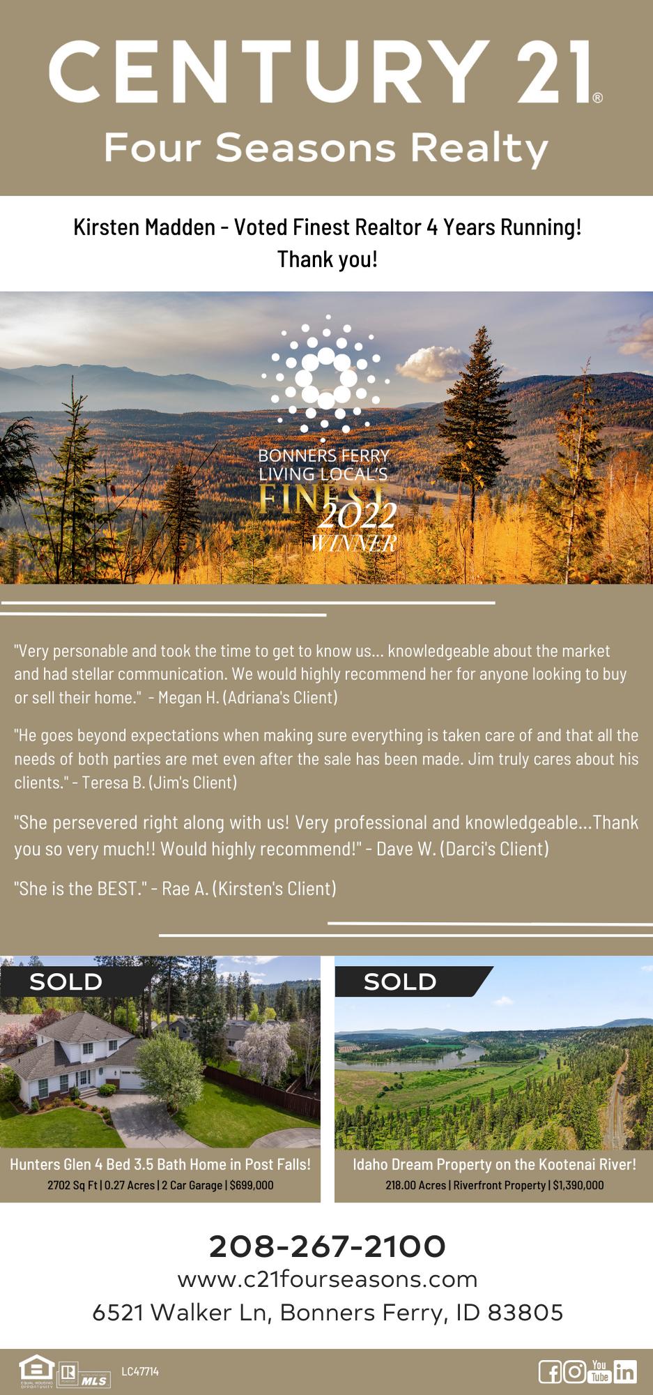Situated in the Panhandle of North Idaho, we have abundant water, wildlife and recreation. Let us help you realize your dream ... it’s time! CALL US TODAY! 208.267.8575 North Woods Realty CBBonnersFerry.com Main Office: 6606 Lincoln - South Hill Branch Office: 7202 Main Street, Ste. B - Downtown NOW WITH TWO LOCATIONS TO SERVE YOU BETTER: READY TO SELL YOUR PROPERTY? WE’VE GOT BUYERS! MEET OUR TEAM! Locally owned, globally known. License # DB32854 Named #1 Brokerage in Boundary County, both in units sold and total sales volume, for the third year in a row (2019-2021)!! Ready to list? Want results? Then call 208-267-8575 to see SOLD on YOUR home!! Tim