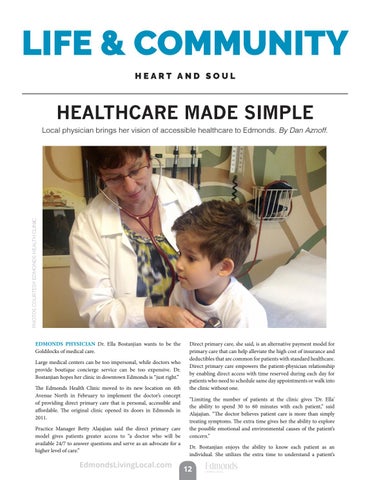 EDMONDS PHYSICIAN Dr. Ella Bostanjian wants to be the Goldilocks of medical care. Large medical centers can be too impersonal, while doctors who provide boutique concierge service can be too expensive. Dr. Bostanjian hopes her clinic in downtown Edmonds is “just right.” The Edmonds Health Clinic moved to its new location on 4th Avenue North in February to implement the doctor’s concept of providing direct primary care that is personal, accessible and affordable. The original clinic opened its doors in Edmonds in 2011. Practice Manager Betty Alajajian said the direct primary care model gives patients greater access to “a doctor who will be available 24/7 to answer questions and serve as an advocate for a higher level of care.”