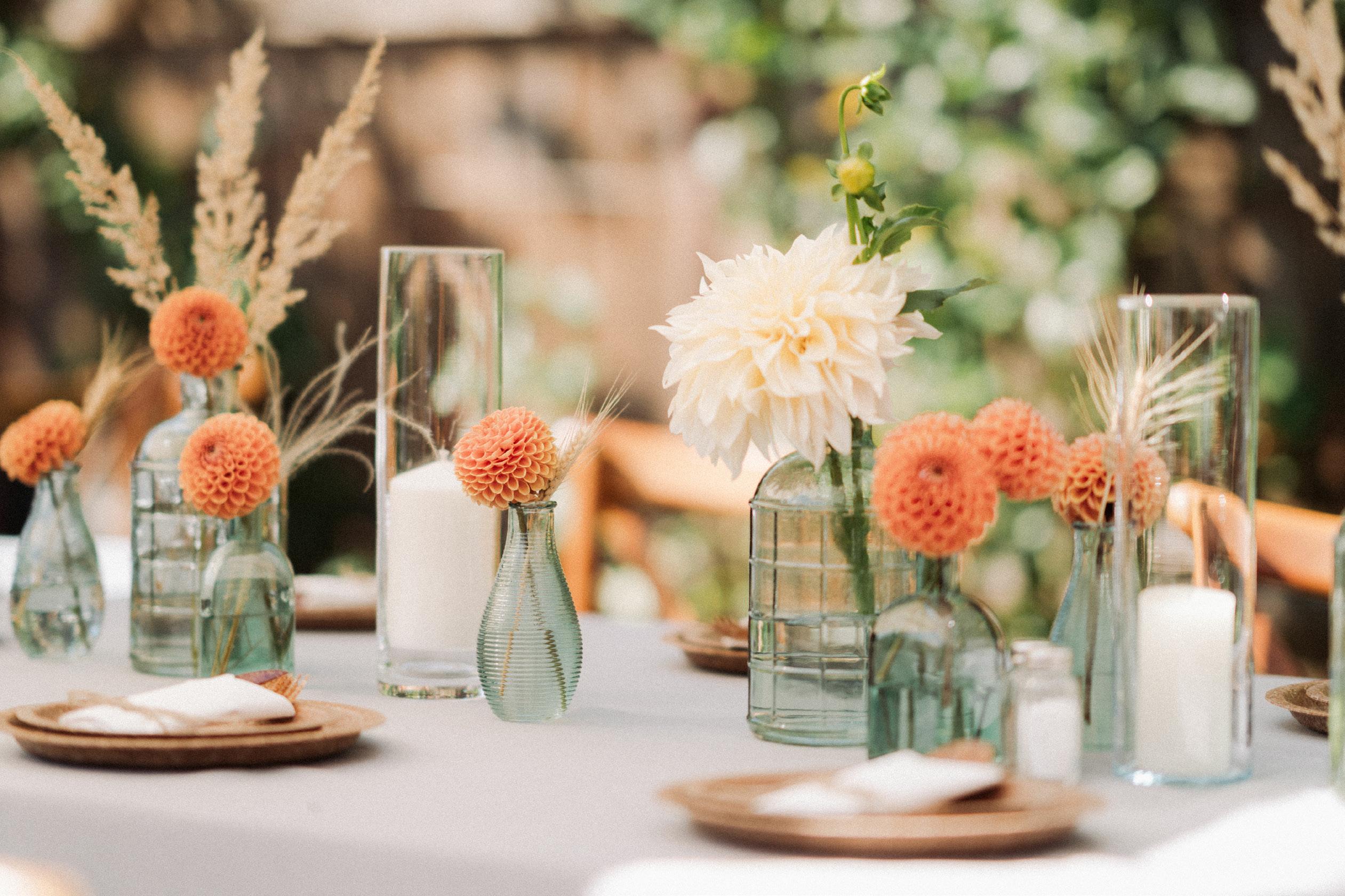 Less is more when deciding on flowers. Choose one overarching flower and allow that to be the common theme in all your arrangements. Flowers such as tulips, roses, hydrangeas, chrysanthemums, calla lilies and dahlias are common vibrant flowers that will really make a statement. This can mean that your bouquet could be one color, and your table arrangements another, while all being unified by the flower.