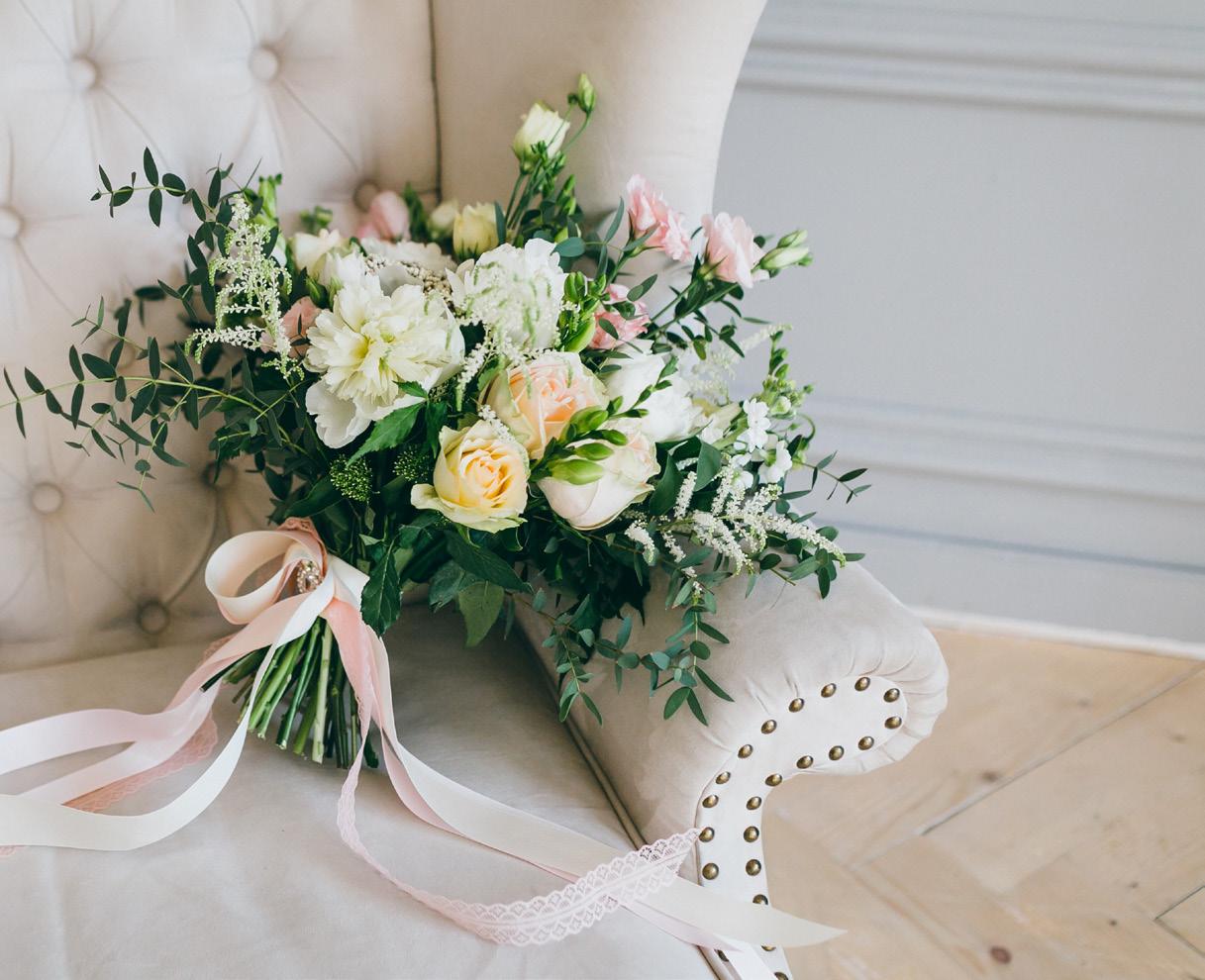 Tying it all together can be done using simple looped grass, swatches of muslin, or wrapped lace or string. Any material can be used to bring the flowers together, as long as it’s tight and holds them closely together. Sloping or disjointed flowers are pretty much the only thing that will ruin the effect. Pins are often put through the underside heads of larger flowers to keep them from drooping, while smaller flower bunches are trimmed of their lower offshoots to allow them to be tightly tied. The last touch is making sure all the stems are cut the same length at the bottom of the bouquet.