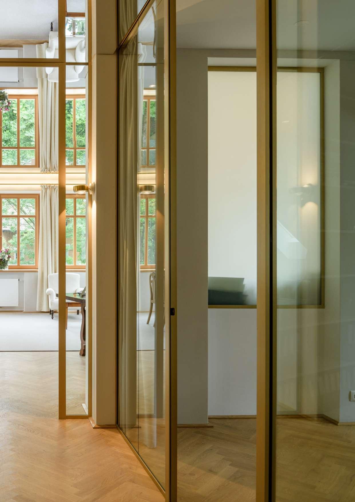 The investor, whom we had the chance to meet, had a clear vision to tune every element to fit the historic setting. The glass partitions were installed in a heritage building, so the frames were given a special surface finish to blend in subtly with the interior.