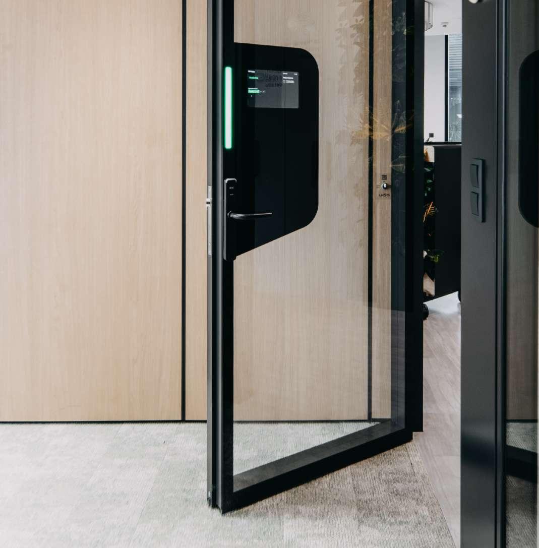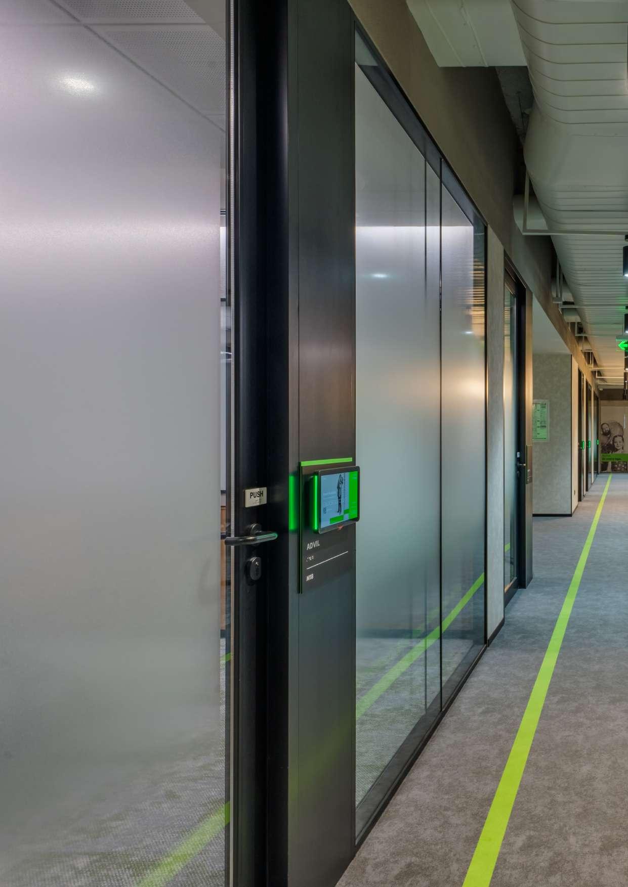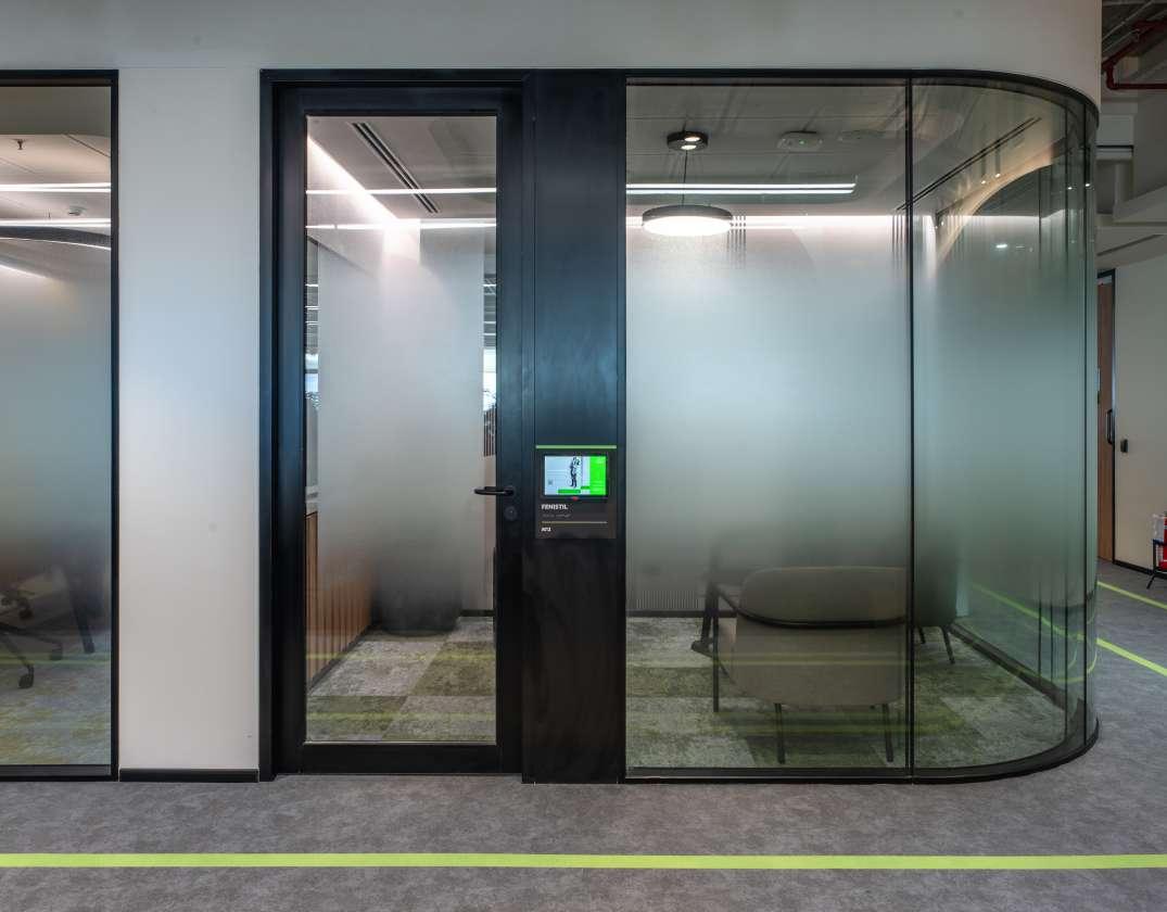 One of the project’s unique technical requirements was integrating a smart lock system for full-glass doors. “We needed to ensure controlled access to selected office spaces, which required specific smart lock solutions.