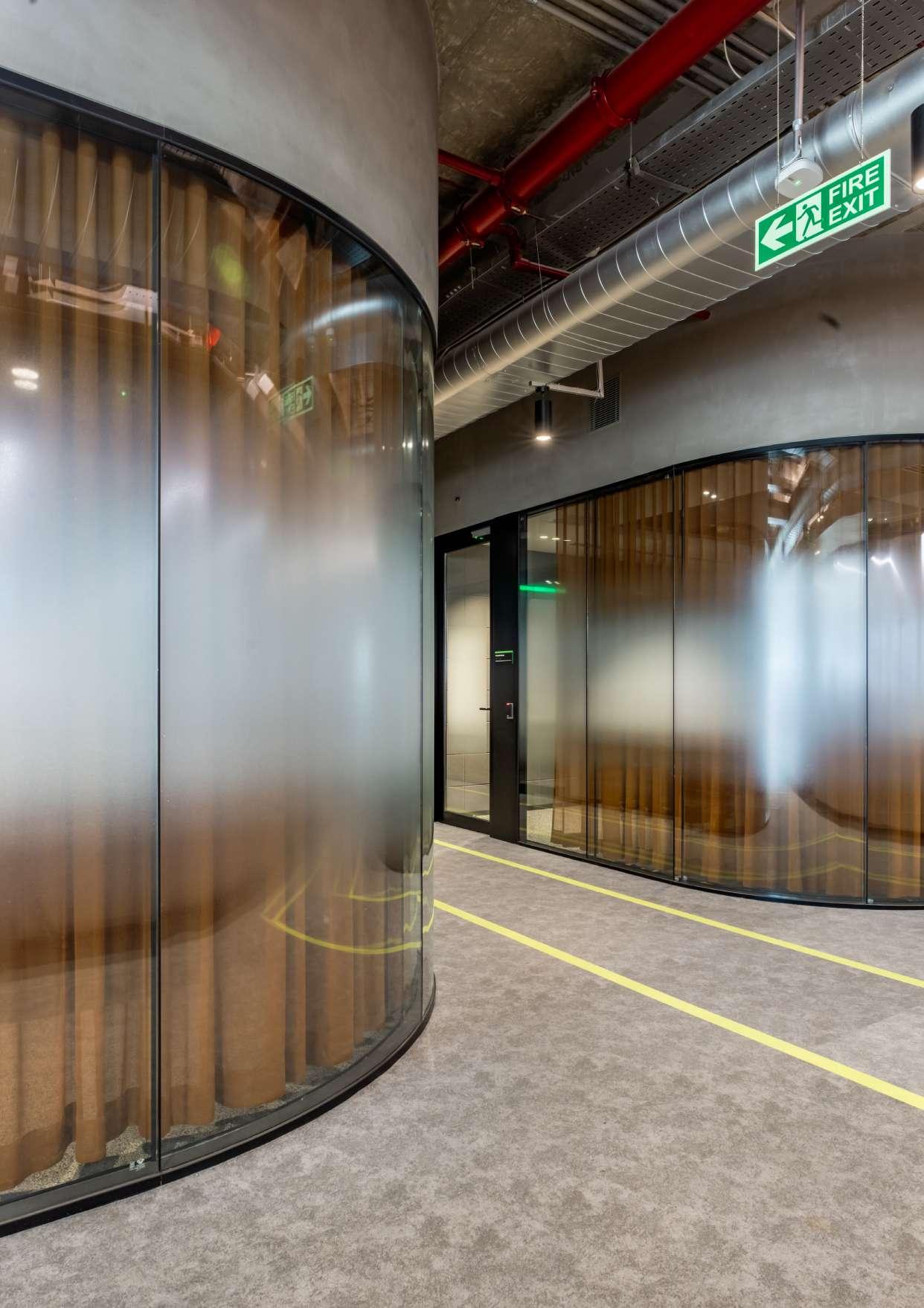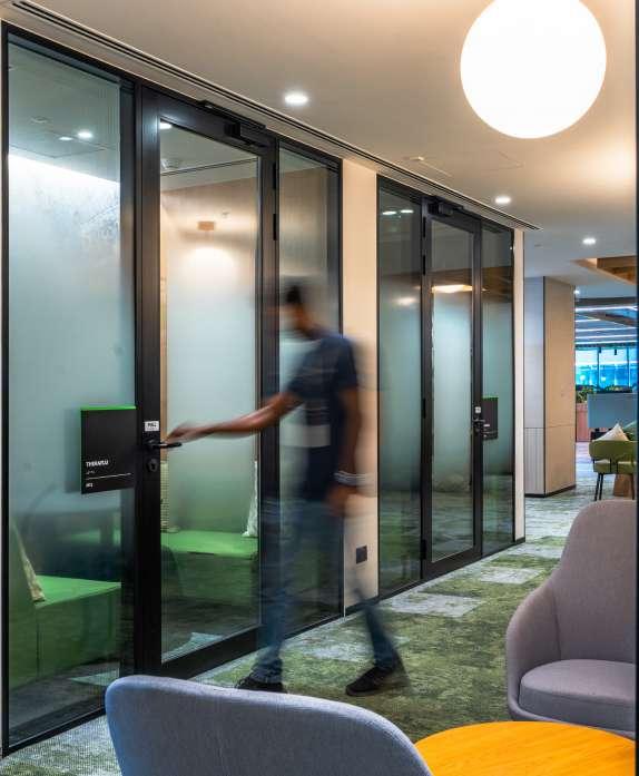 To meet fire safety requirements without sacrificing aesthetics, we also integrated Fira fire-rated partitions.