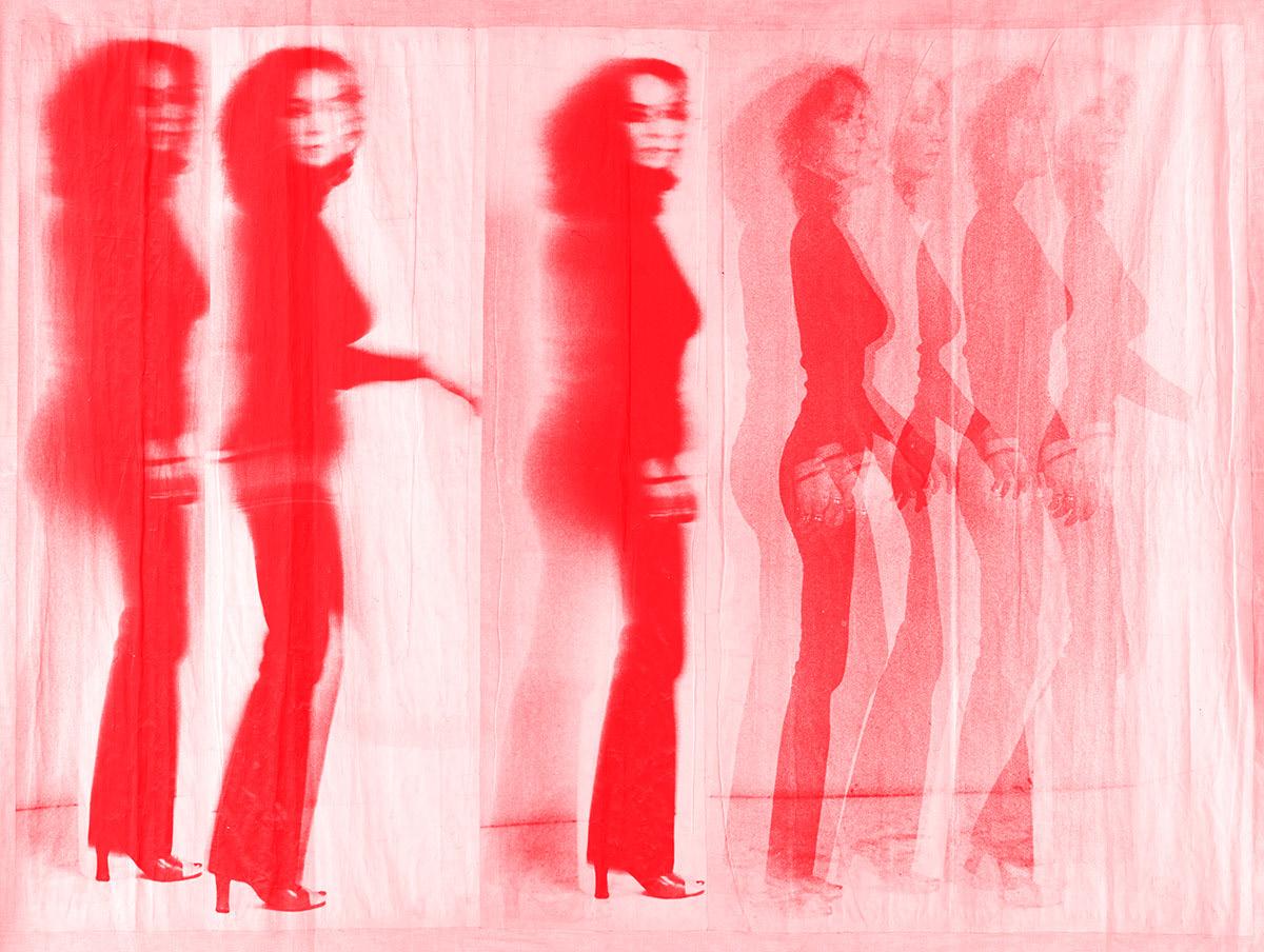 Feltételezések alapján a művésznőről készült fényképek negatívjai kerültek nagyításra egy emulzióval fényérzékenyített vászon ra. 37 Gulyás ezen a művön keresztül vezeti vissza a kép keletkezését a képpontokig – a digitális pixel helyett az analóg technikára jellemző képszemcsékig, az ezüstkolloid szemcsékig. Az árnyszerű szellem-test elhalad a vászonra applikált fotó-vásznon, embernagyságban – a balról jobbra irányuló mozgás fázisfotói követik egymást, és úgy alkotnak egy képet, hogy ezeket egy befoglaló, nagyobb méretű vászonra rögzíti a művész. Tehát az elsődleges és a végső hordozó is a textil, amely így szervesül a testtel, a test lenyomatával és annak eltűnésével. A képszélek – az egyes fényképek határa – ugyan kivehetőek, de ettől még áthatóbbá válik az átmenet, mintha egy másik tér-időbe kerülnénk.