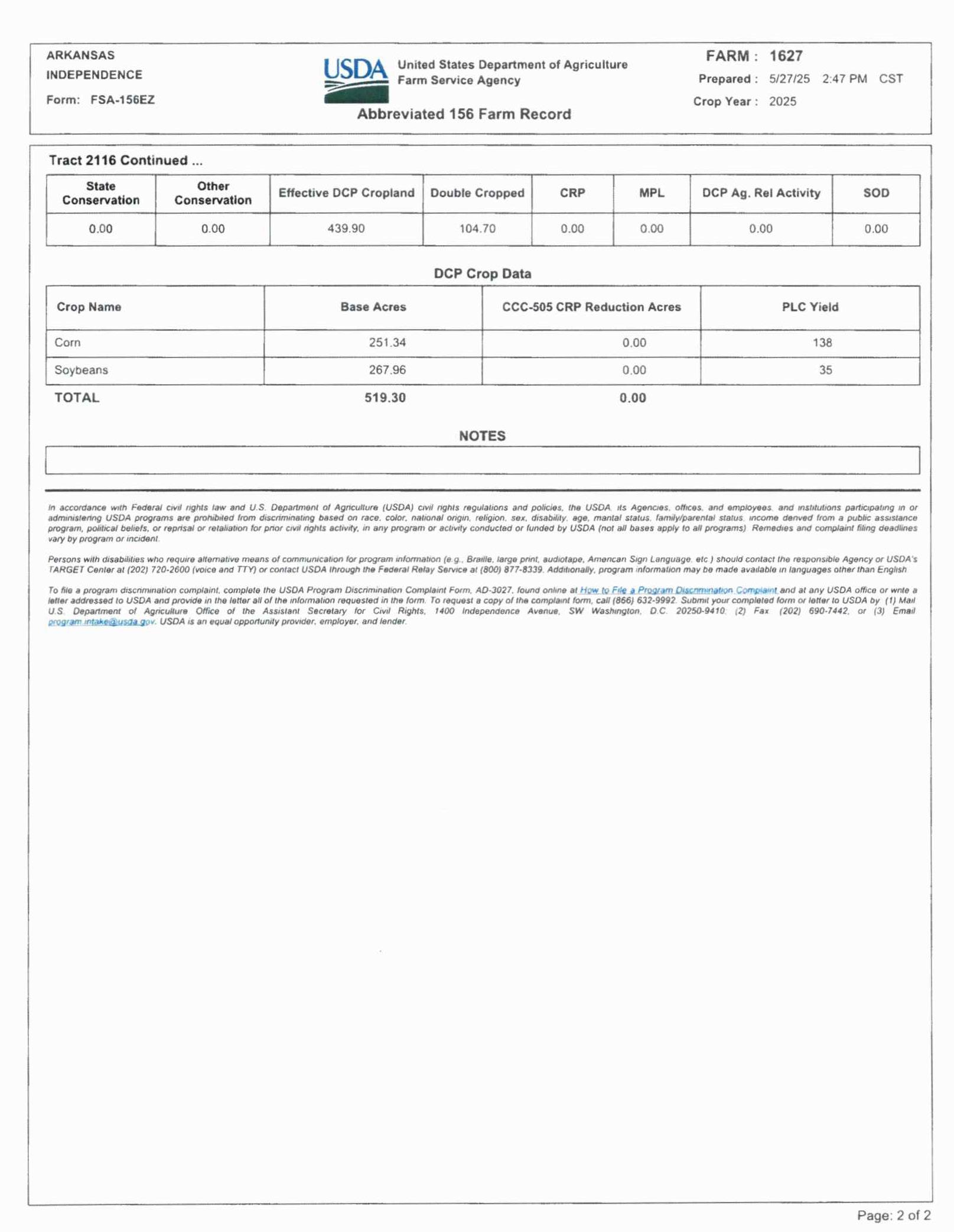 The irrigated ground has historically been planted in corn or soybeans, with the remaining non-irrigated acreage planted in wheat and soybeans.
