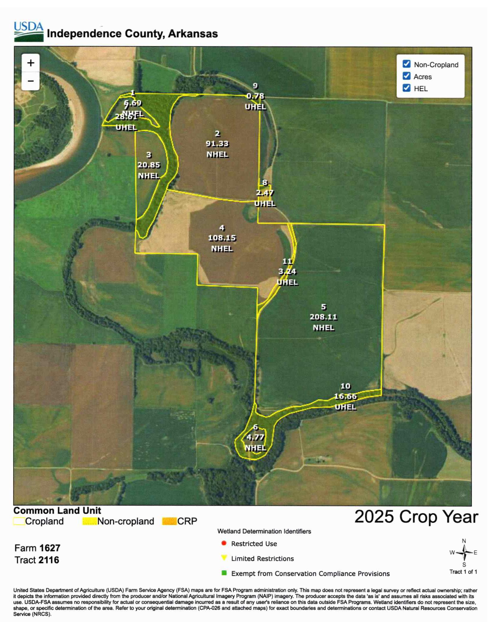 The Big Bottom Slough Farm is 469.28± acres in Independence County, Arkansas and offers an excellent agricultural investment opportunity. The property is comprised of 439± tillable acres, of which 332± acres are irrigated by two (2) six-inch diesel turbine wells, two (2) eight-inch diesel turbine wells, three (3) five-span pivots and one (1) seven-span pivot. The irrigated
