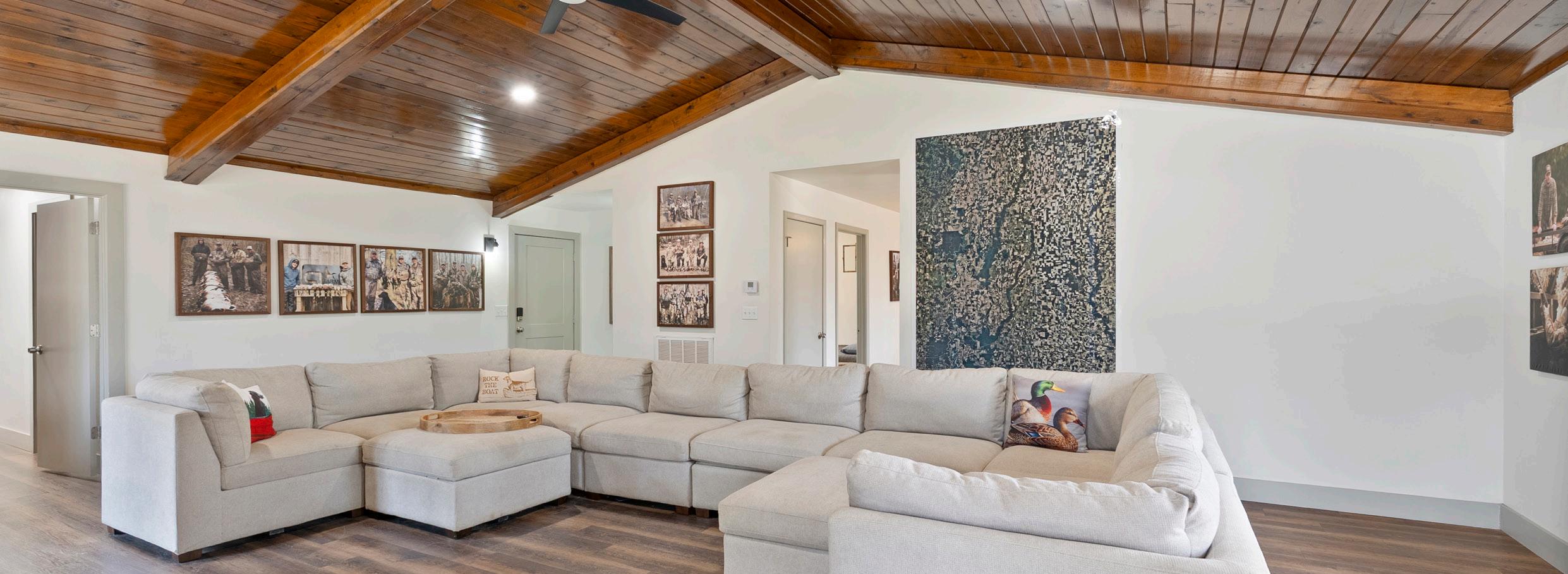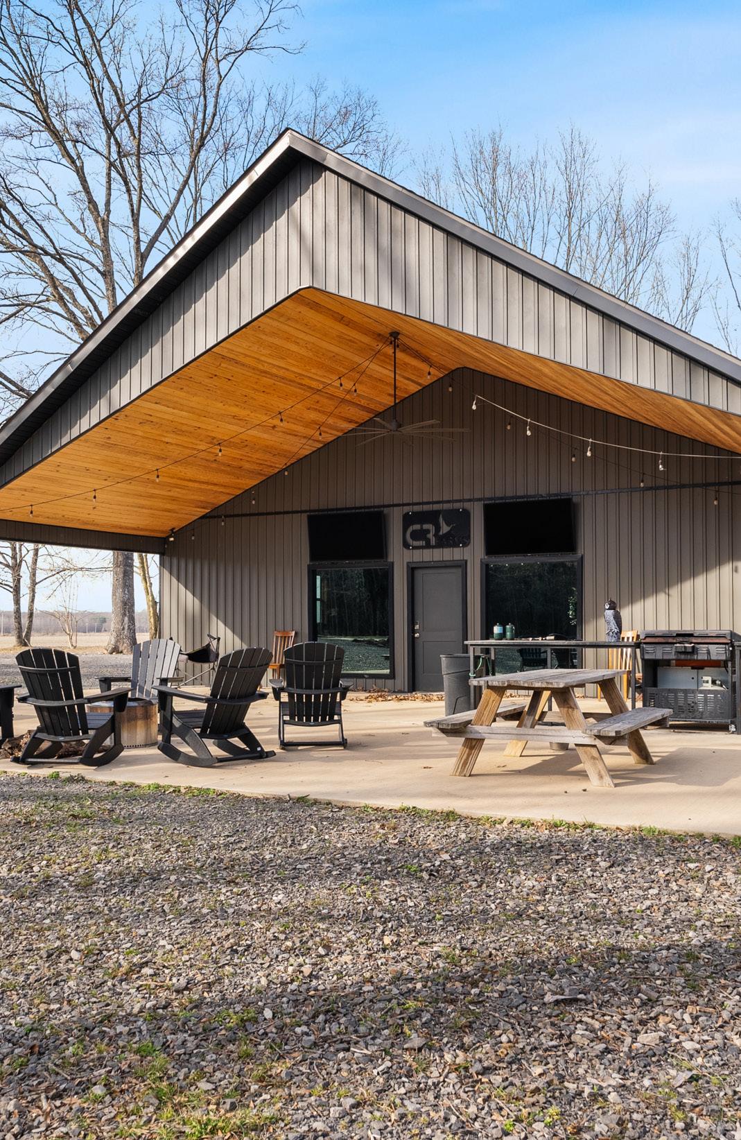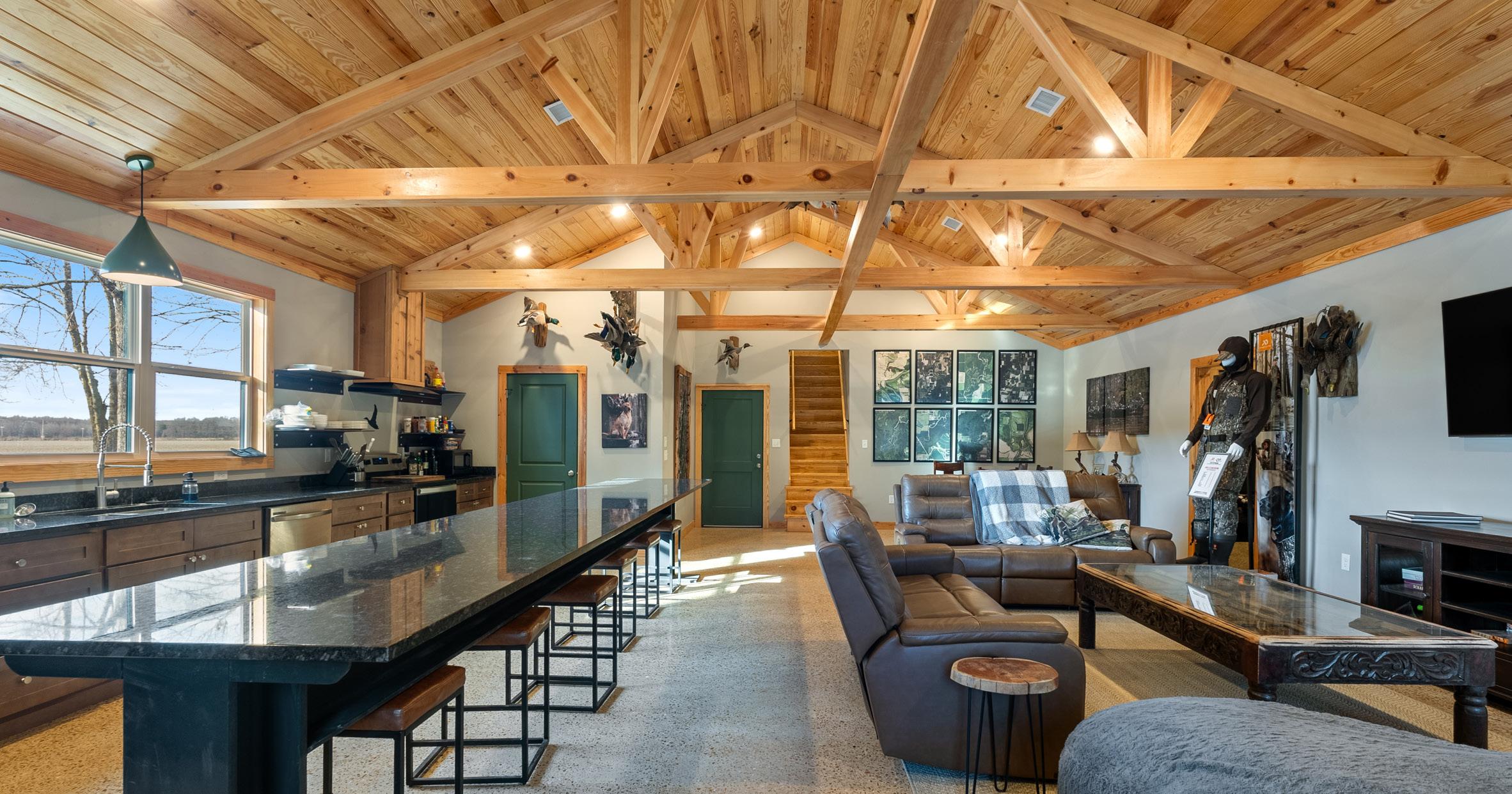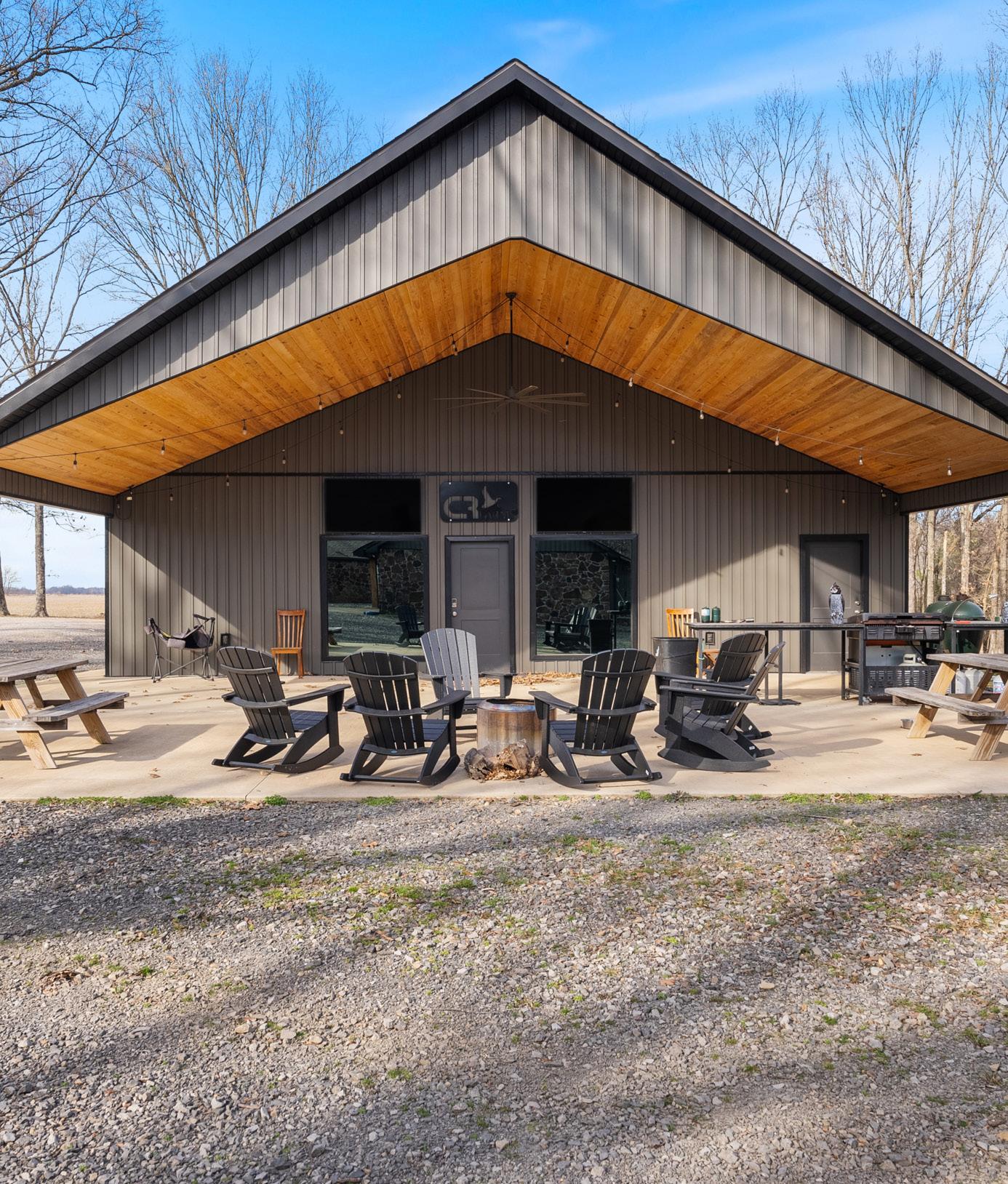 lodge consisting of 2,780± heated & cooled square feet. With three bedrooms and two bathrooms on the main floor and a large loft upstairs there is plenty of room to sleep large groups. The open-concept kitchen and living room has vaulted ceilings, and was designed to entertain and flows easily outside to the 600± square covered patio. Located on the opposite side of the kitchen is a 1,250± square foot garage that is designed to store hunting equipment and has individual lockers for members.