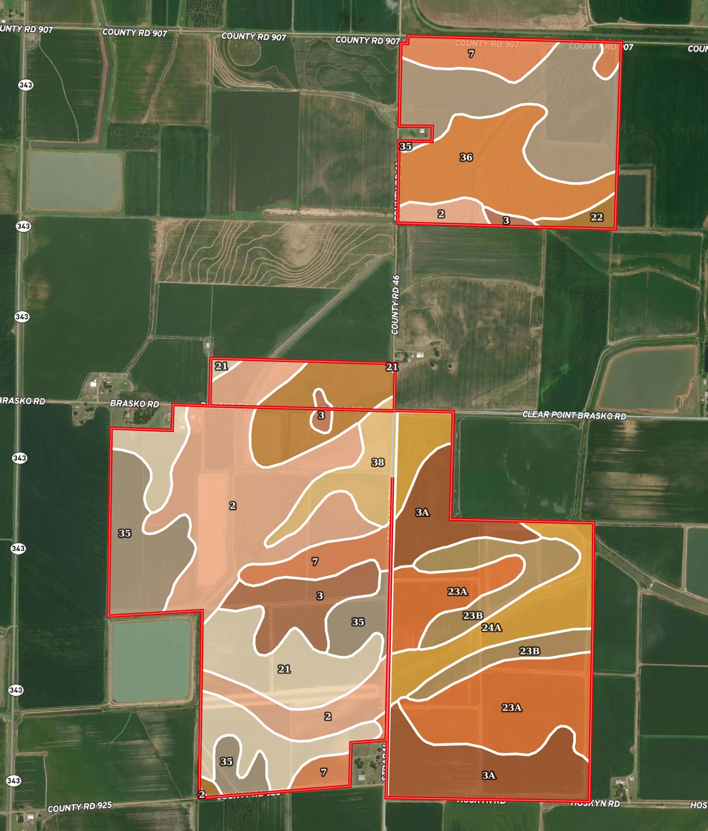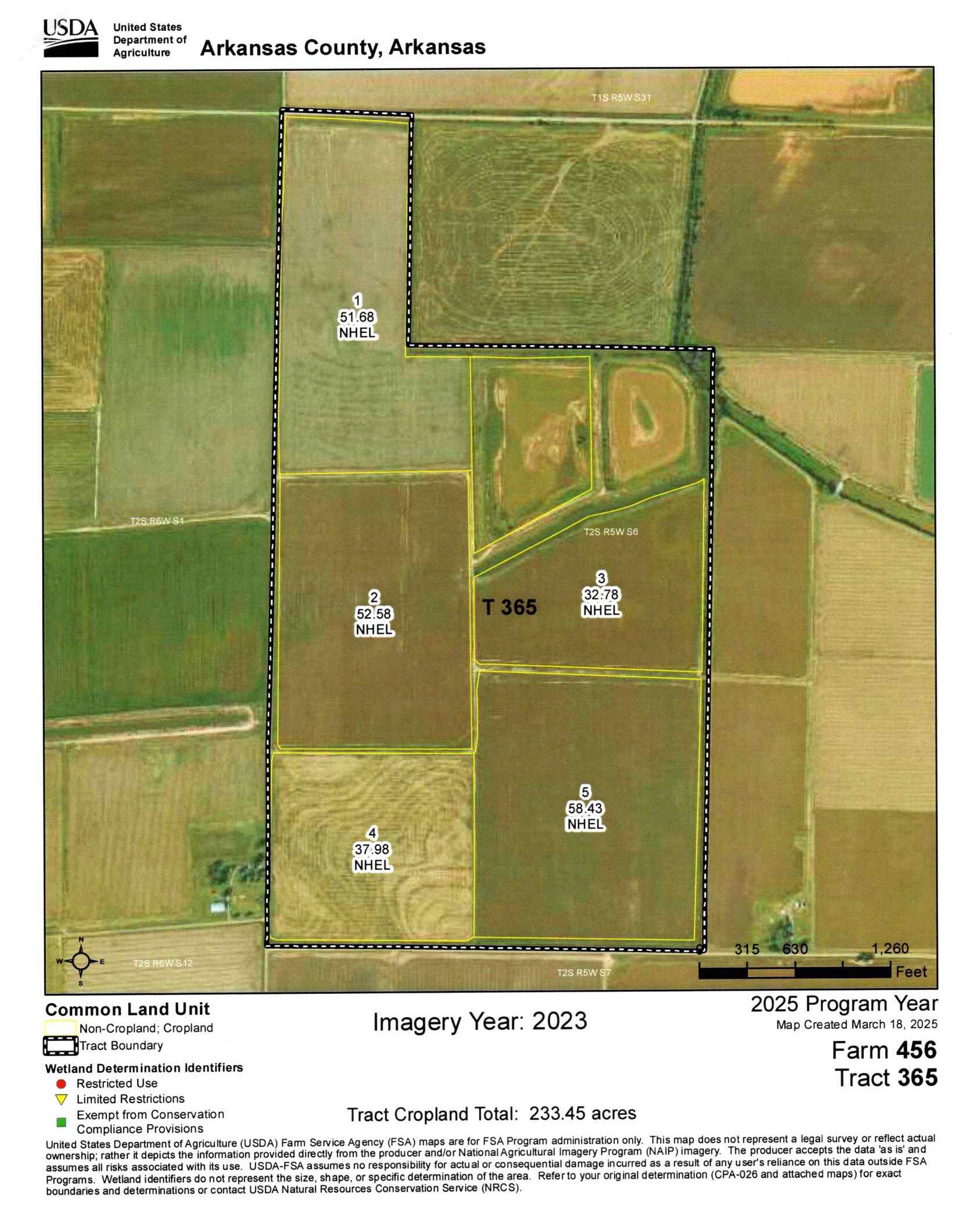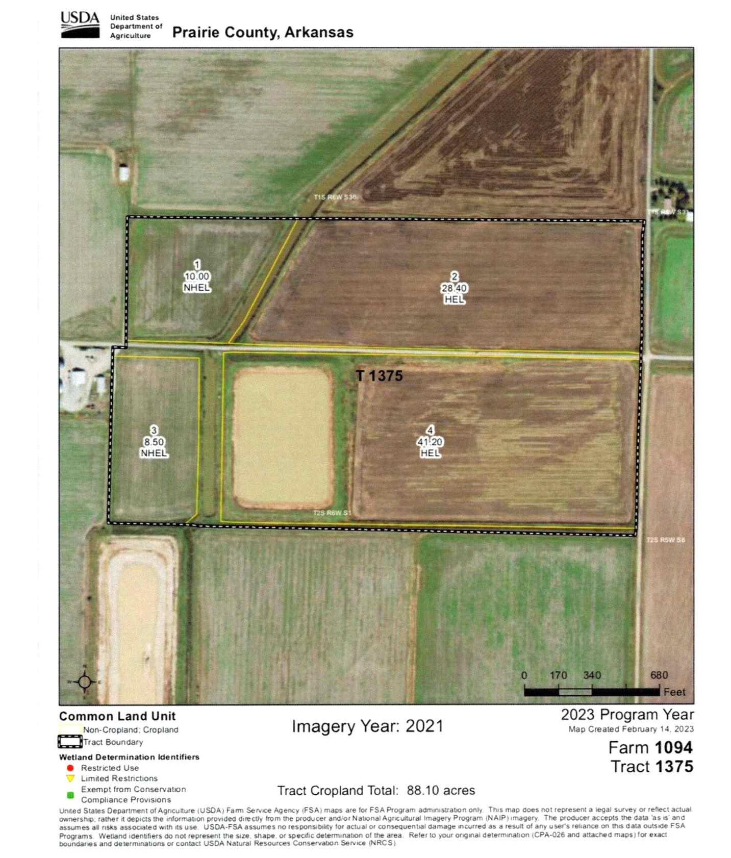 The Clear Point Prairie Farm consists of 926± acres located in Arkansas and Prairie County, Arkansas. The farm offers an excellent agricultural and recreational investment. The Farm Service Agency office reports a total of 800.05± tillable acres. All of the tillable acres are irrigated and 134 ± acres have been leveled to a zero grade. There are four surface water irrigation reservoirs that total 44± acres, five tailwater recovery pits, seven wells, and seven relifts that
