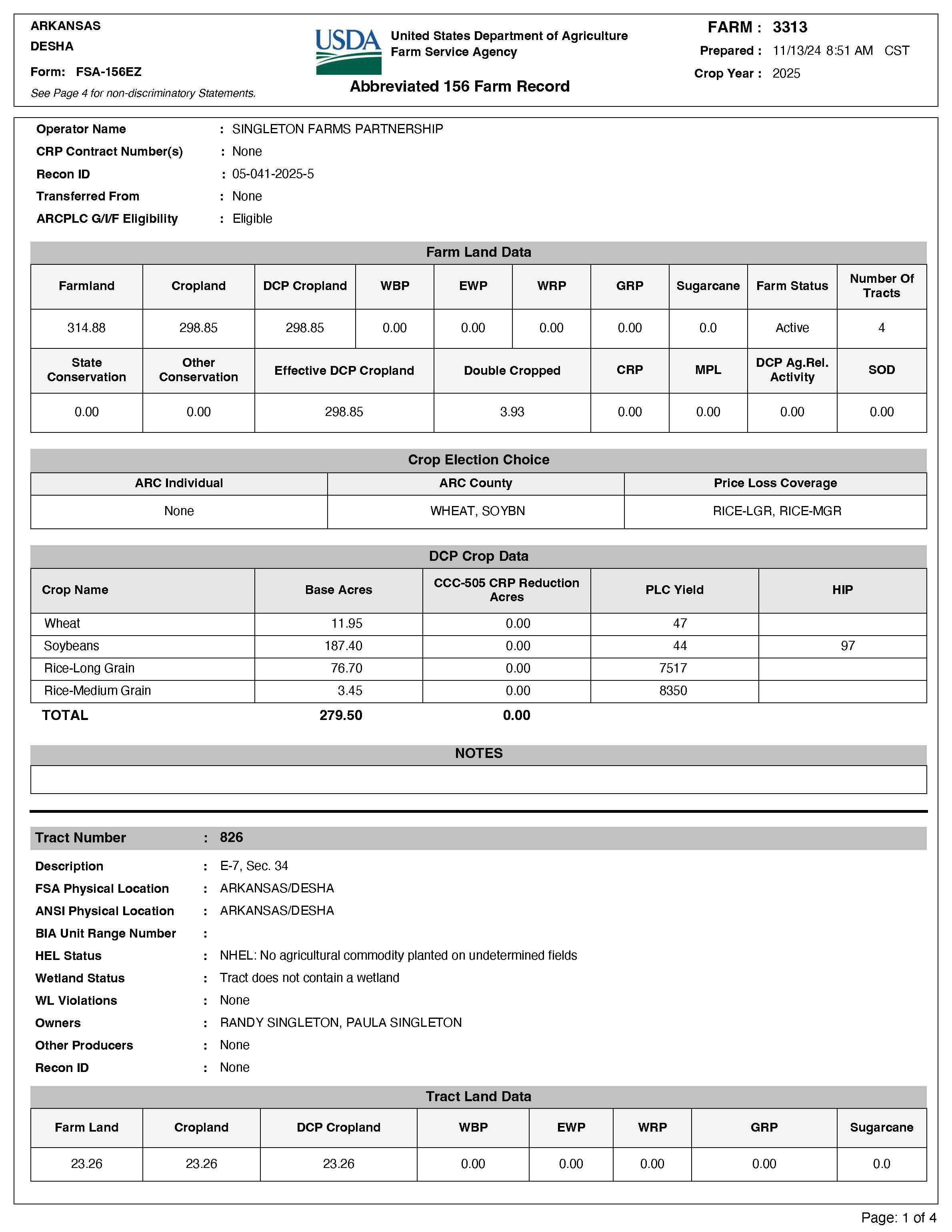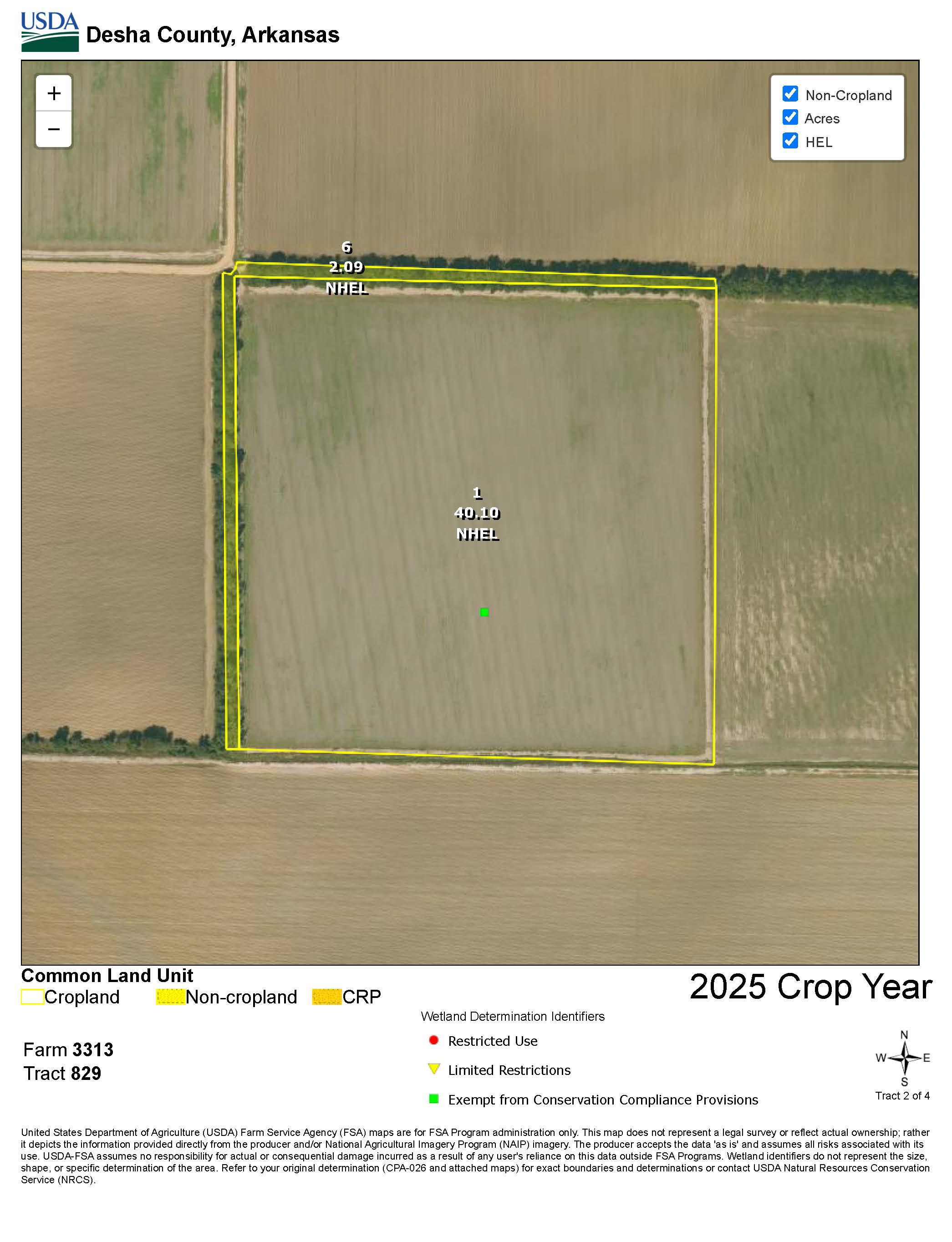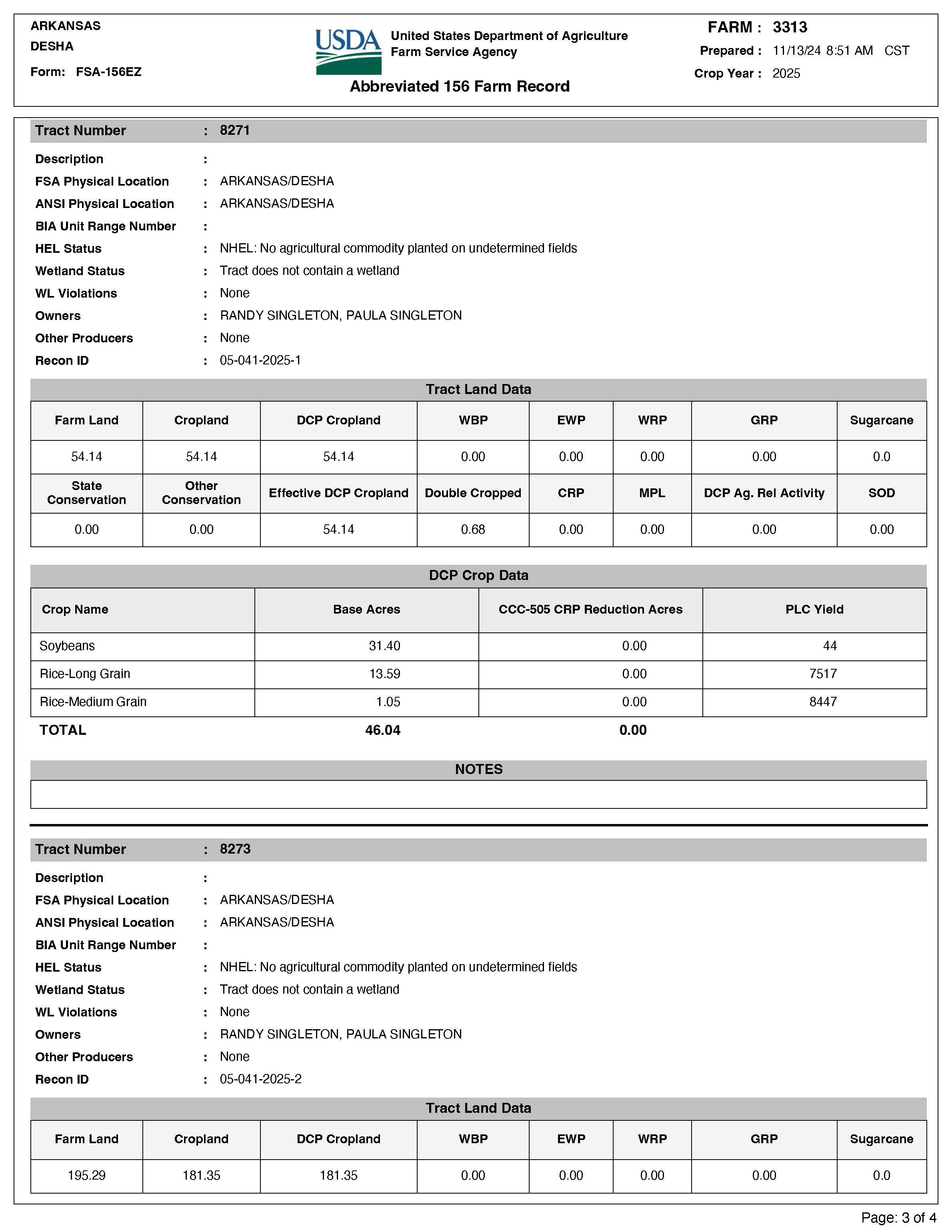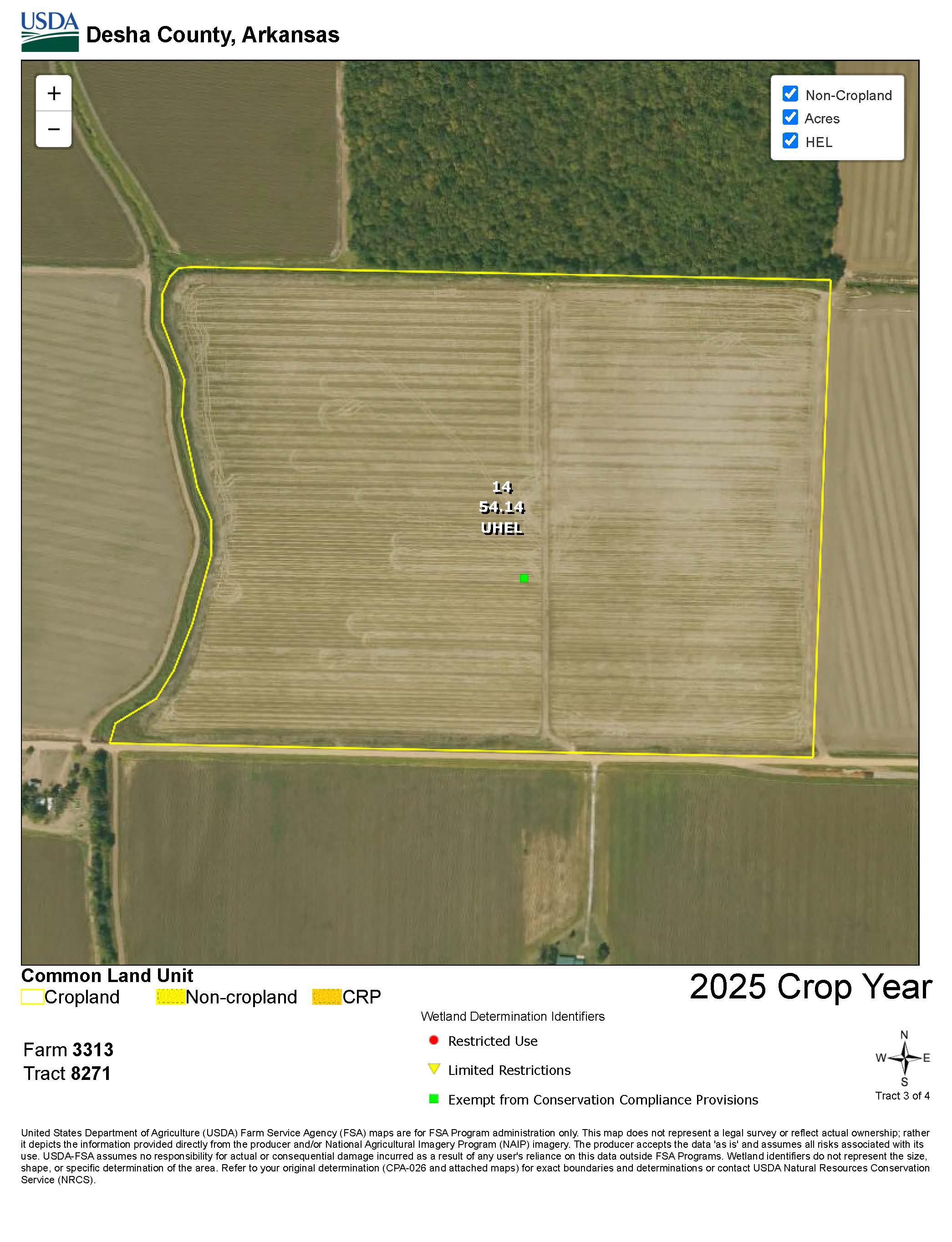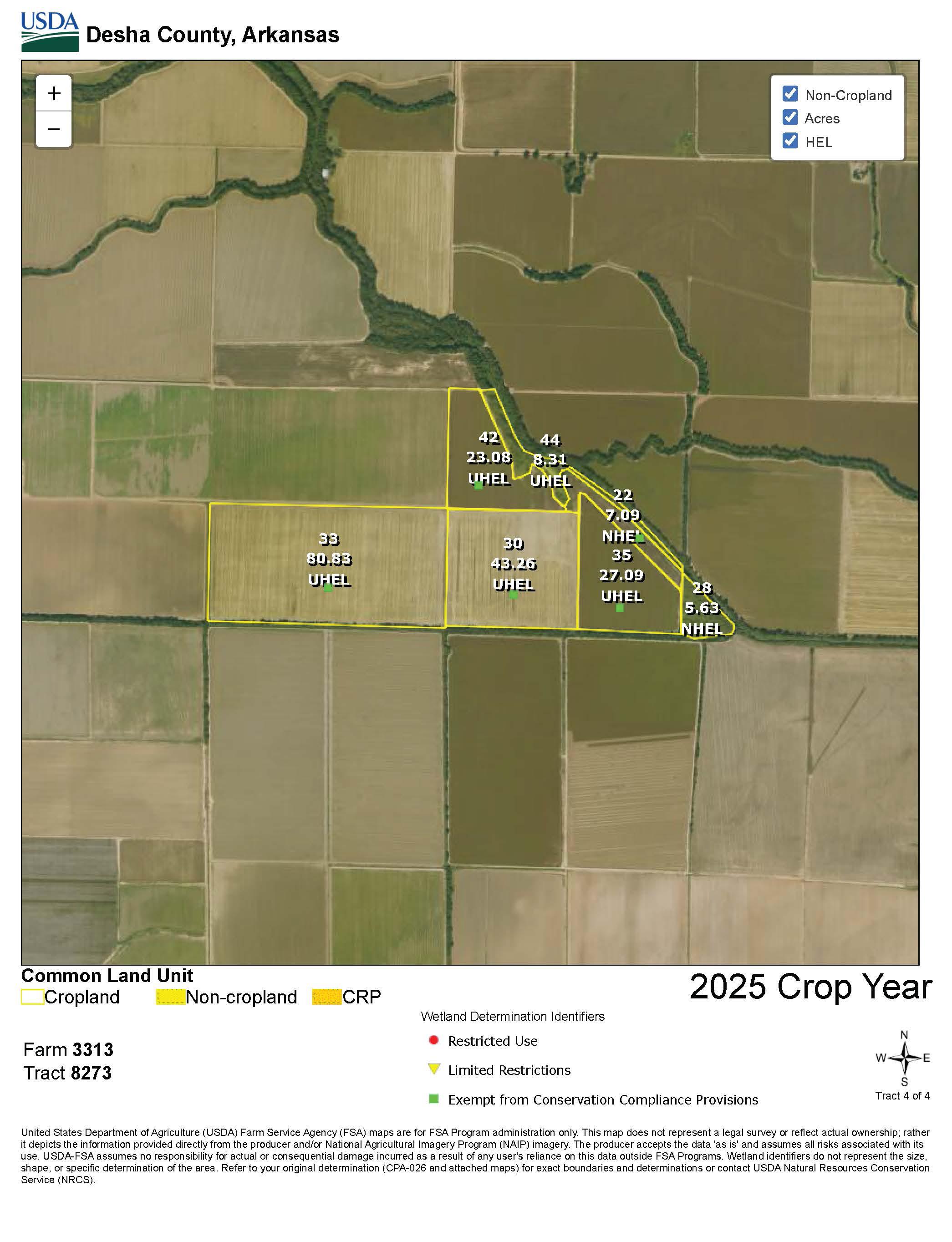 The property is easily accessed from Desha County Roads 38, 53, and 263. There is a verbal farming agreement with Mark Singleton for 2025 (80/20% crop share). Recreational waterfowl hunting opportunities exist on the property.