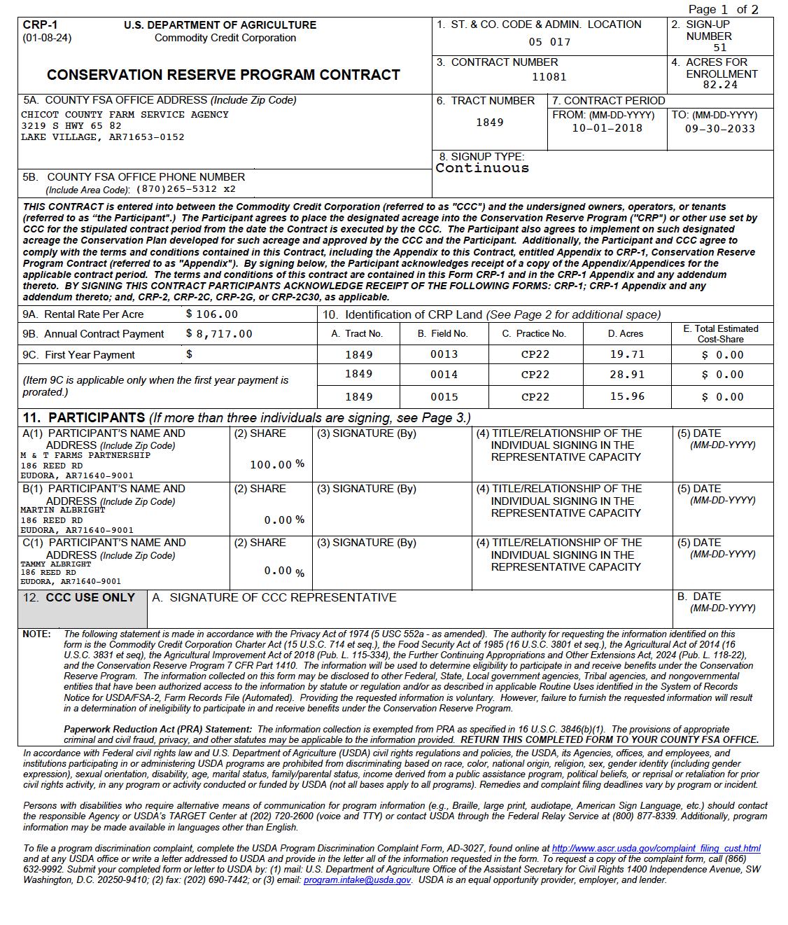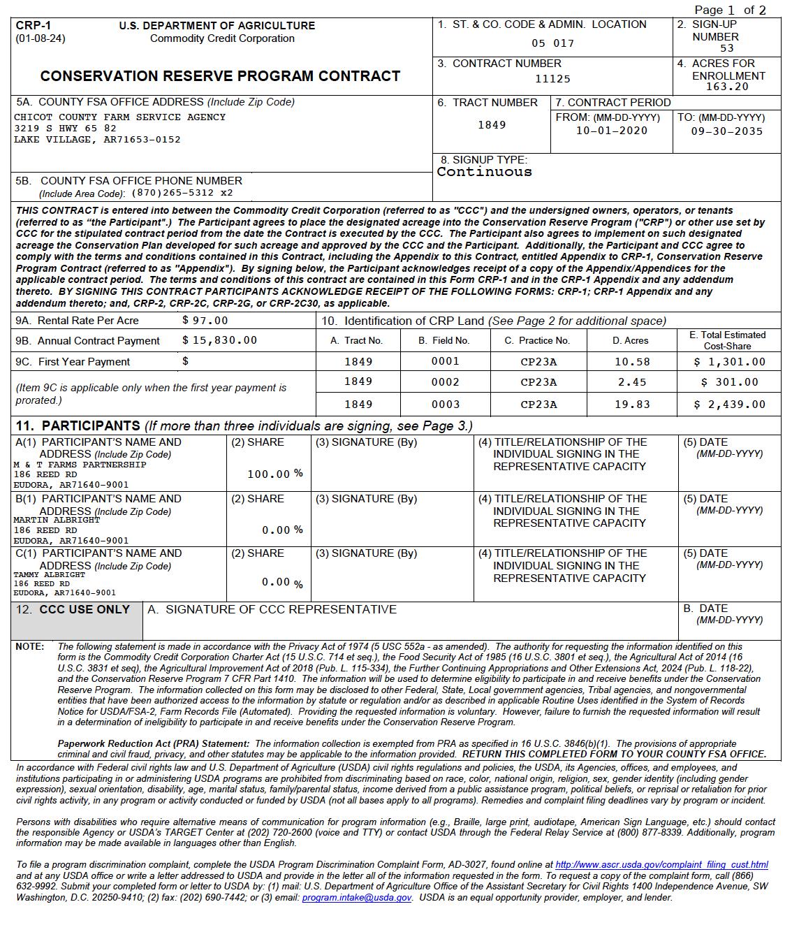 THIS CONTRACT is entered into between the Commodity Credit Corporation (referred to as ''CCC") and the undersigned owners, operators, or tenants (referred to as “the Participant".) The Participant agrees to place the designated acreage into the Conservation Reserve Program (''CRP") or other use set by CCC for the stipulated contract period from the date the Contract is executed by the CCC. The Participant also agrees to implement on such designated acreage the Conservation Plan developed for such acreage and approved by the CCC and the Participant. Additionally, the Participant and CCC agree to comply with the terms and conditions contained in this Contract, including the Appendix to this Contract, entitled Appendix to CRP-1, Conservation Reserve Program Contract (referred to as ''Appendix"). By signing below, the Participant acknowledges receipt of a copy of the Appendix/Appendices for the applicable contract period The terms and conditions of this contract are contained in this Form CRP-1 and in the CRP-1 Appendix and any addendum thereto. BY SIGNING THIS CONTRACT PARTICIPANTS ACKNOWLEDGE RECEIPT OF THE FOLLOWING FORMS: CRP-1; CRP-1 Appendix and any addendum thereto; and, CRP-2, CRP-2C, CRP-2G, or CRP-2C30, as applicable.