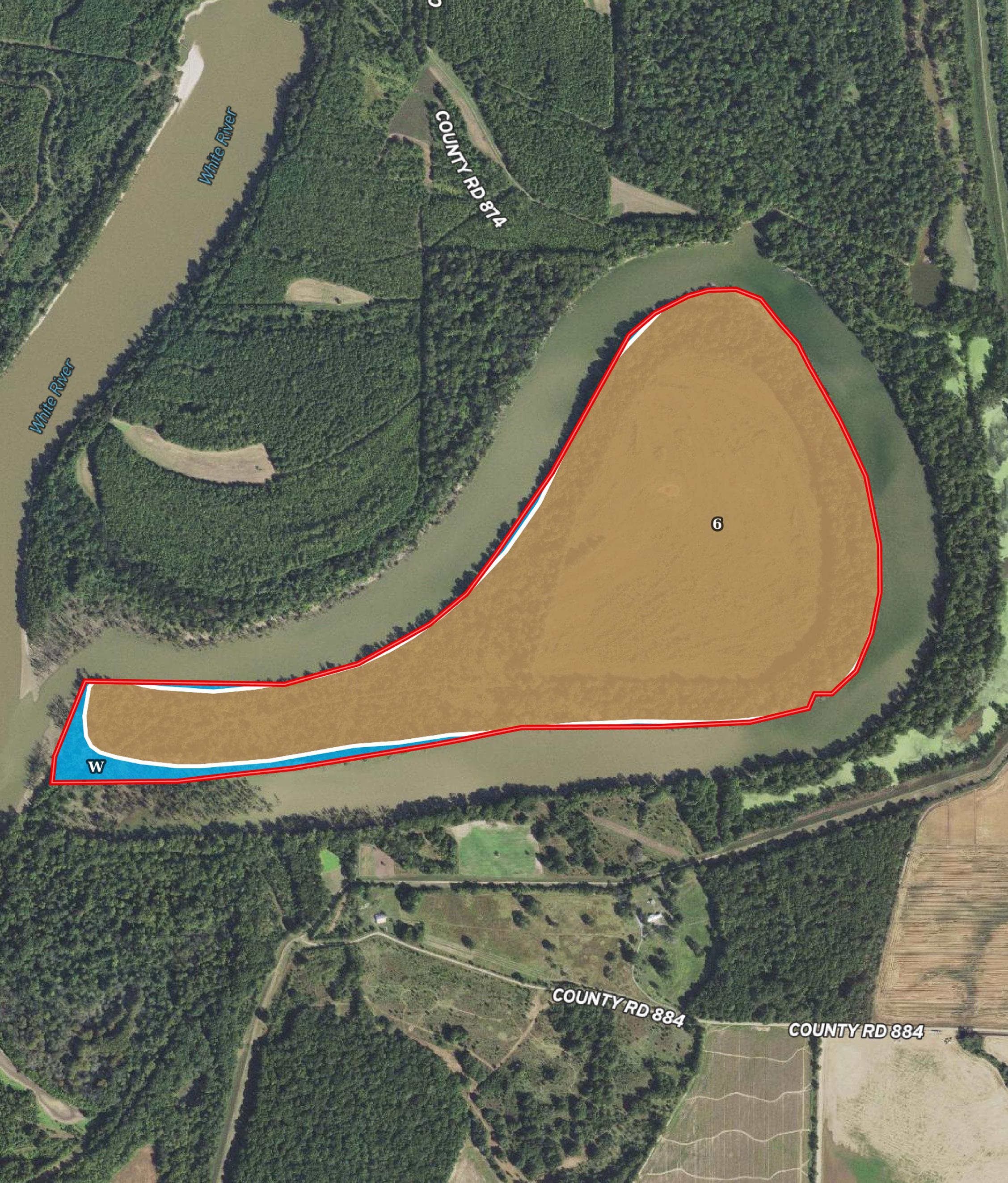 ered excellent with several stands and food plots already existing as well as newly improved shooting lanes with harvest and trail camera records of large deer. Duck hunting opportunities exist all season on the oxbow but are known for being world class when the White River gauge at Georgetown reaches 17 feet and surrounding areas begin to flood. An exceptional cabin site is established on the property, with electricity, and offers a beautiful view of the oxbow. This property is truly rare and the only one of its kind located on this section of the White River.