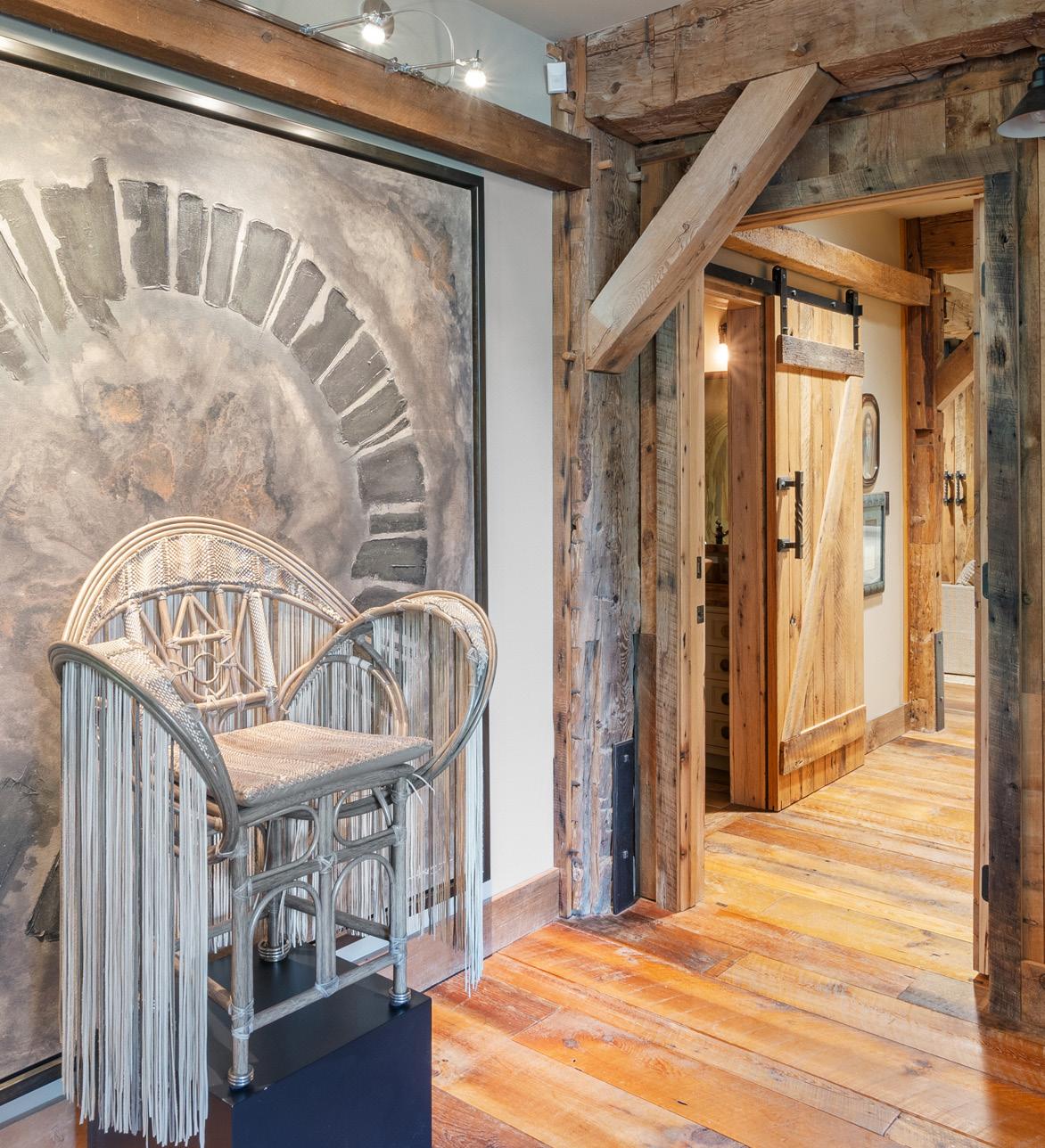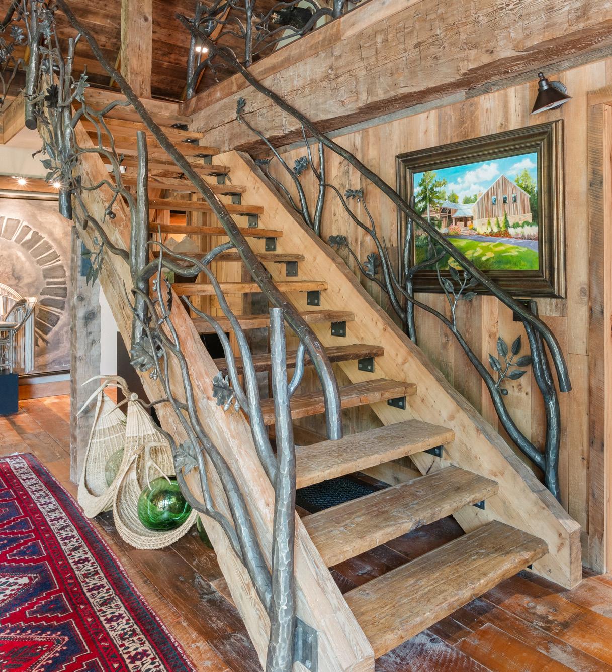 The second level is accessed via an open-air stairway featuring large wood planks and custom iron work. The second level is a mixture of open-air loft space for board and table games, a reading nook,