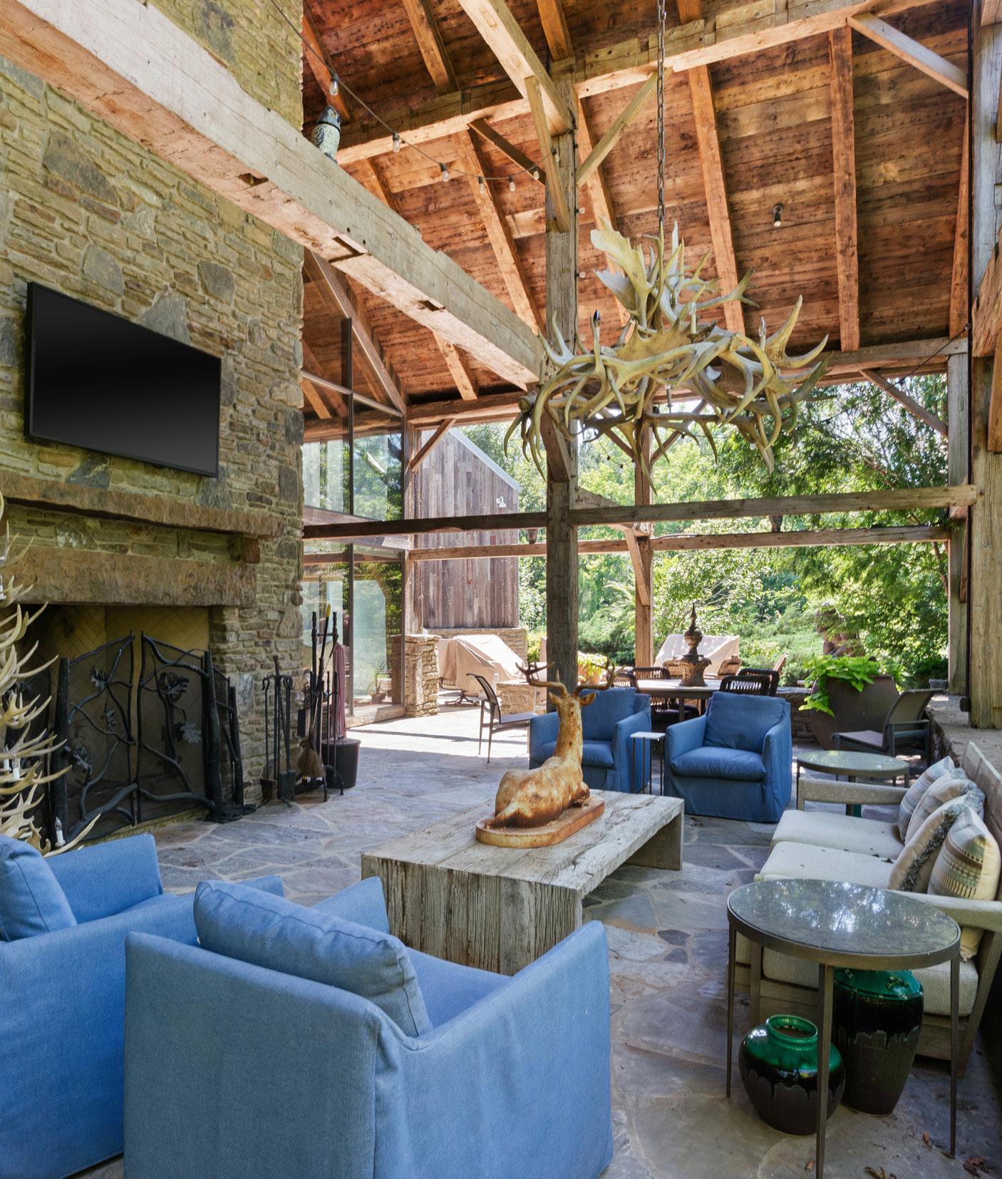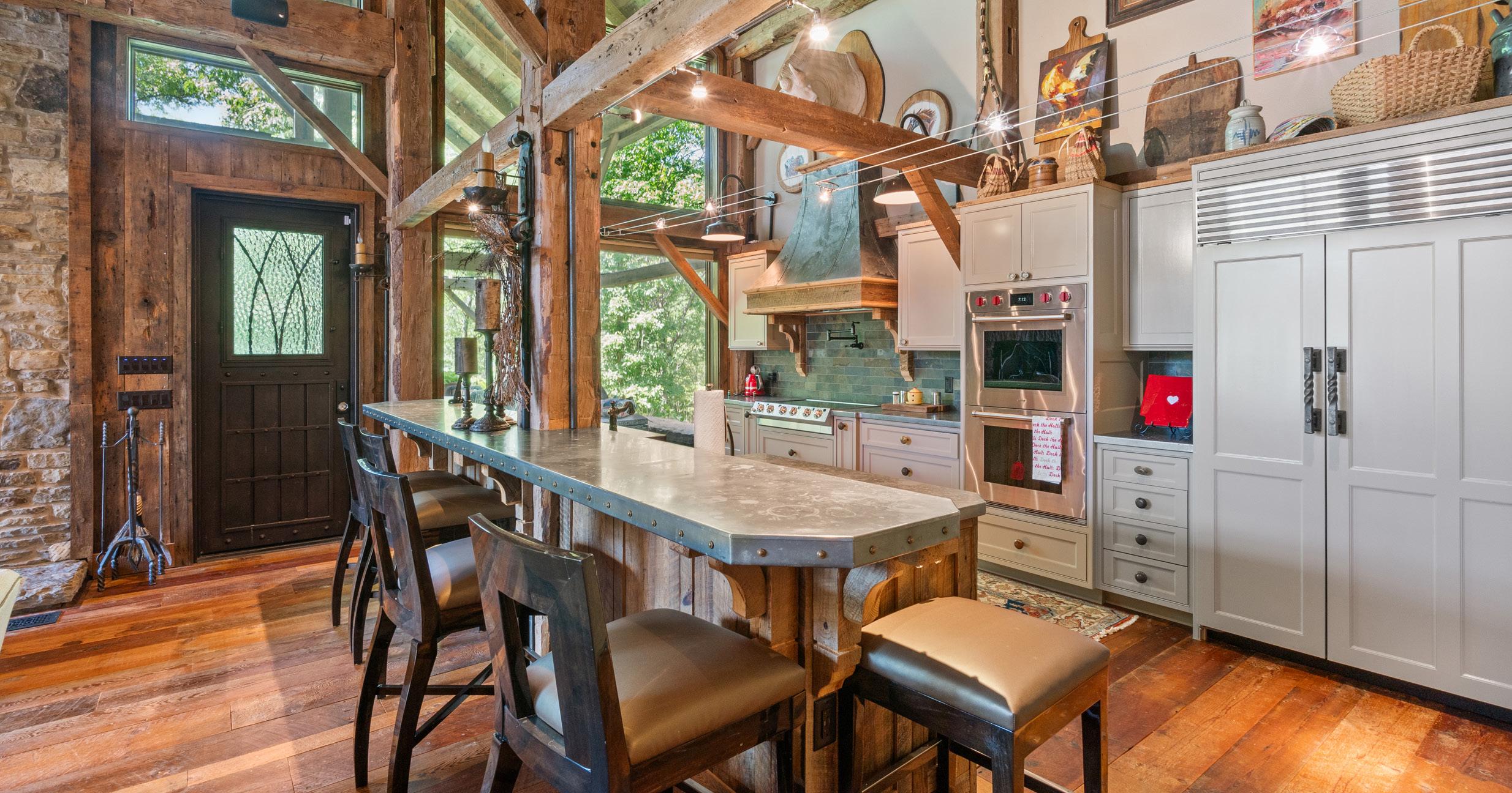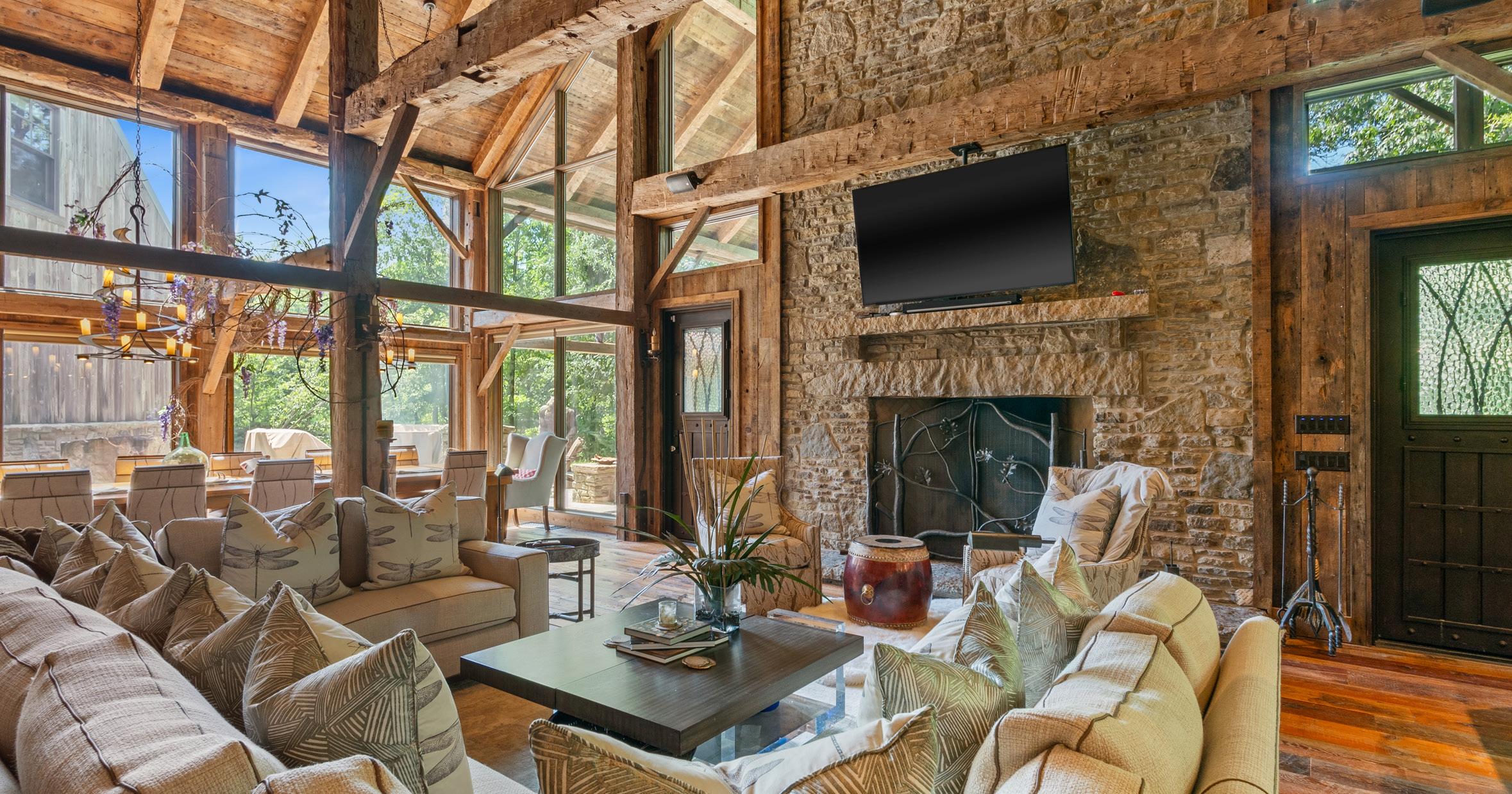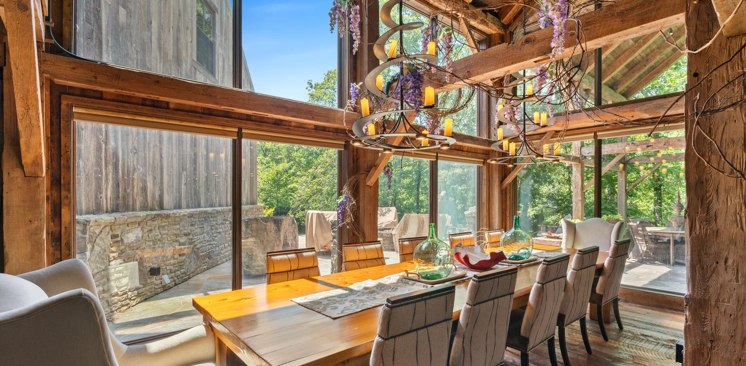 Upon entering the main lodge, your guests are greeted by three massive walls of solid pane glass overlooking tremendous patios and views of nature. The centerpiece of the great room is a magnificent 12’ wide hearth fireplace with a 36’ tall stone stack to the vault of the ceiling. The fireplace has a six-foot-wide double-sided “Rumford Fireplace” back to the era of the mid-1800s and in tune with the age of the barns. This great room features the open-air comfortable living environment having on the west side a custom-made “sunken cypress” dining table with seating for 12, to the east side with the “chef’s kitchen with all of the best appliances, “zinc” counter tops, with immediate access to the walk-in pantry and bar.