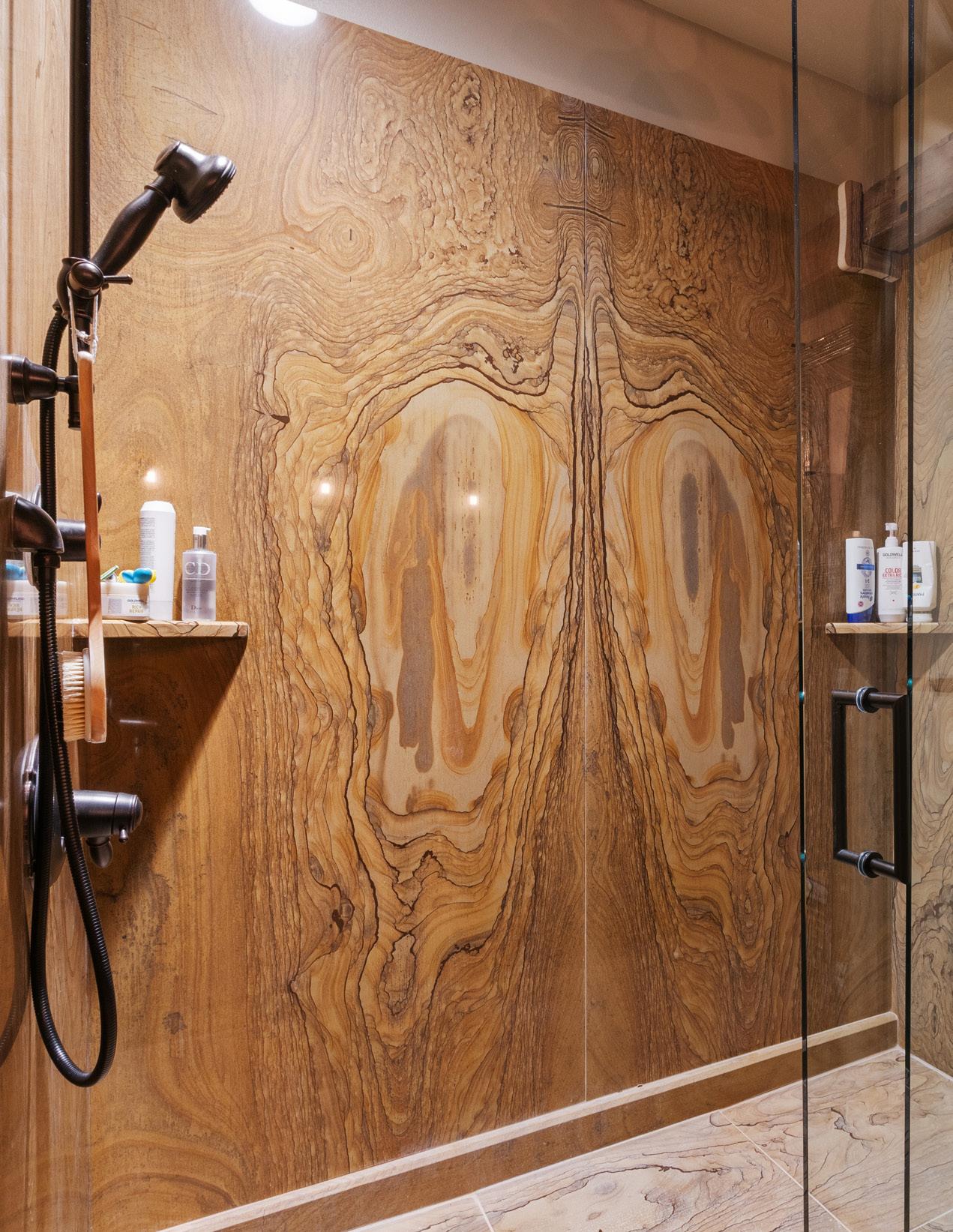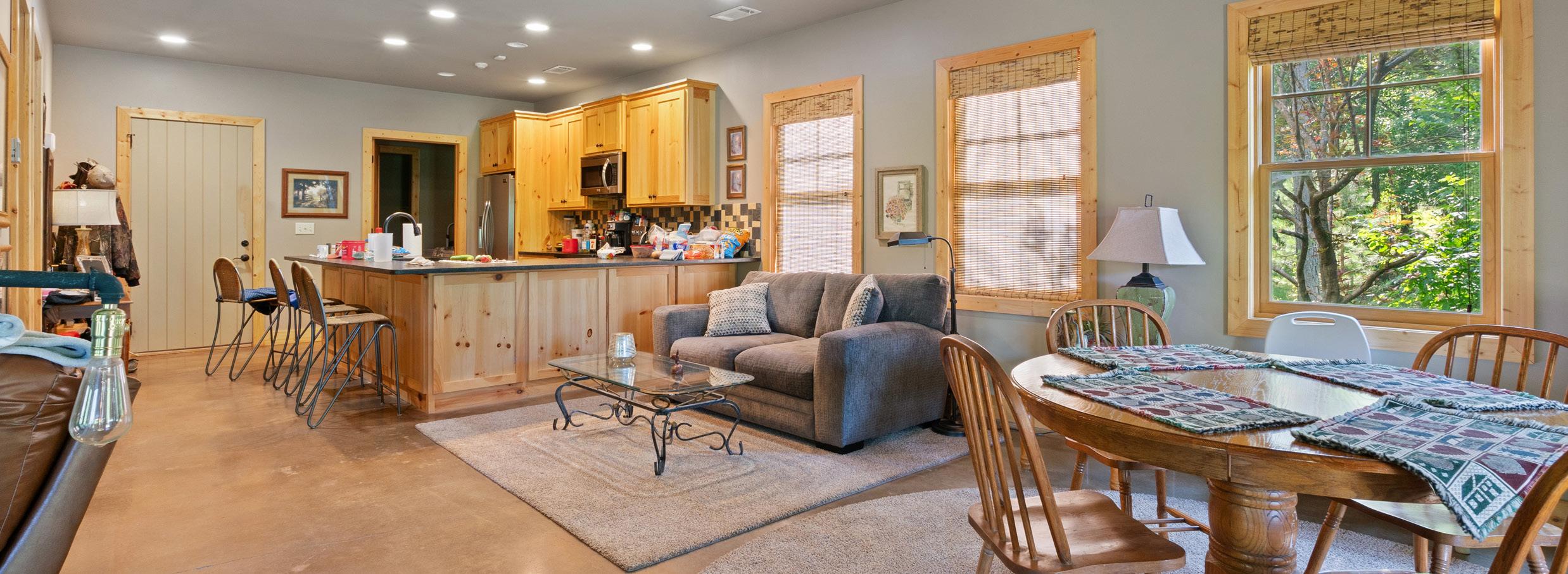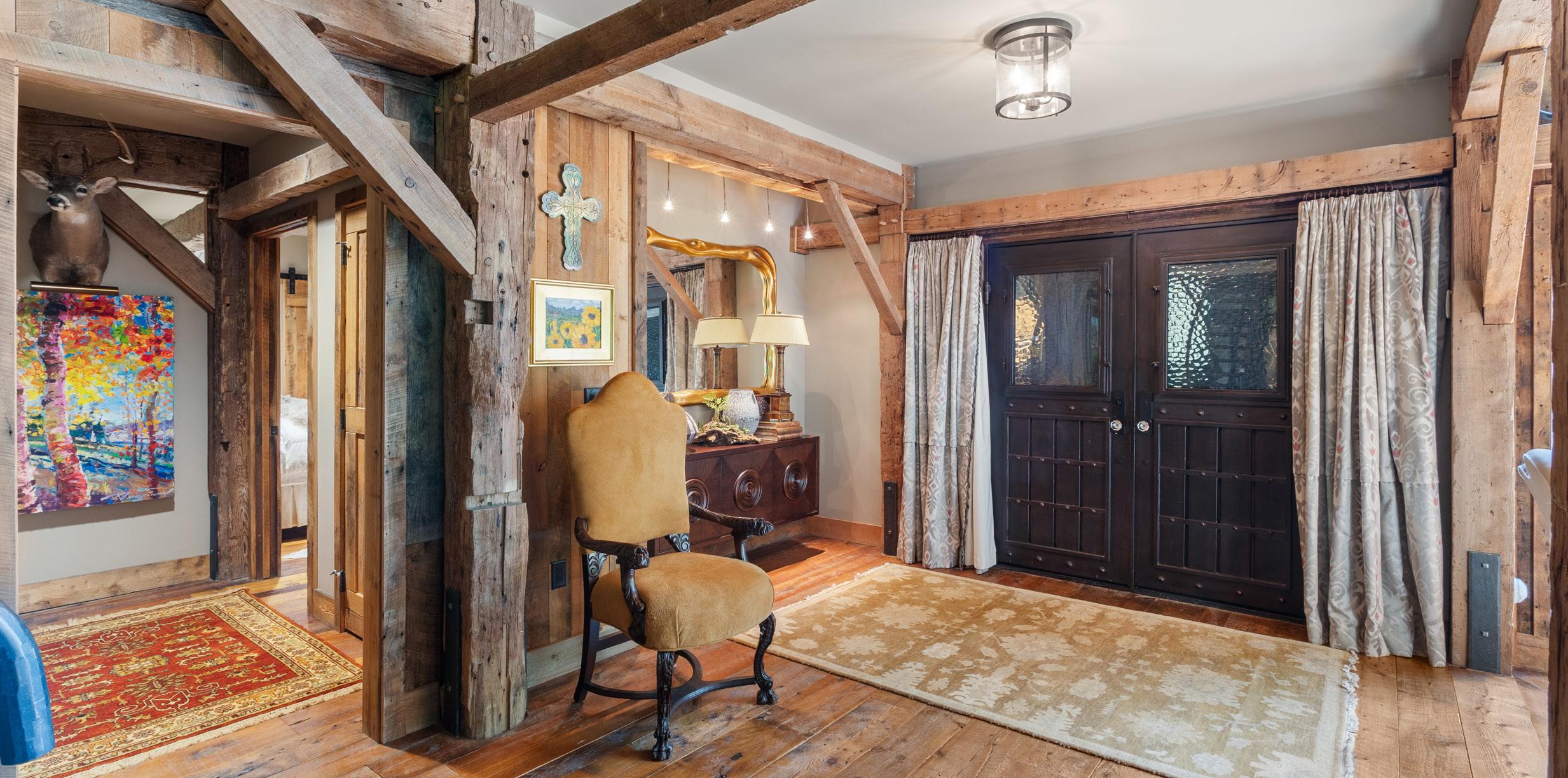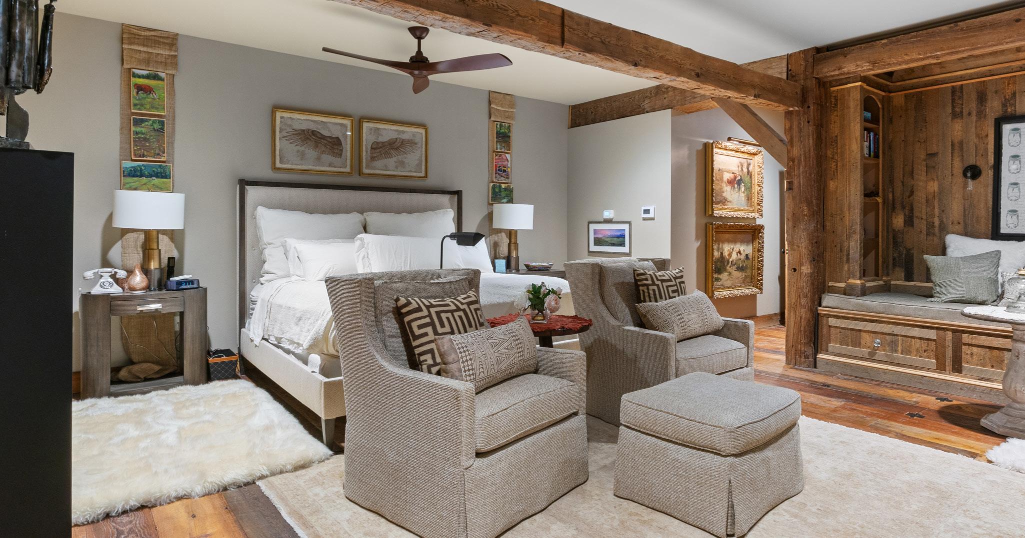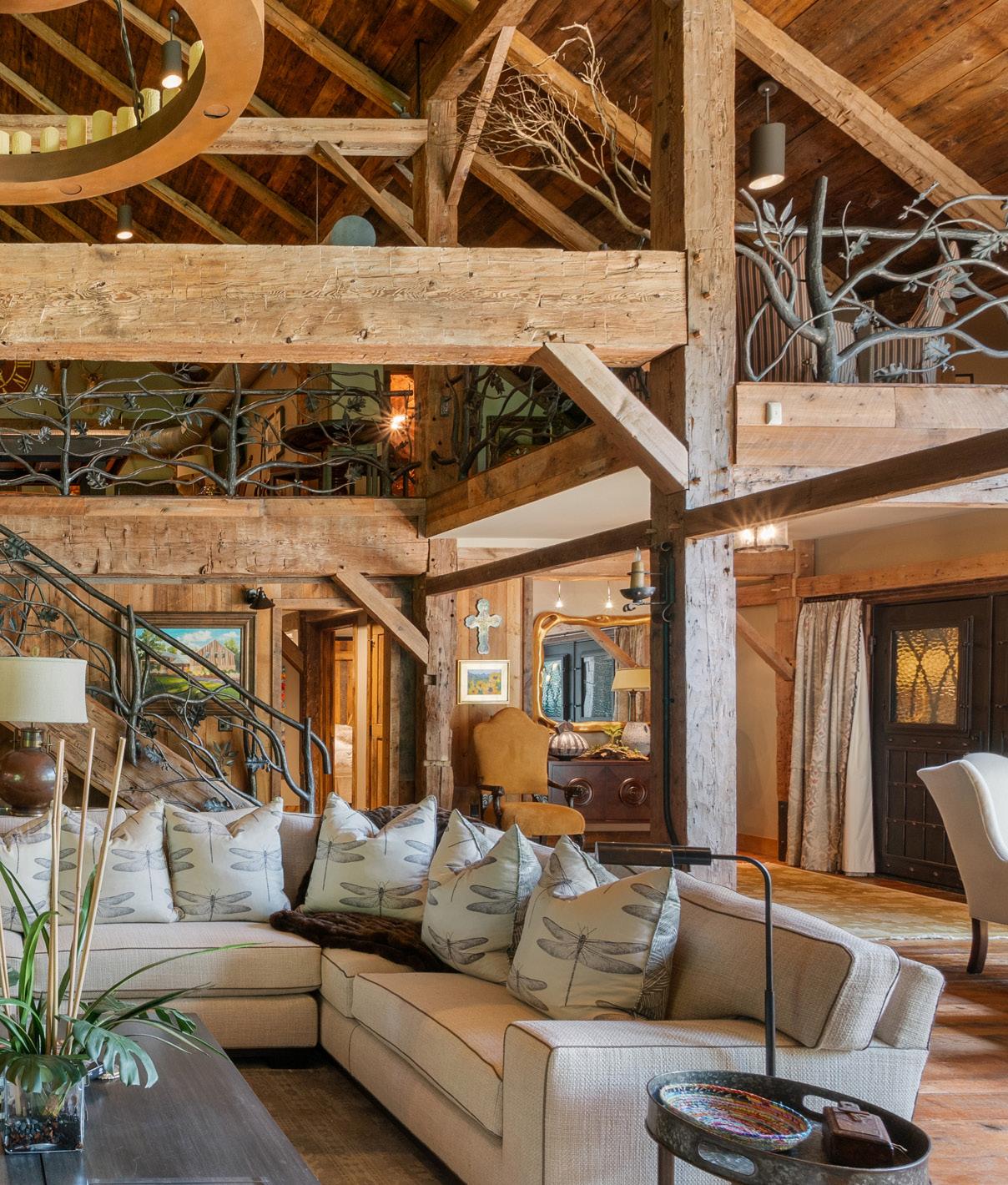 Upon entering the main lodge, your guests are greeted by three massive walls of solid pane glass overlooking tremendous patios and views of nature. The centerpiece of the great room is a magnificent 12’ wide hearth fireplace with a 36’ tall stone stack to the vault of the ceiling. The fireplace has a six-foot-wide double-sided “Rumford Fireplace” back to the era of the mid-1800s and in tune with the age of the barns. This great room features the open-air comfortable living environment having on the west side a custom-made “sunken cypress” dining table with seating for 12, to the east side with the “chef’s kitchen with all of the best appliances, “zinc” counter tops, with immediate access to the walk-in pantry and bar.