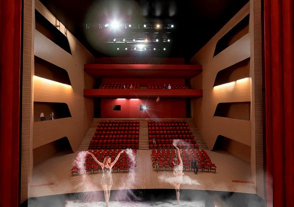 El edificio está compuesto por volúmenes simétricos con diferentes alturas cuya morfología busca imitar las vistas de un escenario y es cubierta con una fachada que cae sobre dichos volúmenes dando la impresión de que son cubiertos por un telón que representa de manera grafica la funcionalidad del edificio pero con una solucion elegante y algo diferente haciendo que no pase desapercibido por el peatón es la representación de una fachada simple pero hermosa que lleva consigo un contexto simbólico dónde resalta la belleza de teatro y su participación con el público