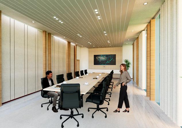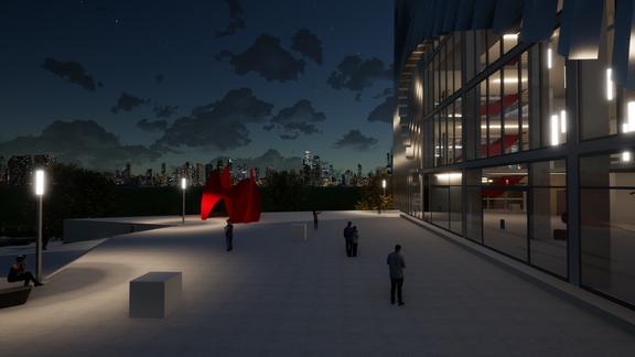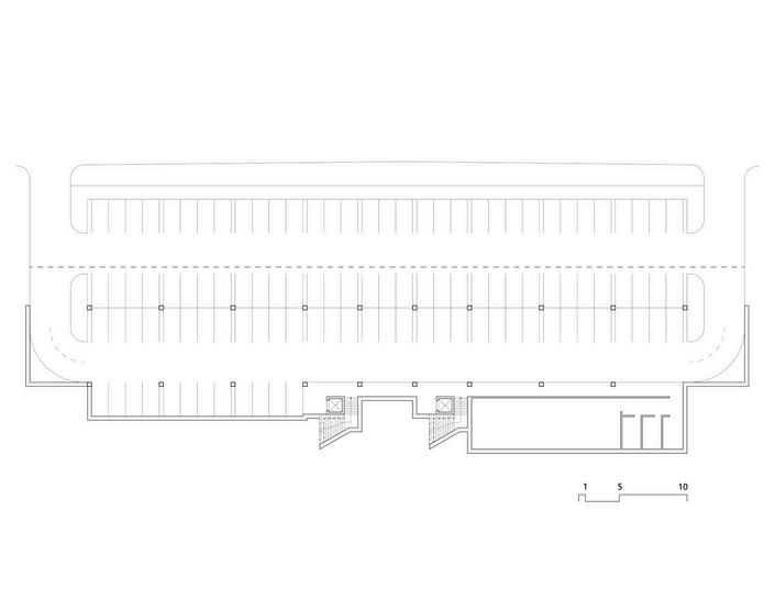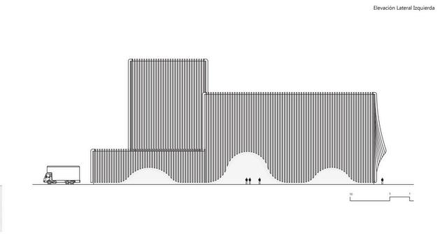 La piel del edificio está formada por louvers posicionados de manera que se formen curvas sobre el edificio, creando dinamismo visual y representando esa curvatura que se forma en el telón