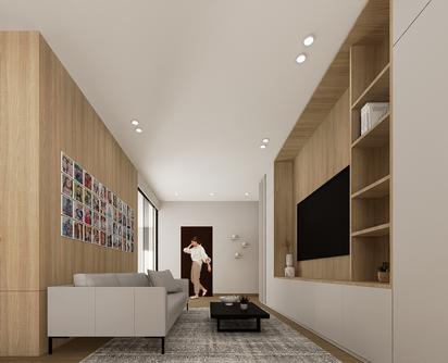 Diseño de mobiliario fijo para SALA en mdf hidrófugo revestido en chapilla de roble natural, con módulos abiertos para librero