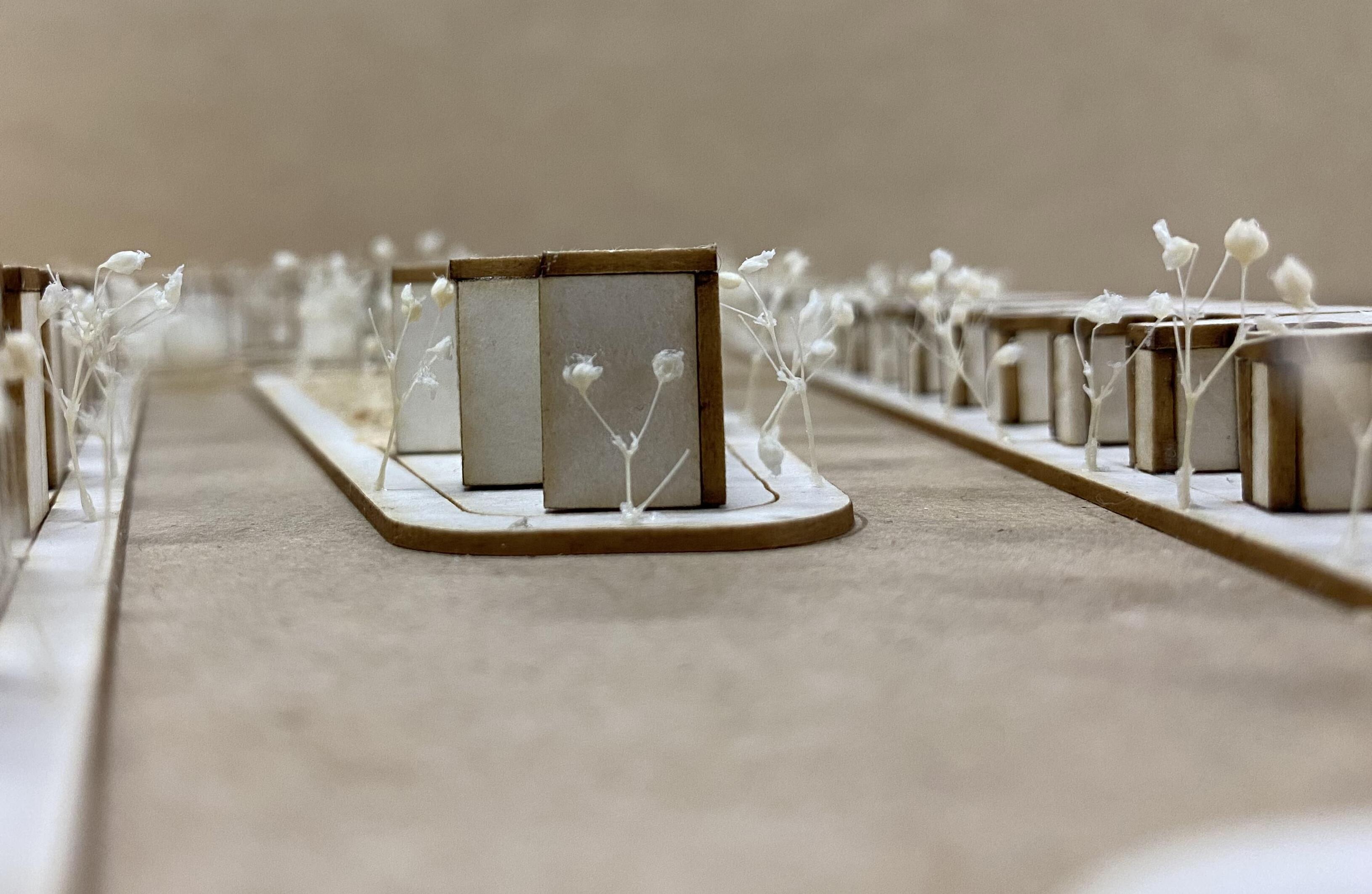 We first set up four microphones every fifty meters apart to measure and analyze the sound created by the traffic. We used the data to design the structure’s shape to reduce the noise inside with isolated acoustics.
