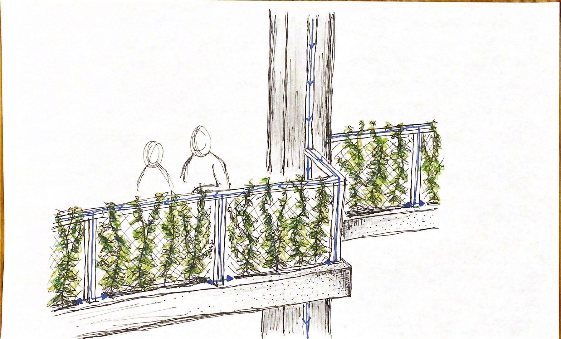 Roof water runoff is collected in downspouts, nourishing the Chinese vegetables on outdoor terraces, and eventually reaching the rain gardens. Cisterns hold bio-filtered water from the gardens. The water is then redistributed to the building’s plants, bathrooms, and showers.