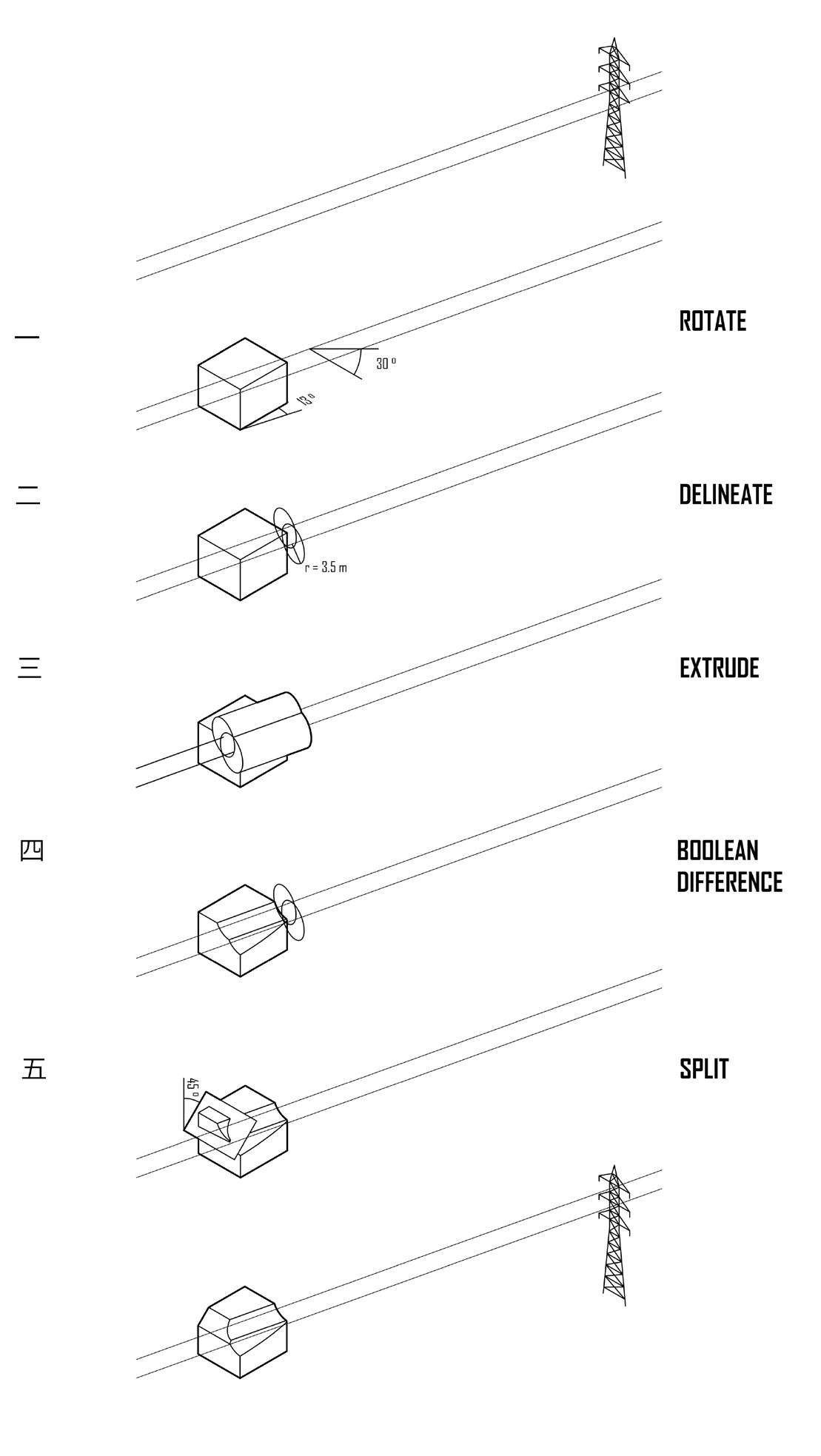 Studying a single-family house illustrates the underlying codes that govern its formation. A series of diagrams are rendered to show the fundamental elements of the house under high voltage by Kazuo Shinohara, completed in 1981 in Tokyo, Japan. The project is an archetypal example of a single-family house formed by navigating the in-between gaps of free space in the clustered and dense chaotic cityscape. Positioned beneath high-voltage power lines, the house is compelled to adapt its traditional facade, program, and structure.