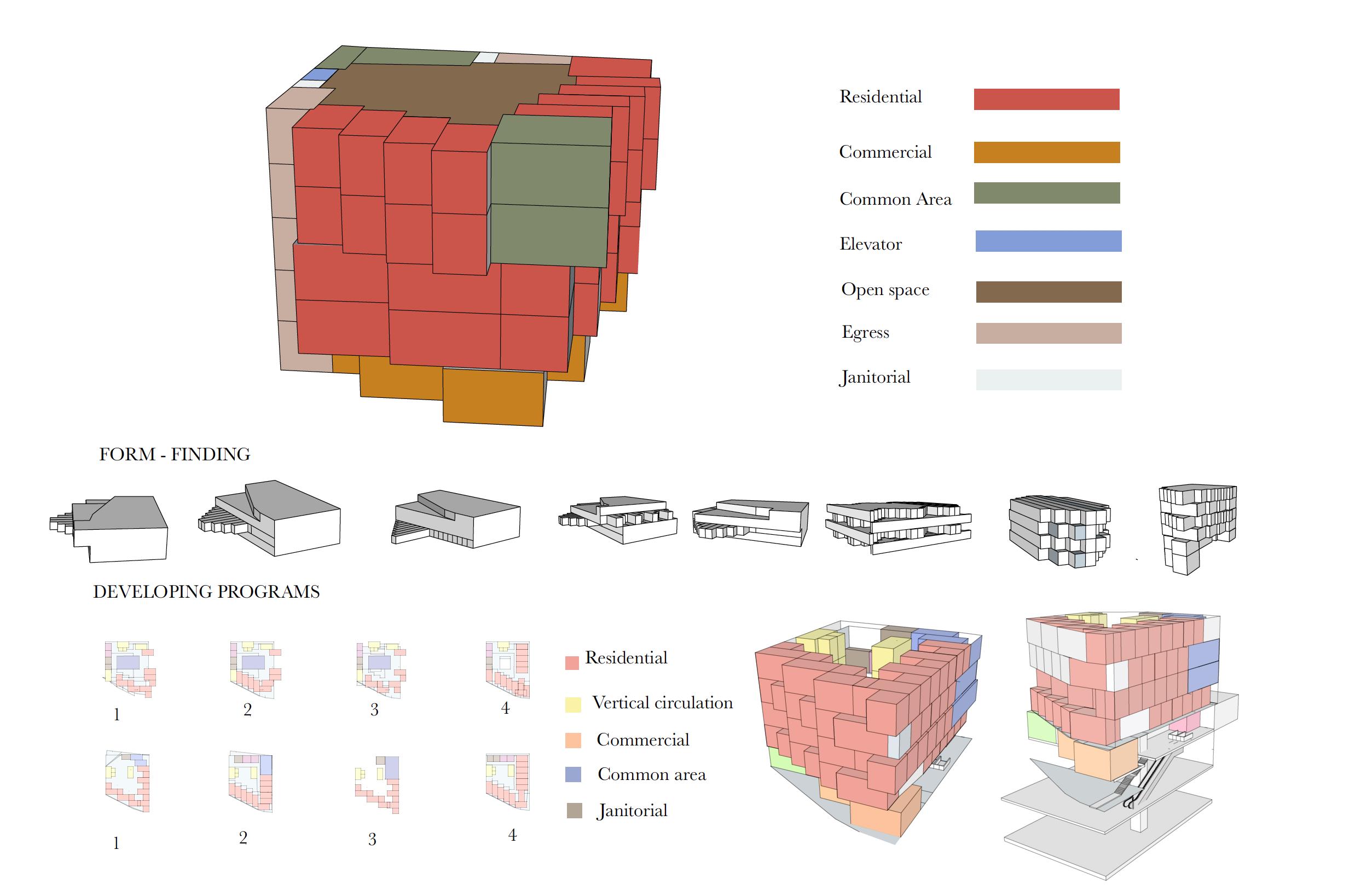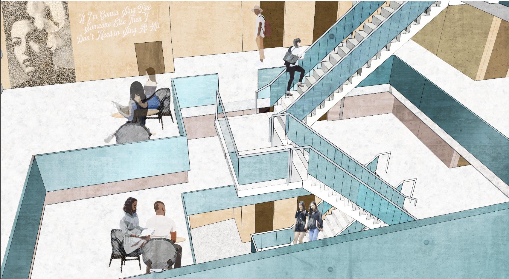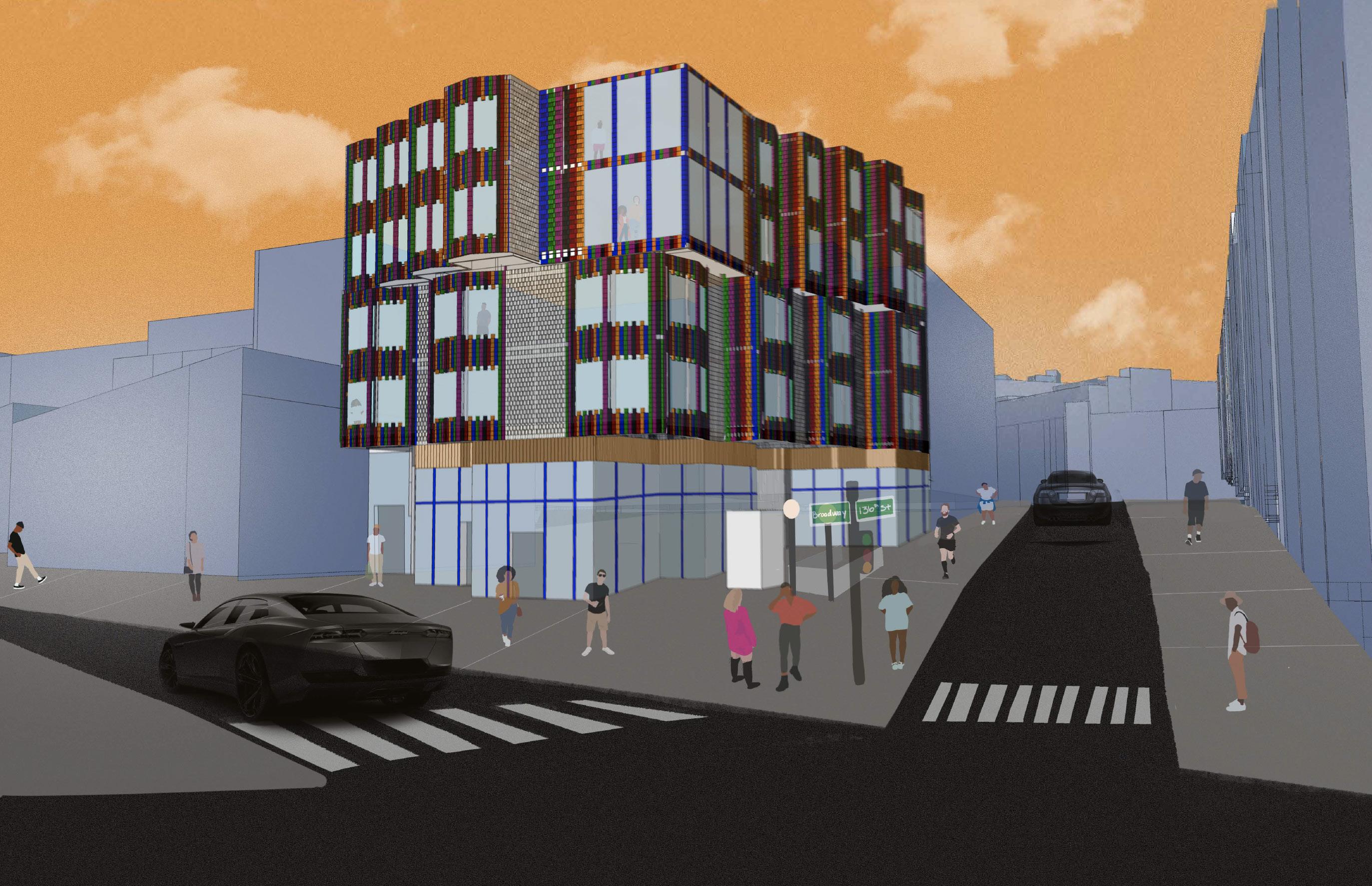 building meant to house college students at CUNY.Throughout this project, we used the aesthetic as well as the programming of our building to pay homage to the spirit of the Harlem Renaissance.We incorporated more access to the existing subway train. Our ground floor also contains retail like a thrift store and food pantry and rentable office space. We also had multiple floor plan options for various student needs.We let the shape of our apartments influnece the shape of our builidng.