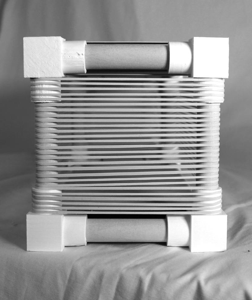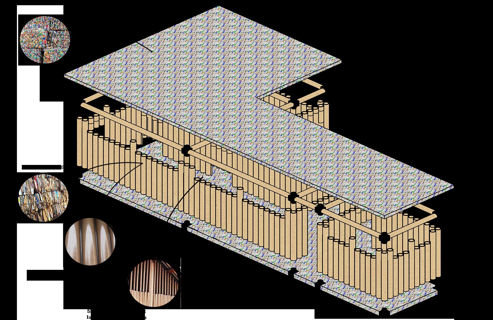 Temporary Homeless Shelter and Modular Shelter Pods, We were heavily influenced by Shiguru bans use of cardboard in his shelters to use recycled materials for our building. We wanted to domore then offer a temporary bed and decided to design supplementary shelter pods. We imagined that the collapsibility and materiality of these pods would allow them to be recreated and reformed around the city to other shelters as needed. These spaces would contain storage for basic hygiene and food supplies as well as host group seminars and counseling to guide people on how to obtain more permanent housing options. When the permanent shelter building is not in use it would double as a community center in the park.