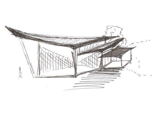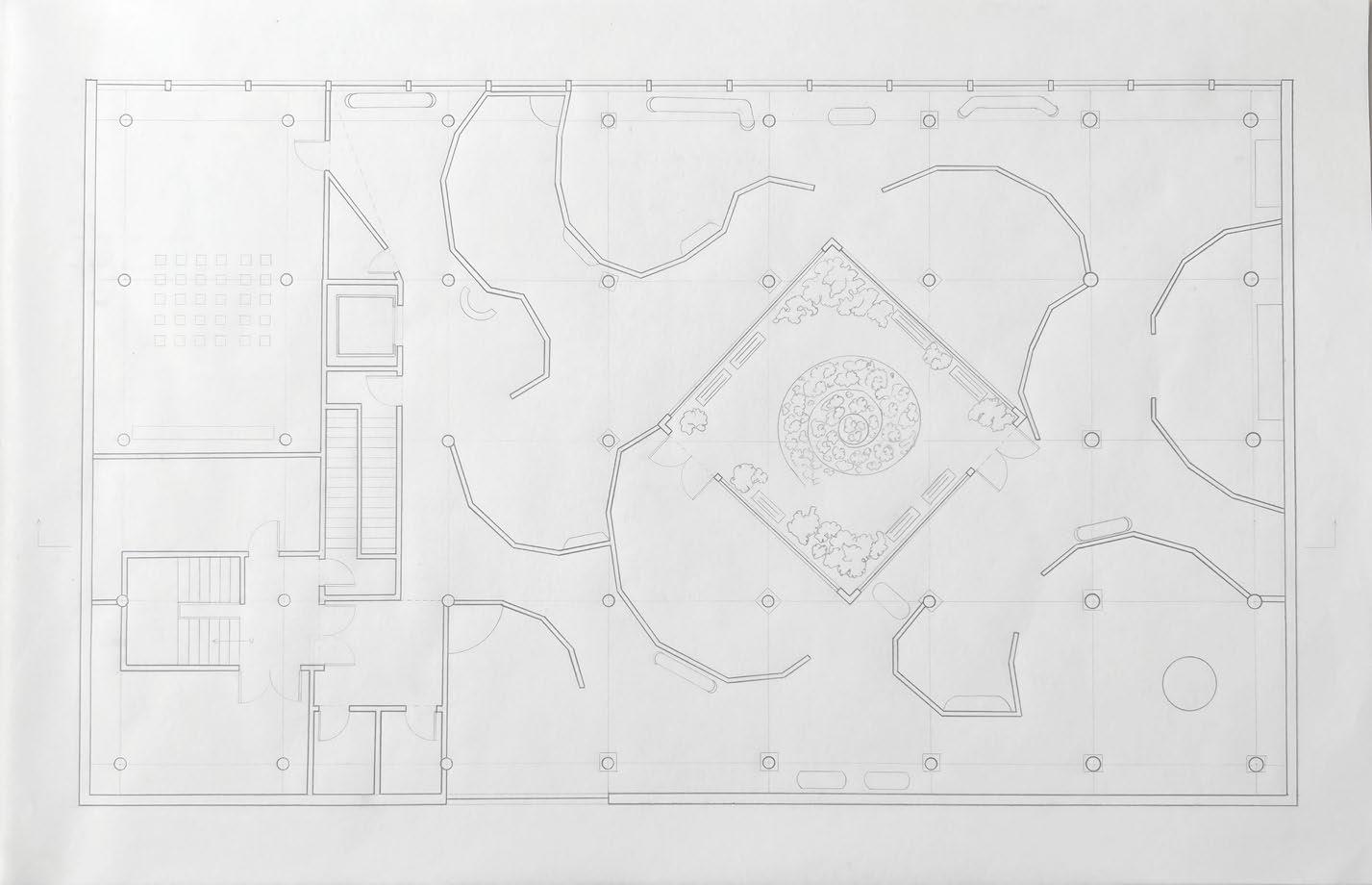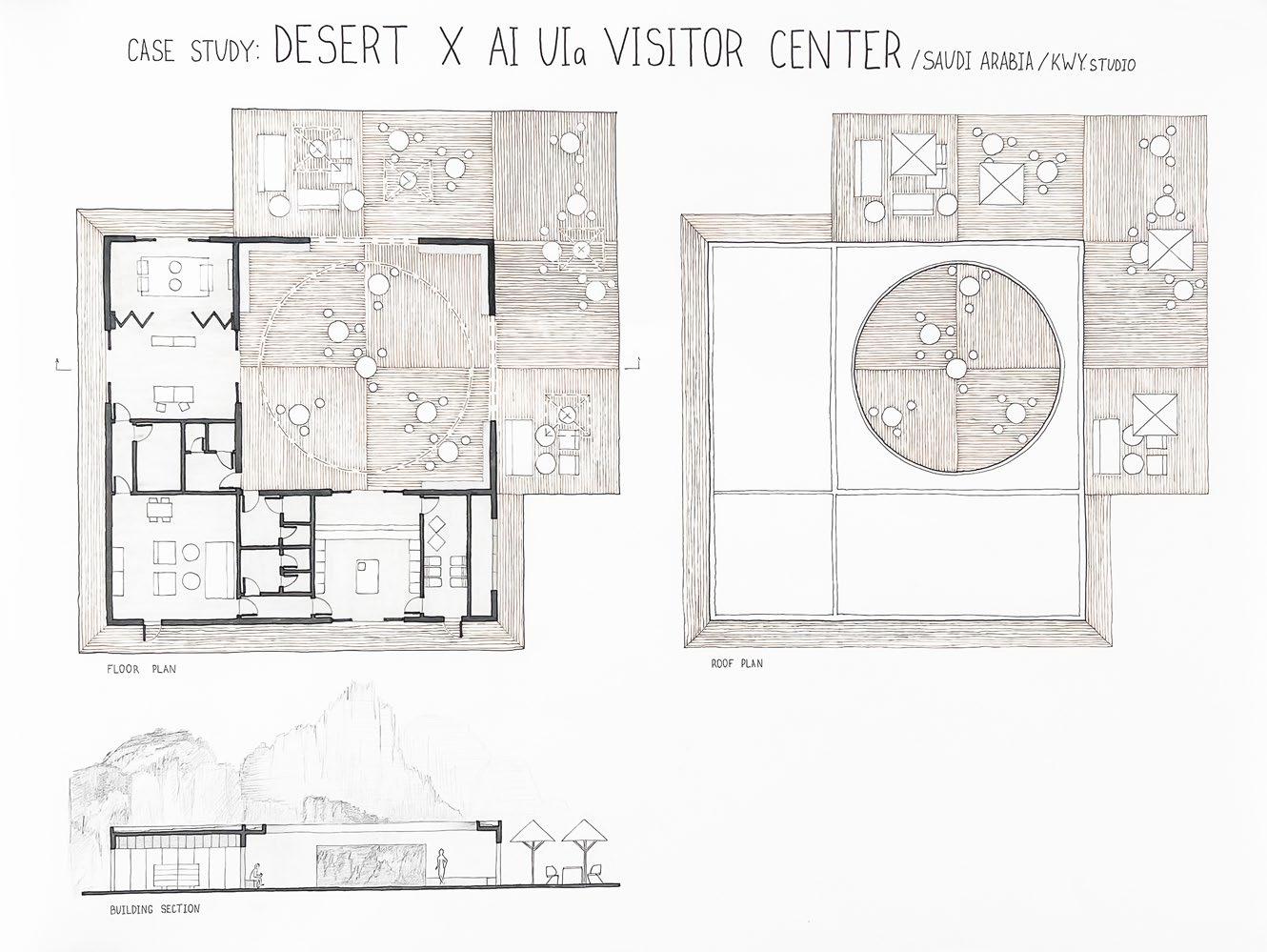 Response: I hand-drawn the floor plan, the roof plan, and the Desert Center section, taking into account the line weight. Then I drew a 3D model in SketchUp and redrawn the exterior and interior views of the building. With the help of colored markers, I rendered the images to achieve the best visual effect.