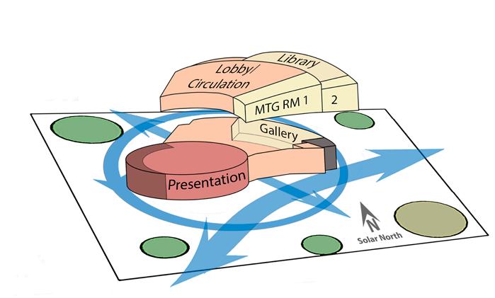 Response: My design of the Center for Conversation was created to unite people of different generations, backgrounds, and viewpoints by creating a welcoming atmosphere that encourages open communication. It is located near a local church and university, and is surrounded by residential and commercial buildings, appealing to a diverse audience. The Center’s organic shapes symbolize the “smoothing of sharp corners,” which sometimes exist between people and inhibit open dialog. The circular Presentation Room is the largest space in the building. It references the round table at which the knights of the Middle Ages gathered, discussed, and solved problems on equal terms- searching for common ground. This idea is designed to create an atmosphere of equality in the weight of everyone’s voice. The building’s organic forms continue throughout the exterior site forms, giving a smooth flow of movement both inside and out. A large open Outdoor Space in front of the building promotes community events that bring people together. A Playground is located at the northwest corner of the site for visitors with children, encouraging communication and play for the youngest generation. There are also three more secluded seating areas for smaller groups of people. A bike path and storage encourage cyclists to visit this beautiful community center as well.