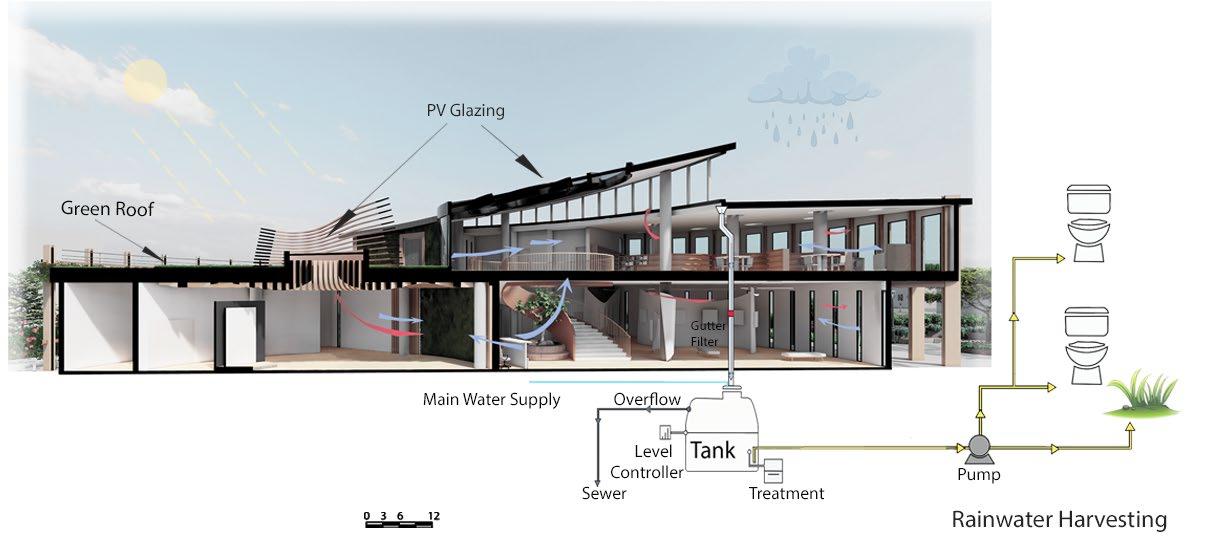 The building has two large PV glazing skylights providing an additional source of electricity. Light fixtures utilize LED lamps, which saves energy consumption. Exterior horizontal sculptural wood shelves reduce direct sun on the Presentation Room’s windows. Additional room cooling is provided by green walls and a green roof. The green walls help to purify the air, which is of particular importance when hosting large events. The floor covering is made of engineered board, which is an improved “analogue” of a natural wood and encourage more sustainable use of this resource.