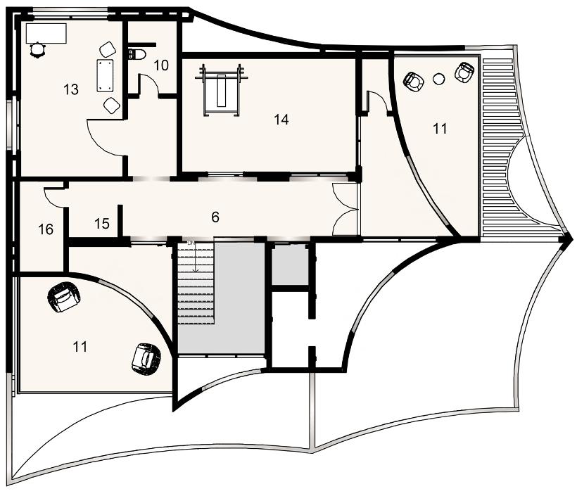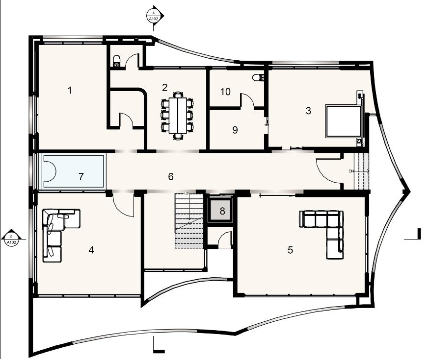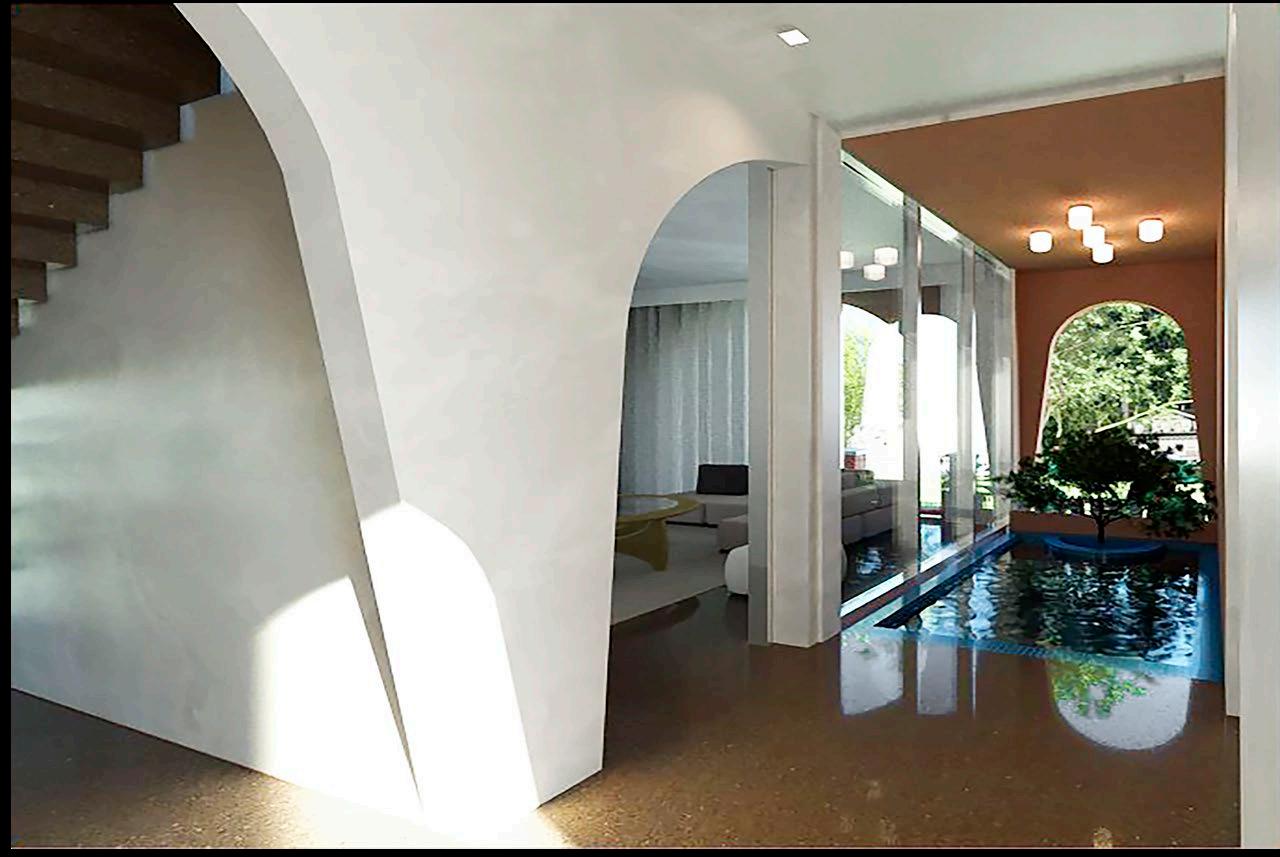 Response: To create the design, I analyzed one of Robert Venturi’s early works, The Mother’s House, the main architectural aspects of which formed the basis for my design. I tried to convey the complexity and inconsistency of the lines of the roof and ceiling. The roof design was inspired by the complex shape of the staircase in the Venturi house, the contours of which I conveyed in the form of a glass central part of the roof; reflect these lines on the floor using marble tiles (one of the materials in the mother’s house). Symmetry is conveyed in the design of both facades. The terrace has no roof and is a green area. The door to the terrace has been enlarged to show Venturi’s playing on a larger scale. The arched elements used in the library’s furniture embody the symbolism inherent in Venturi’s work. The glass roof is equipped with motorized sunshade sheets, which can completely protect the room from the hot summer sun.