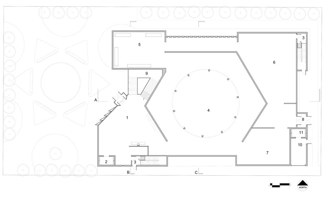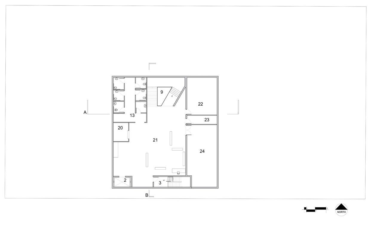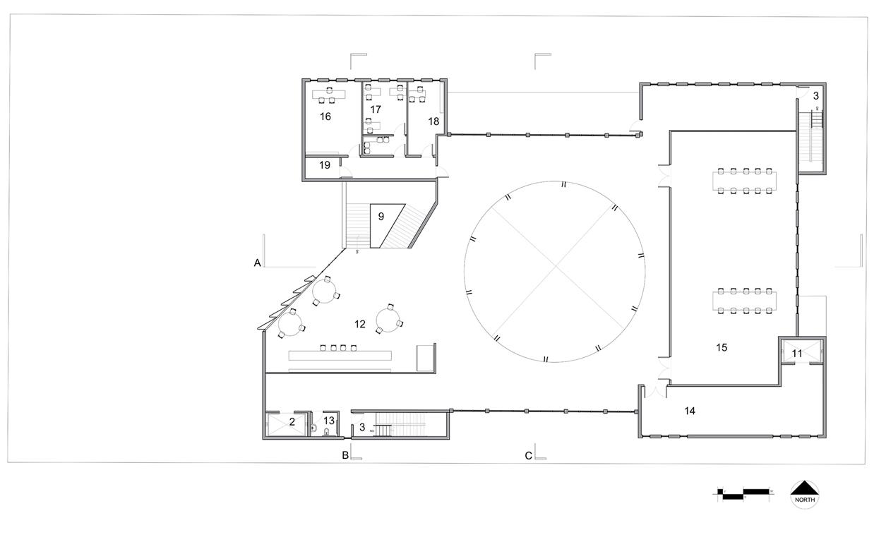 The beautiful Spiral Staircase invites visitors to the second floor, where the Library and two small Meeting Rooms are located. This arrangement protects from noisy events below, allowing for quieter learning and privacy. The second floor offers a magnificent view of the church and surrounding area. In addition, the library has columns capped with light, giving the impression of infinite columns. The second floor can also be accessed from an exterior stair, which leads to a courtyard and green roof.