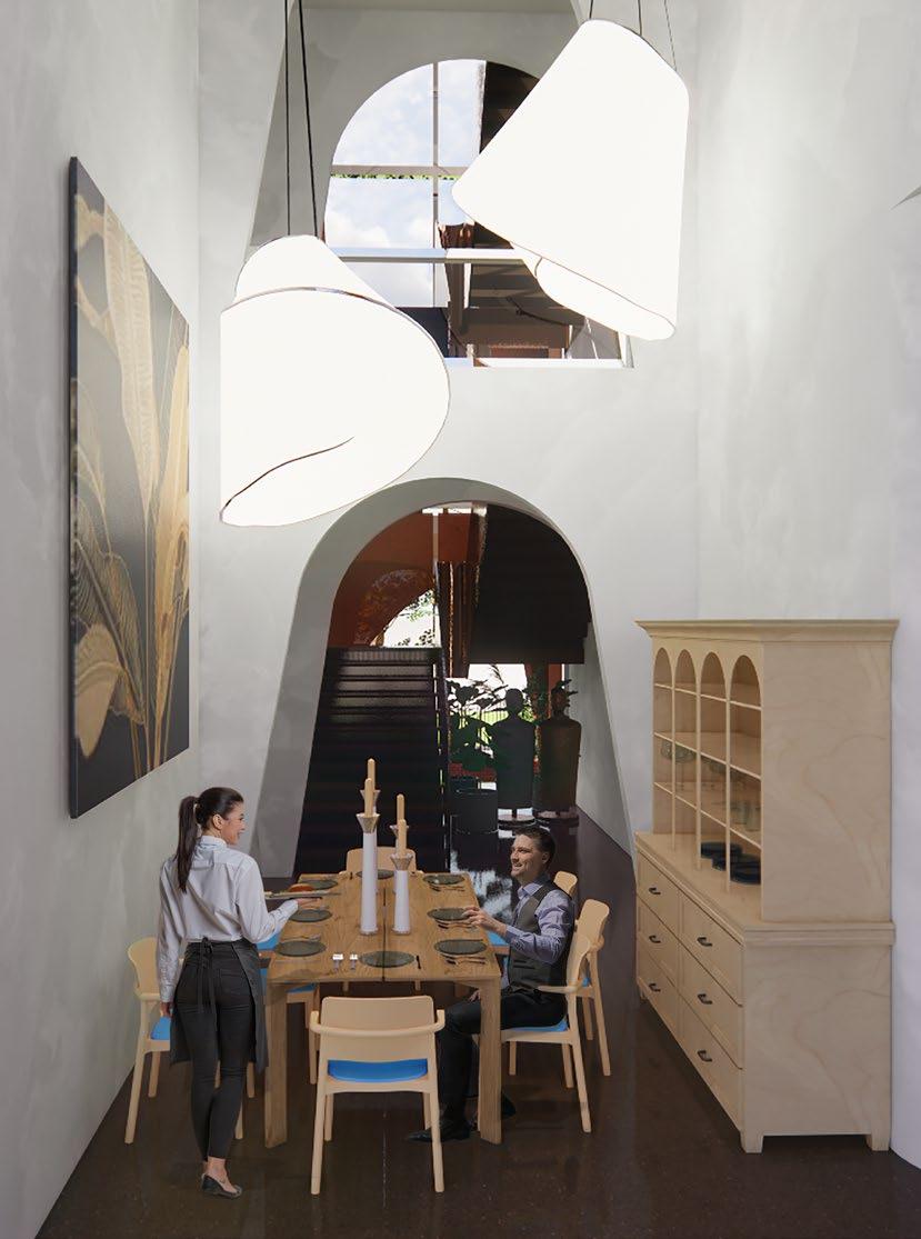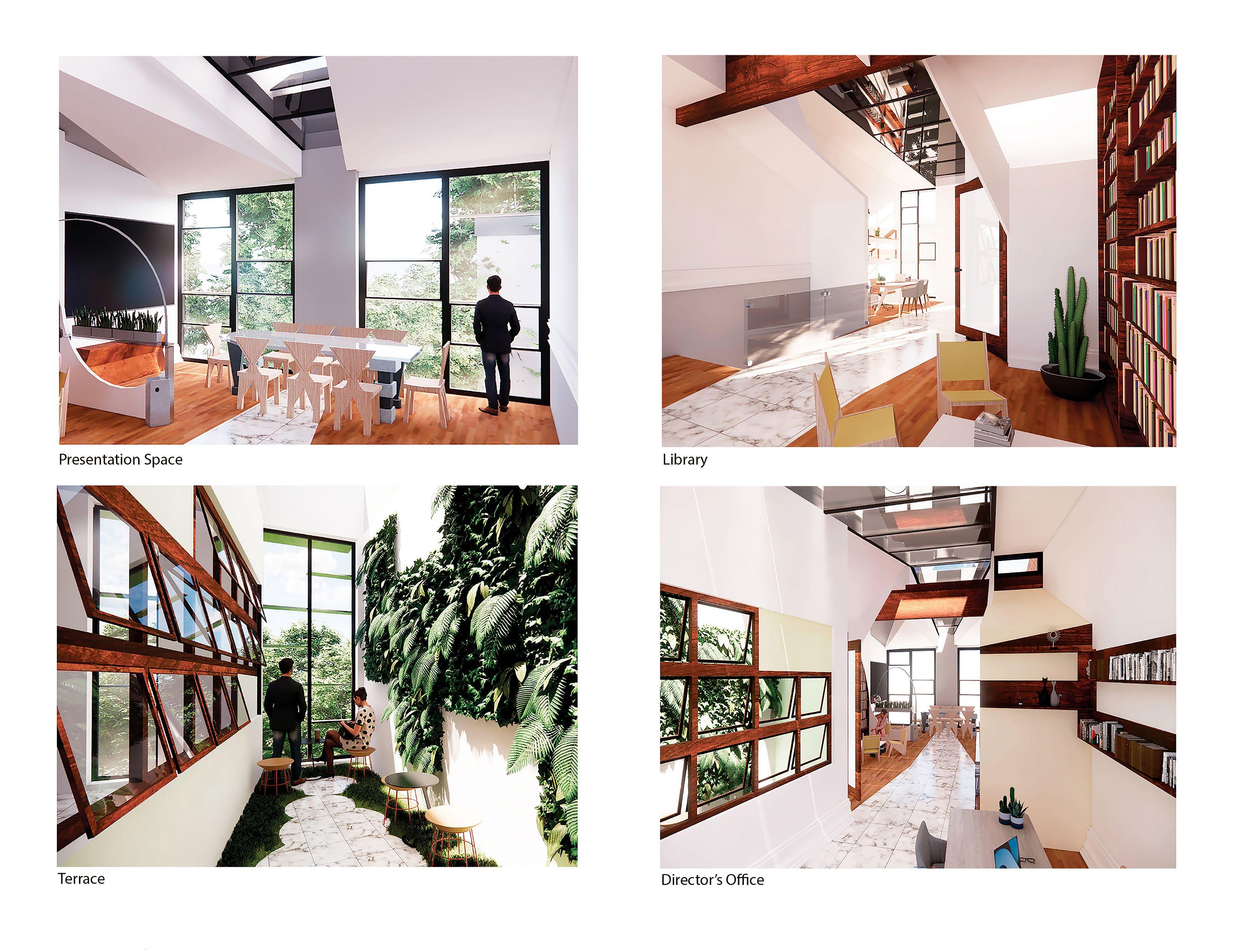 Challenge: A new architecture museum is planned to open in Philadelphia, funded by the families of Frank Furness, Louis Kahn and Robert Venturi. A damaged three-story townhouse in which a fire destroyed the third floor was purchased for the museum. It will be the architects’ artifacts on the second floor, rotating exhibitions on the entrance floor. The director’s office and conference room are located on the new third floor area and library room for books, as well as a south-facing terrace. The space was inspired by Robert Venturi’s mother’s house.