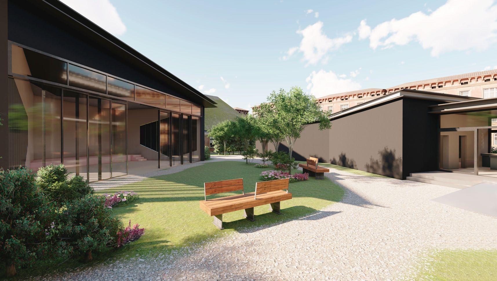 Response: I created several one-story buildings by separating the public space, which includes the library and gallery, and the private space, which is the office. The performance room is located in a separate building, with the possibility of holding events both indoors and outdoors. The garden is organized as a quiet public place where you can retire from the hustle and bustle of the city, overlooking the old church. The shape of the building makes it stand out from the background of the square buildings around and should attract the attention of visitors. The design of the roof gives the impression of a weightless/floating roof. The windows are decorated with pieces of multi-colored glass, which create beautiful illumination of the premises, and serve as additional protection from direct sunlight. During this project, I learned how to work with spaces both inside and outside the building.
