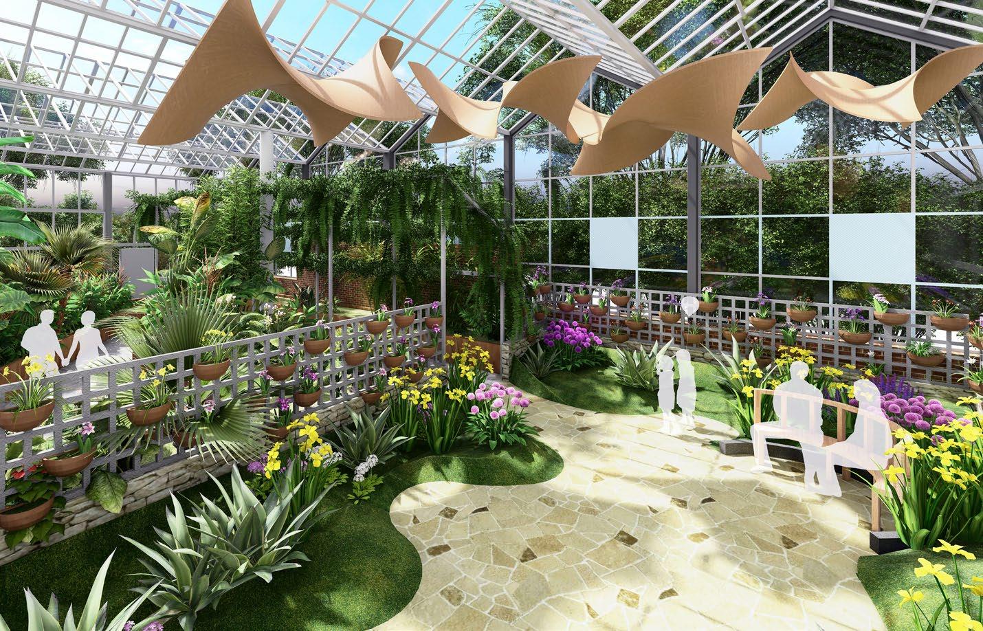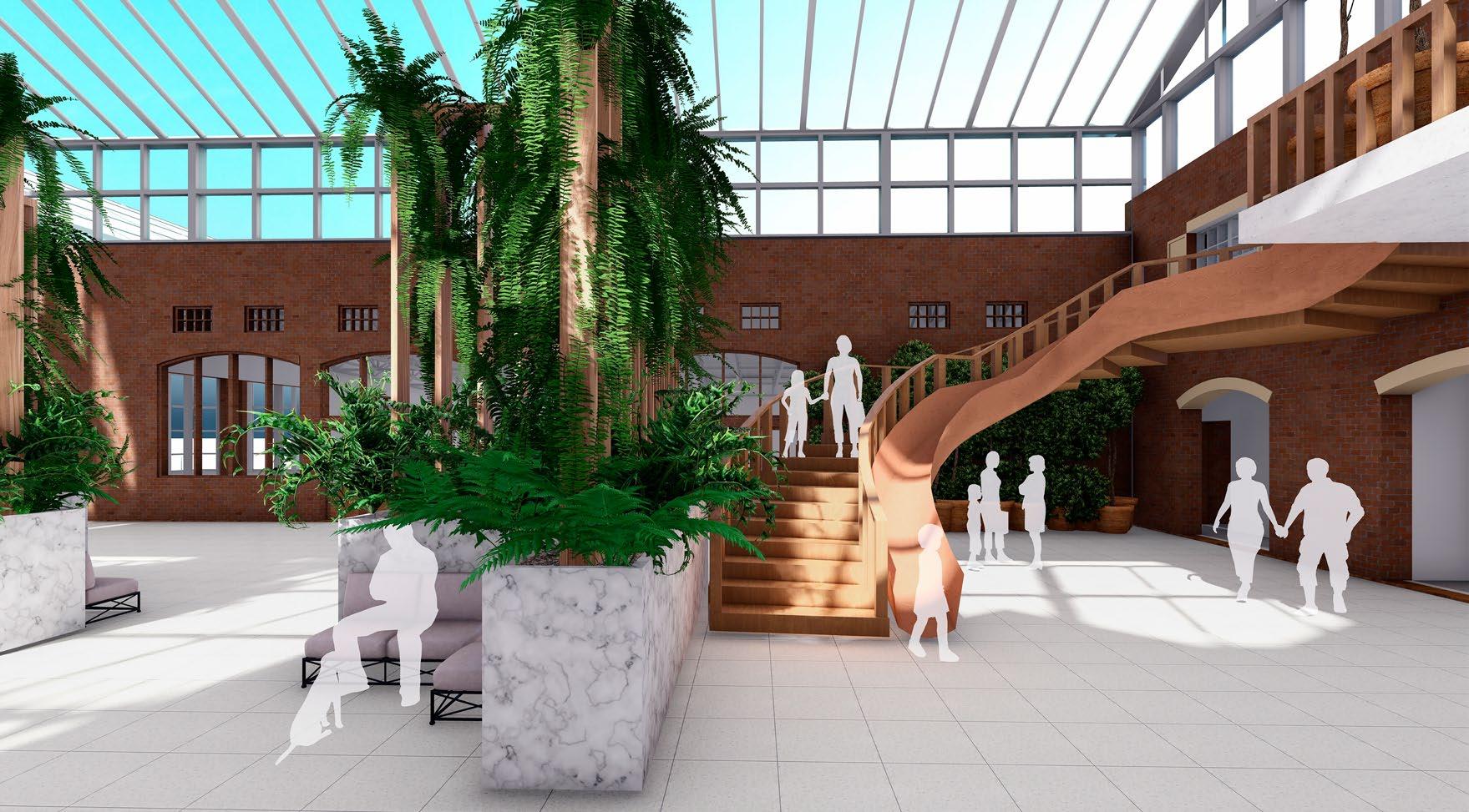 Response: To complete the task, we were divided into groups in which we drew a floor plan in AutoCAD together, and then in groups we drew a 3D model of the building in SketchUp. Having put together the model, each of us began to work on creating our own garden design in one of the parts of the building. I chose an indoor garden in which I placed a tropical garden and an orchid garden. I have chosen a formal style for the layout of my gardens, with a water flower pond in the center, with a bridge across it. The area is provided with several seating areas and a vertical structure for hanging and creeping plants over the walkways around the garden’s perimeter, creating a green tunnel. Decorative elements symbolizing birds are attached to the ceiling. The children’s garden is located on the mezzanine, accessed by a circular staircase with a slide for children along the inner radius. Rendering done with Lumion and Photoshop.
