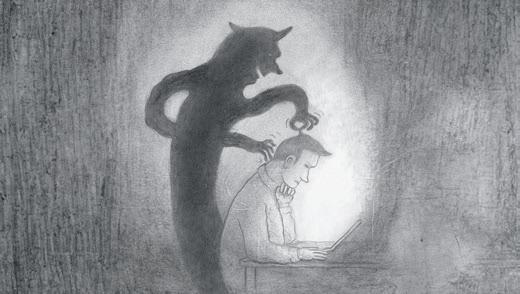Mannen är helt uppslukad av sin dator. Skuggan blir alltmer otålig. Skuggan gäspar och gestikulerar, ja, killar till och med mannen i nacken. Men han får ingen som helst reaktion. När Skuggan uppgivet tittar ut genom fönstret ser han hur en balkongdörr öppnas på huset mittemot. Mystisk och vacker musik strömmar ut. Skuggan drar sig försiktigt loss från mannen, öppnar fönstret och klättrar ut …