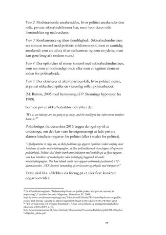 Fase 2: Modstræbende anerkendelse, hvor politiet anerkender den rolle, private sikkerhedsfirmaer har, men hvor deres rolle formindskes og nedvurderes. Fase 3: Konkurrence og åben fjendtlighed. Sikkerhedsindustrien ses som en trussel mod politiets voldsmonopol, men er samtidig anerkendt som en udvej til en senkarriere og som en ydelse, man kan gøre brug af i nødens stund. Fase 4: Der opfordres til større kontrol med sikkerhedsindustrien, som ses som et nødvendigt onde eller som et legitimt element inden for politiarbejde. Fase 5: Der eksisterer et aktivt partnerskab, hvor politiet indser, at privat sikkerhed spiller en væsentlig rolle i politiarbejdet. (M. Button, 2005 med henvisning til P. Stennings hypoteser fra 1989). Som en privat sikkerhedsaktør udtrykker det: ”We as an industry are not going to go away, and the intelligent law enforcement members know it.”80