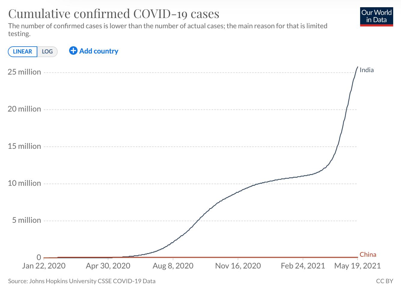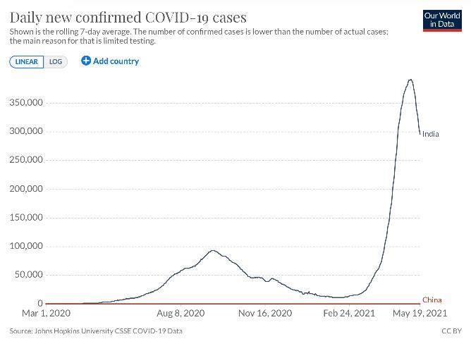 To better answer the question of “What political theory best explains the difference in countries’ success against the COVID-19 pandemic?” I will delve into a most sim ilar case analysis and I will use China and India as my examples. As of May 14, 2021, India has a cumulative confirmed number of 24.37 million COVID-19 cases, and China only has a total of 102,696. Why? What went wrong for India and how did China manage to come out so strong? As mentioned previously, coronavirus cases in China have remained at absurdly low levels since their first lockdown in February of 2020. Their lockdown consisted of school closures, transport bans, and workplace shutdowns, extremely similar to the rest of the world’s response (11). So this could’ve been a ma jor differentiation between the two countries, however, in the beginning, months, India maintained a similar reaction to the pandemic, and their cases never surged much either. The only major spike in India was during August and September when new cases daily reached a high of 92,890 which was nothing at the time compared to the United States which averaged at 221,072 cases per day for over four months (8). India mandated a very similar lockdown as China in the beginning and Prime Minister Modi ordered no one could leave their home for 21 days. This was the first, and at the time, the most severe lockdown implemented (12). Additional similar ities between the two countries include their massive populations. India’s population totals over 1.3 million people and makes up for 17.7% of the world’s popula tion (13) while China remains ahead by just a little bit totaling around 1.4 million people (15). Additionally, the two countries’ health care systems for the most part are public (India being somewhat private), with access to clean medical care before the COVID-19 pandemic. The second wave of coronavirus in India did not be gin until the middle of March 2021. There were a lot of mixed signals coming from the government after the first wave had lessened. The government was attempt ing to enforce vaccines, however, given India’s demo cratic state, they had no way of forcing anything. Sim ilarly, although the message was to “stay home,” just in