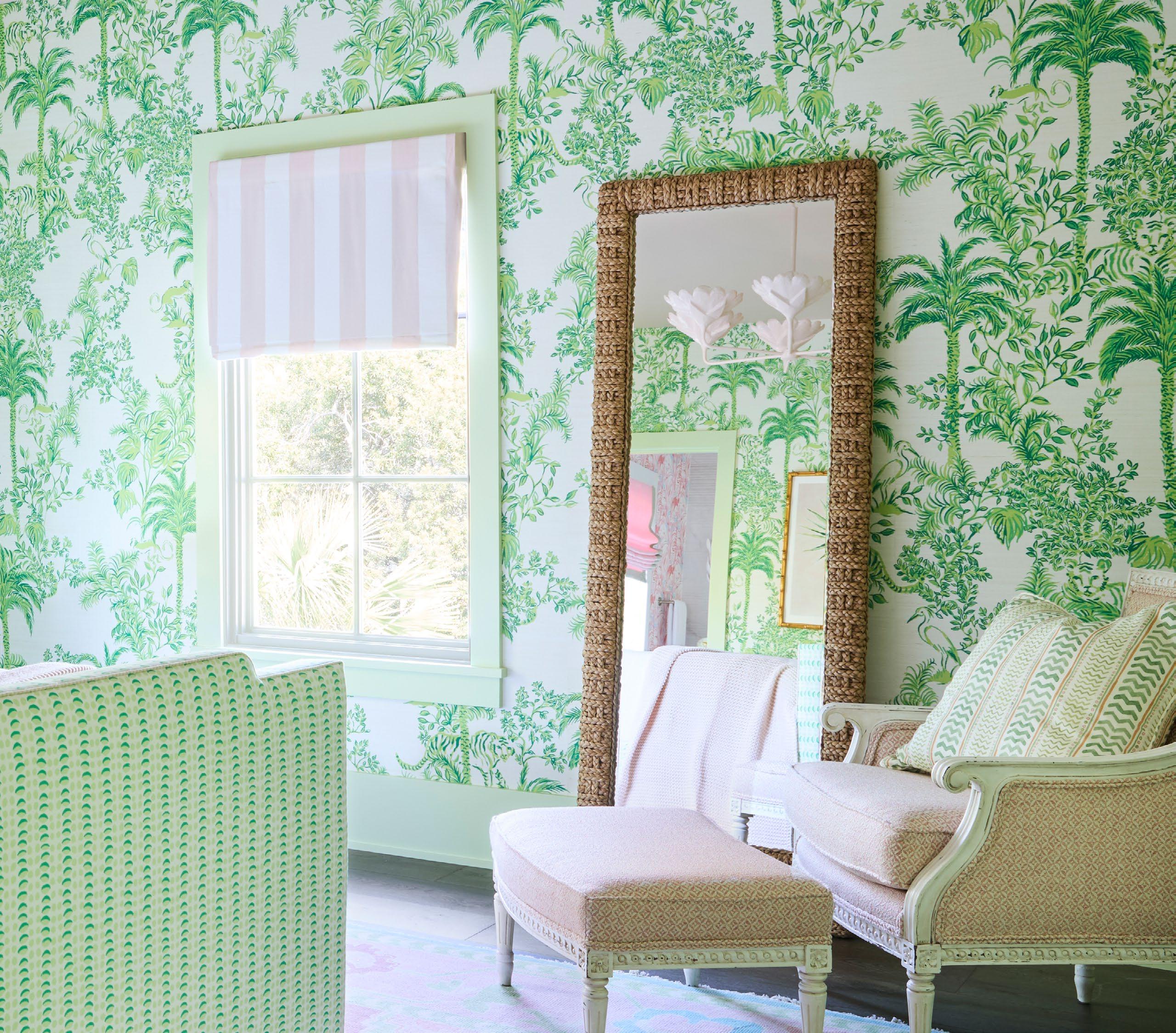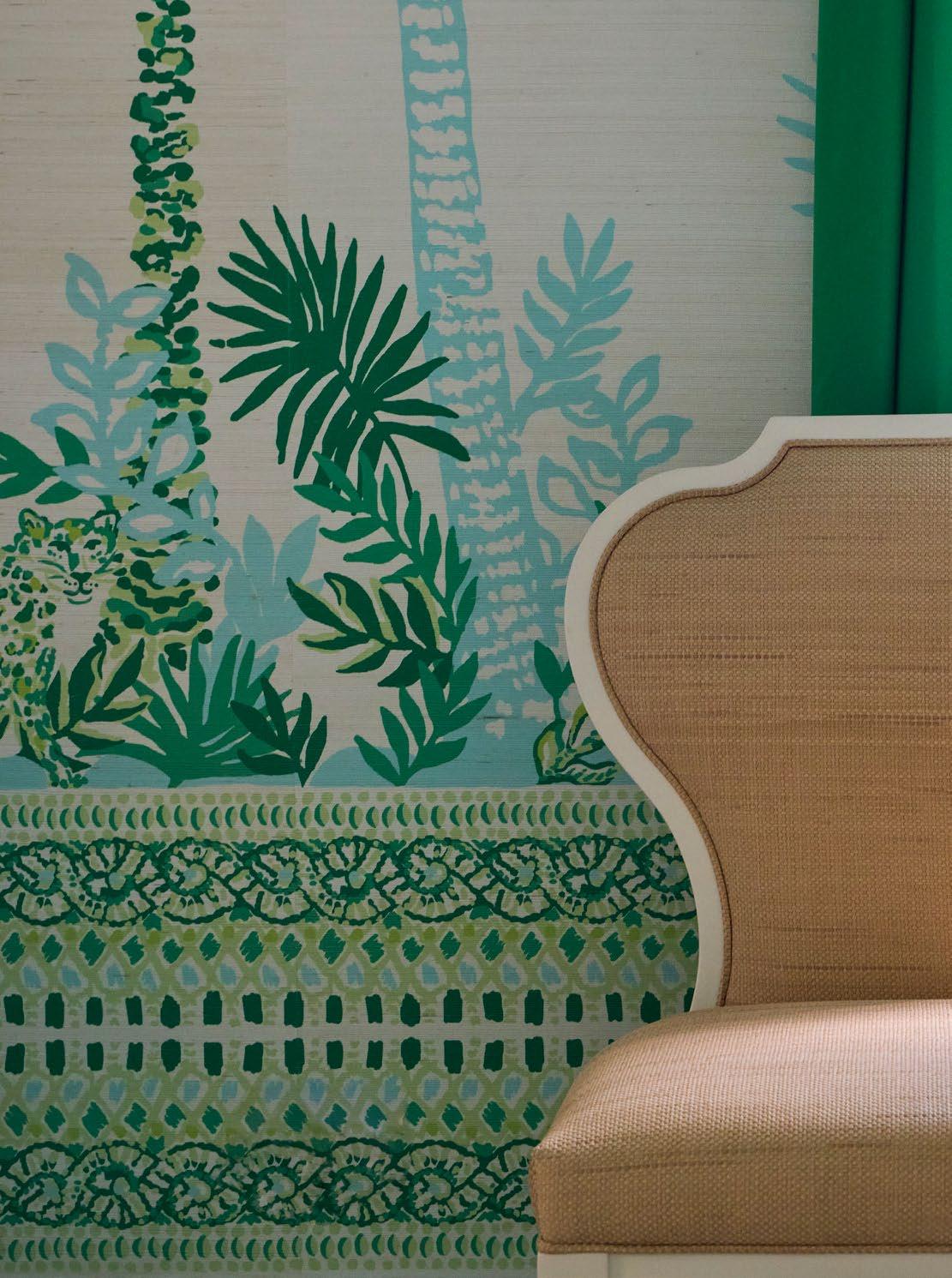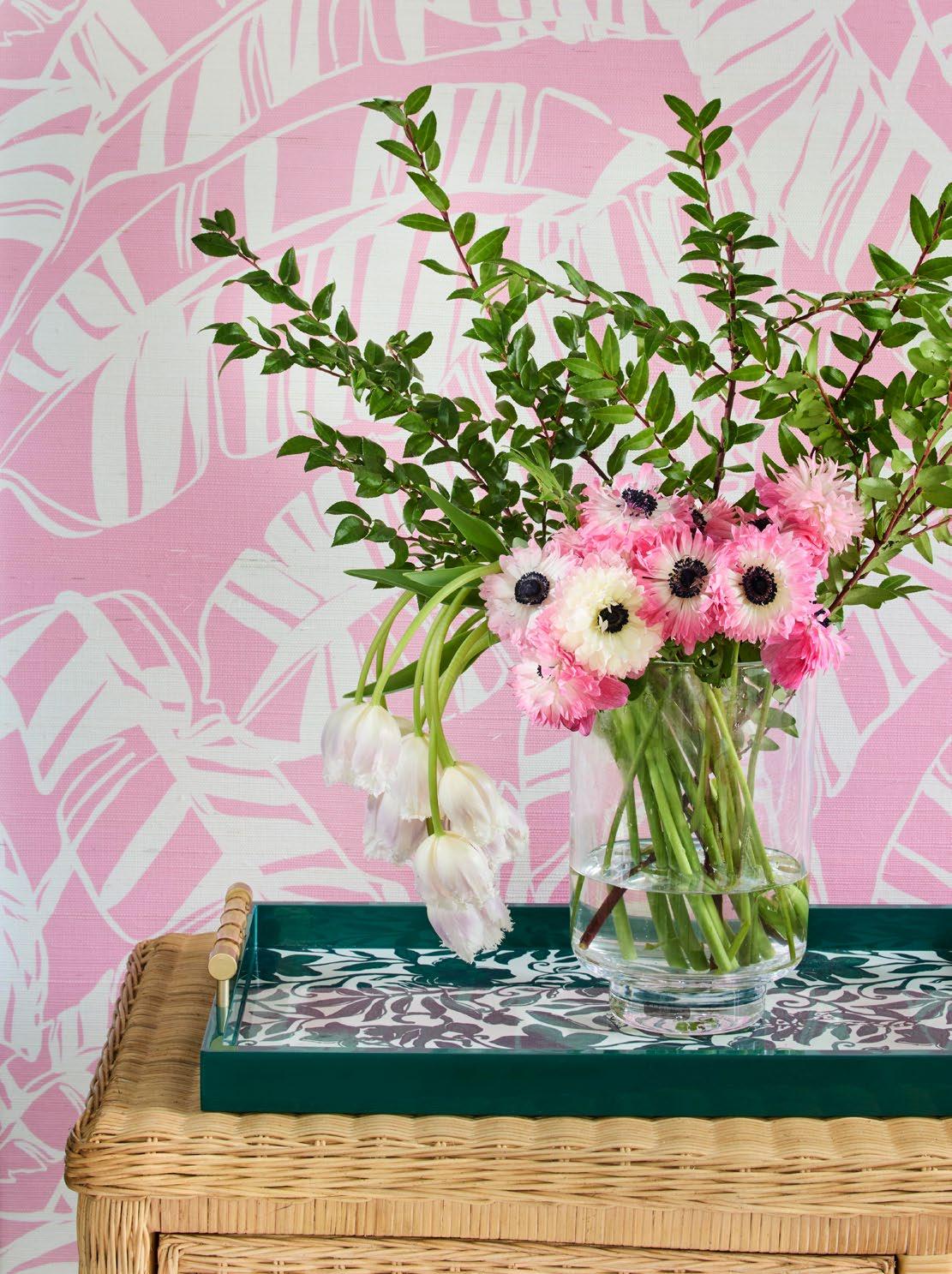 Lilly Pulitzer’s backyard was a Palm Beach jungle full of banana leaves like the painterly fronds of the Go Bananas grasscloth.